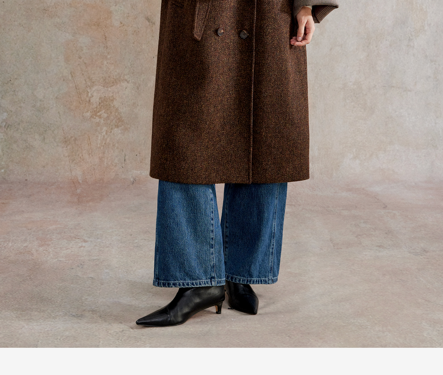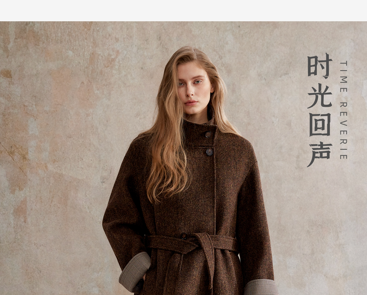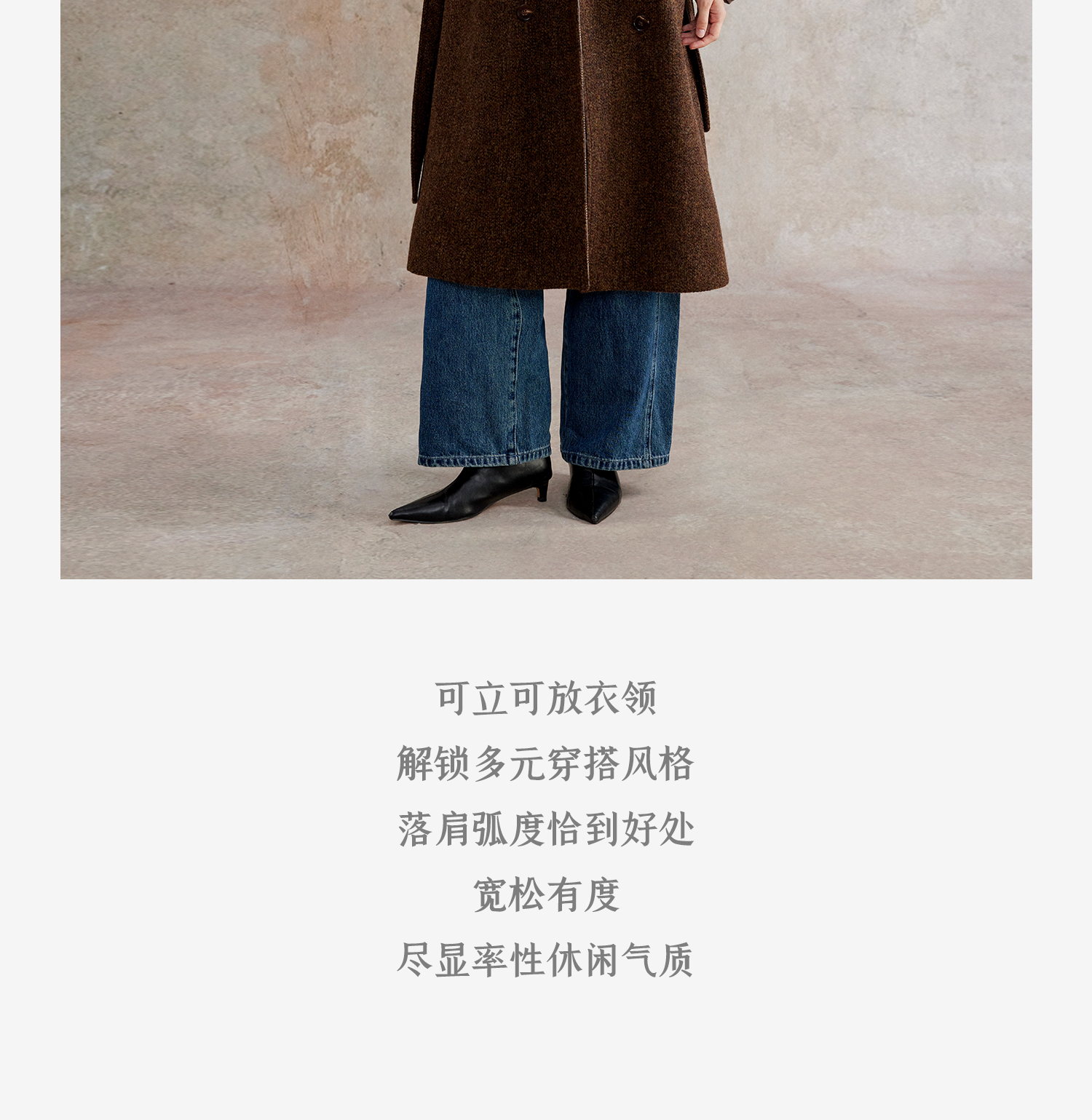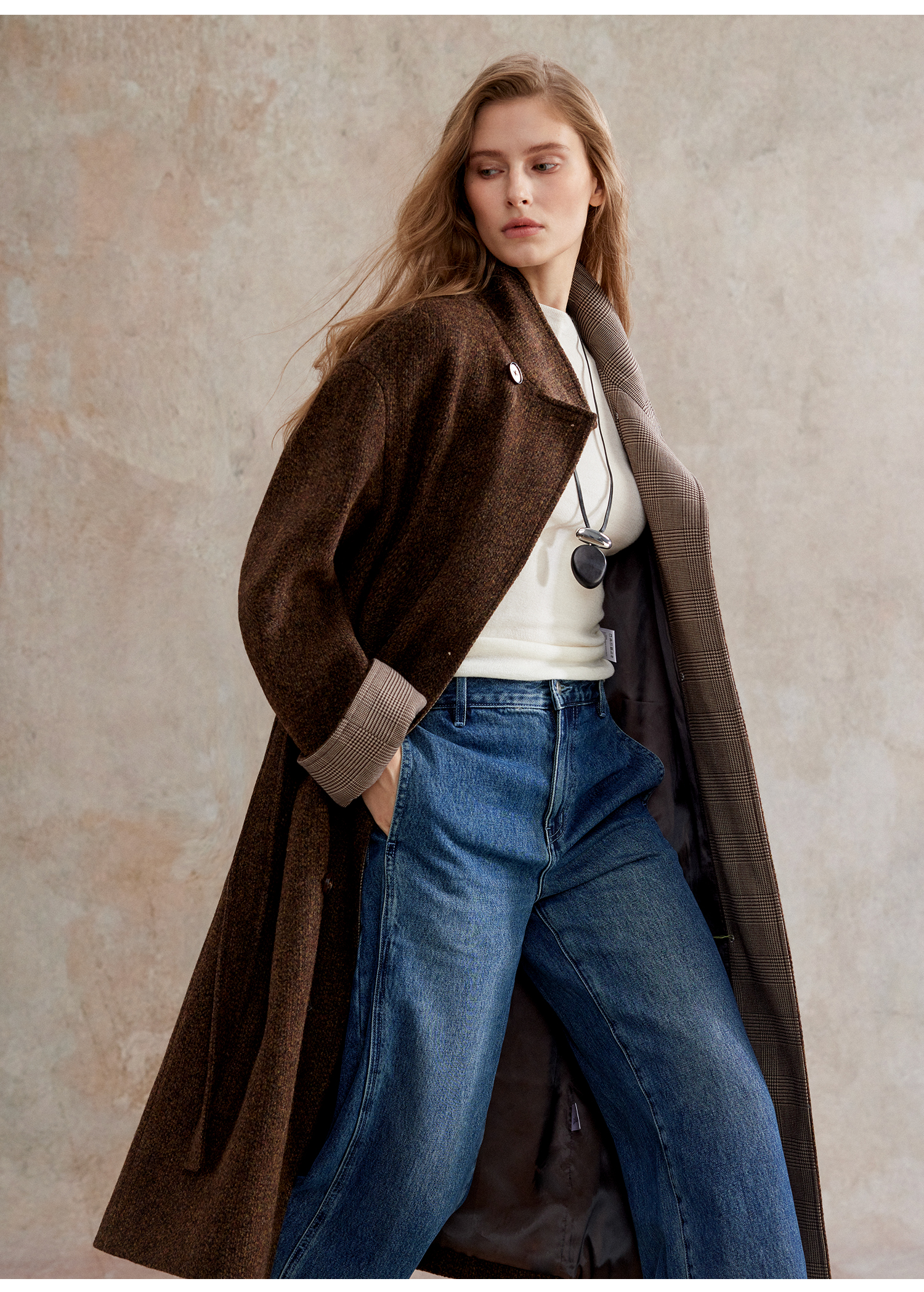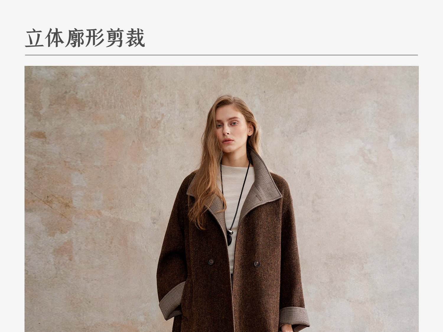 花纱羊毛撞色拼接双排扣长款复古单面毛呢大衣