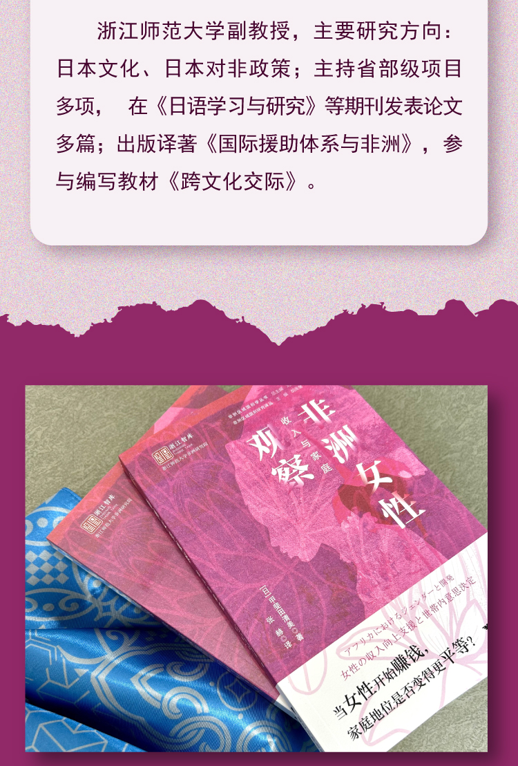 张赫,浙江师范大学副教授,主要研究方向:日本文化、日本对非政策;主持省部级项目多项, 在《日语学习与研究》等期刊发表论文多篇;出版译著《国际援助体系与非洲》,参与编写教材《跨文化交际》。