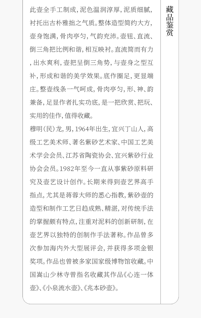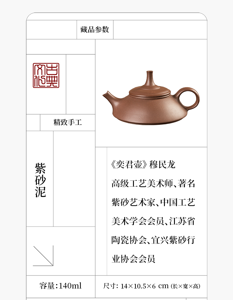 《奕君壶》 穆民龙 高级工艺美术师、著名紫砂艺术家、中国工艺美术学会会员、江苏省陶瓷协会、宜兴紫砂行业协会会员