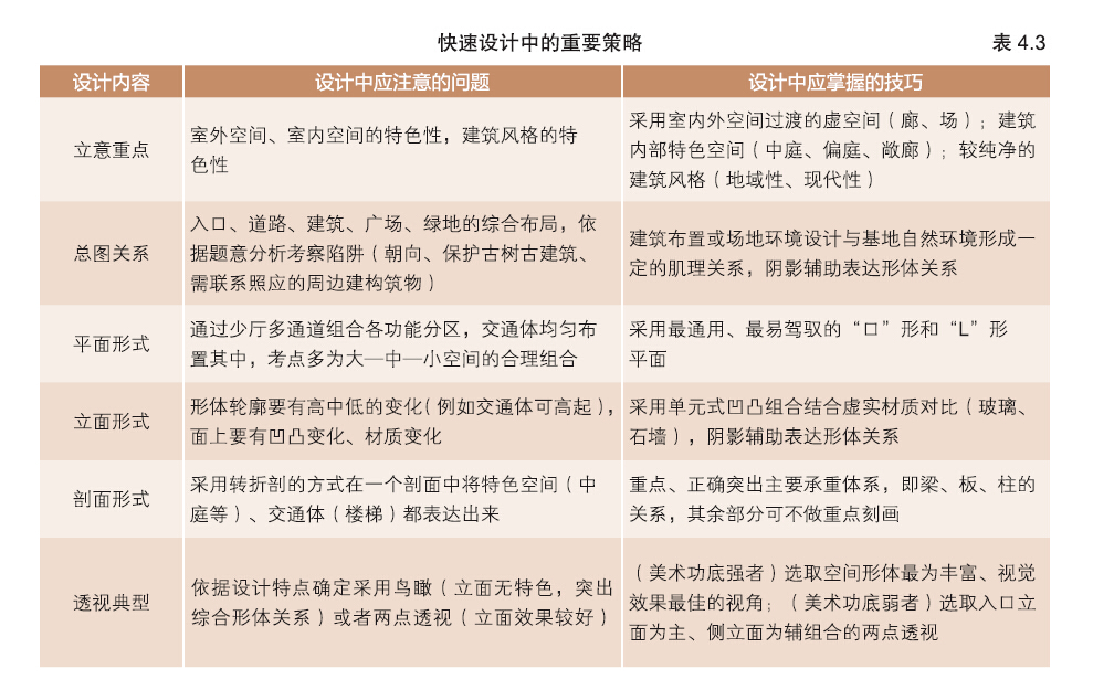 4.针对建筑快速设计的提升策略,从时间安排、方法选择、效果把控、技能集训四层次阶段进行了分析;