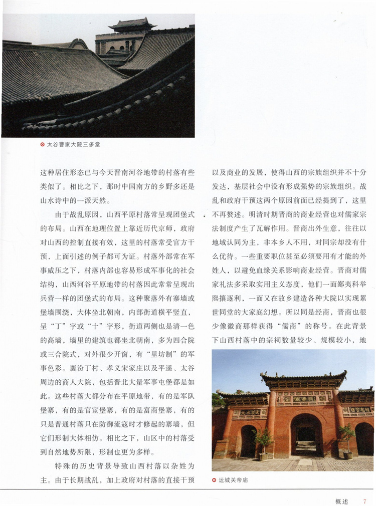本书首先对山西省古村落的总体状况作了概要介绍,然后以单个古村落为单位,用图文结合的方式,对得胜堡村、杀虎口村、老牛湾村、旧县村、大汖村、王化沟村、张家塔村、碛口镇、李家山村、小塔则村等20个古村落(镇)逐一做了较为详细的介绍展示。每个古村落的介绍文字约3000字,以有关村落历史、地域分布、人文特色等方面的客观描述为主,辅以适当的分析和阐释;图版约30幅,以照片为主,也有一些村落分布、房屋结构示意图。古村落代表了当时当地的人们对于自然、生活、社会的认识,涉及到历史文化、宗教哲学、伦理人情、地理气候等各个方面,又是当时建筑与工艺等技术的反映,在建筑学、民俗学、社会学、人类学等多个领域具有深厚意义。