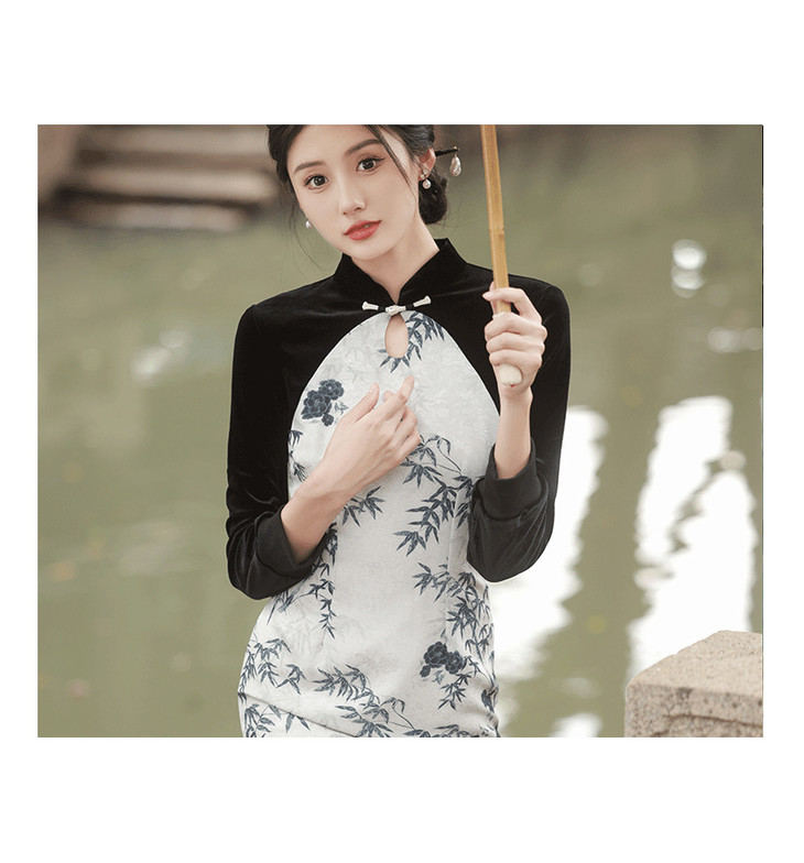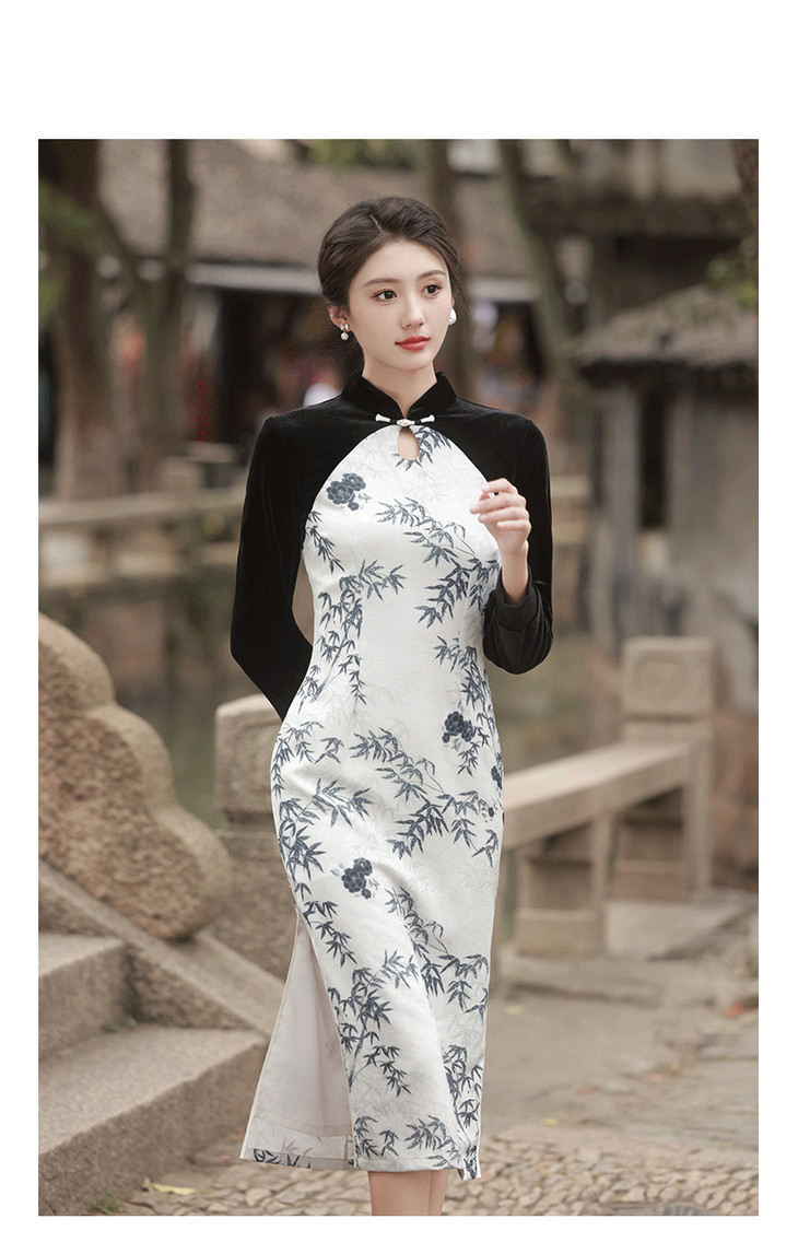新款花罗旗袍连衣裙中长款水滴领双层改良旗袍GR5063