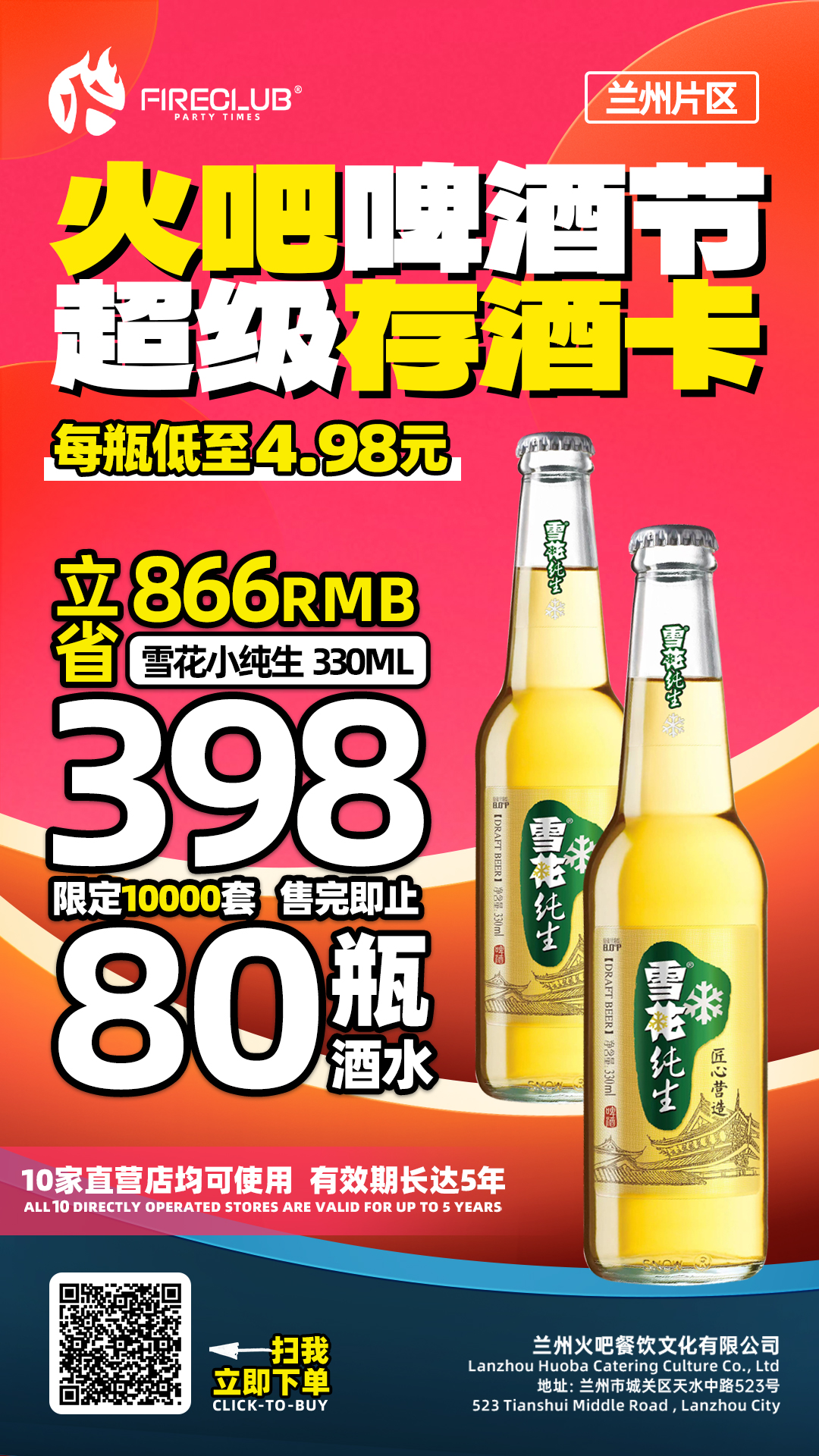 【兰州通用】818火吧啤酒节—超值存酒卡—398元80瓶雪花纯生330ml