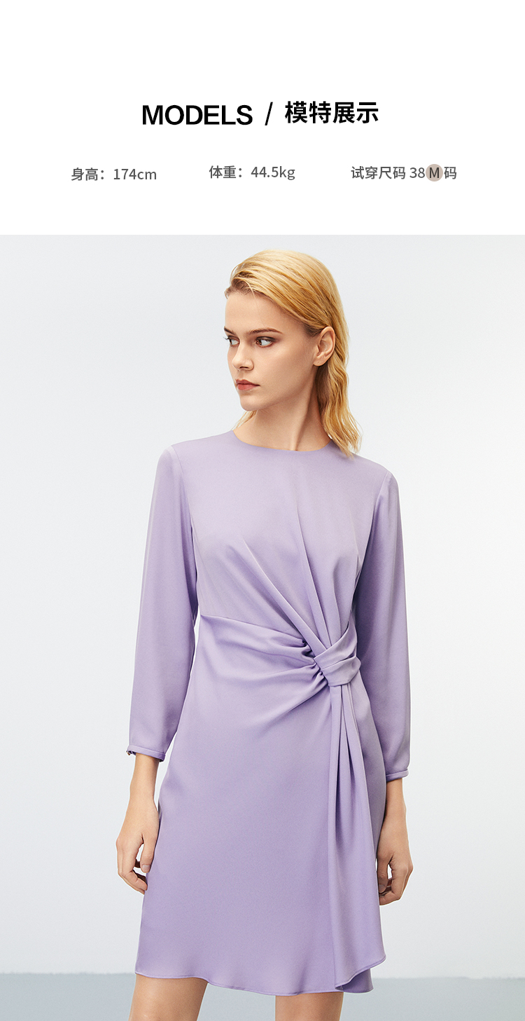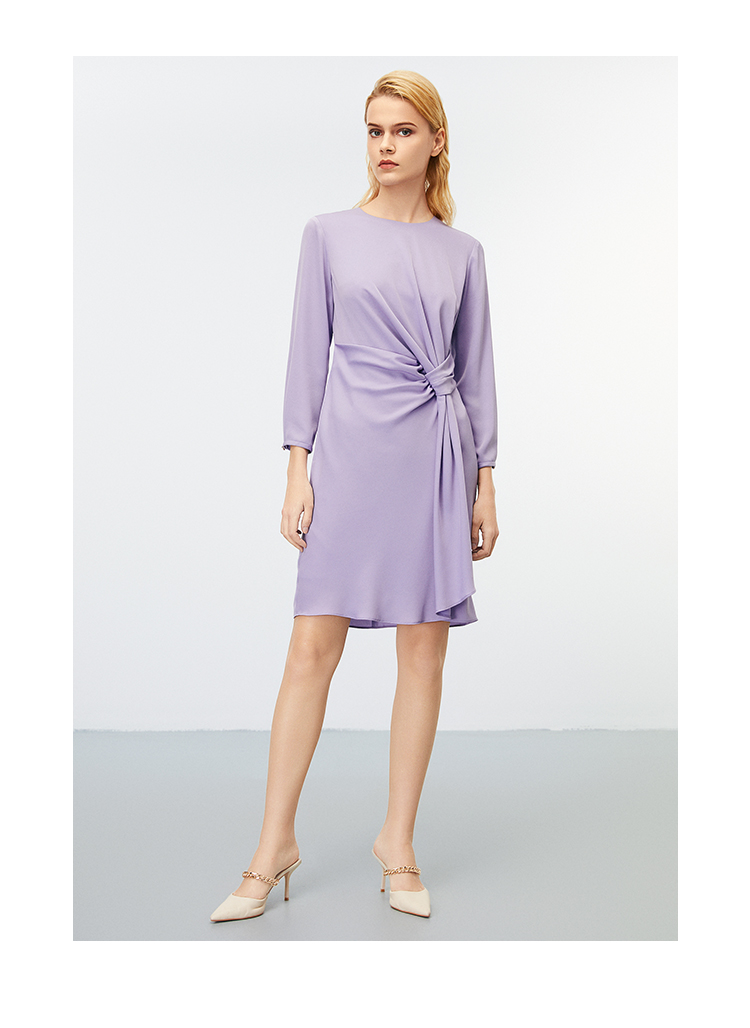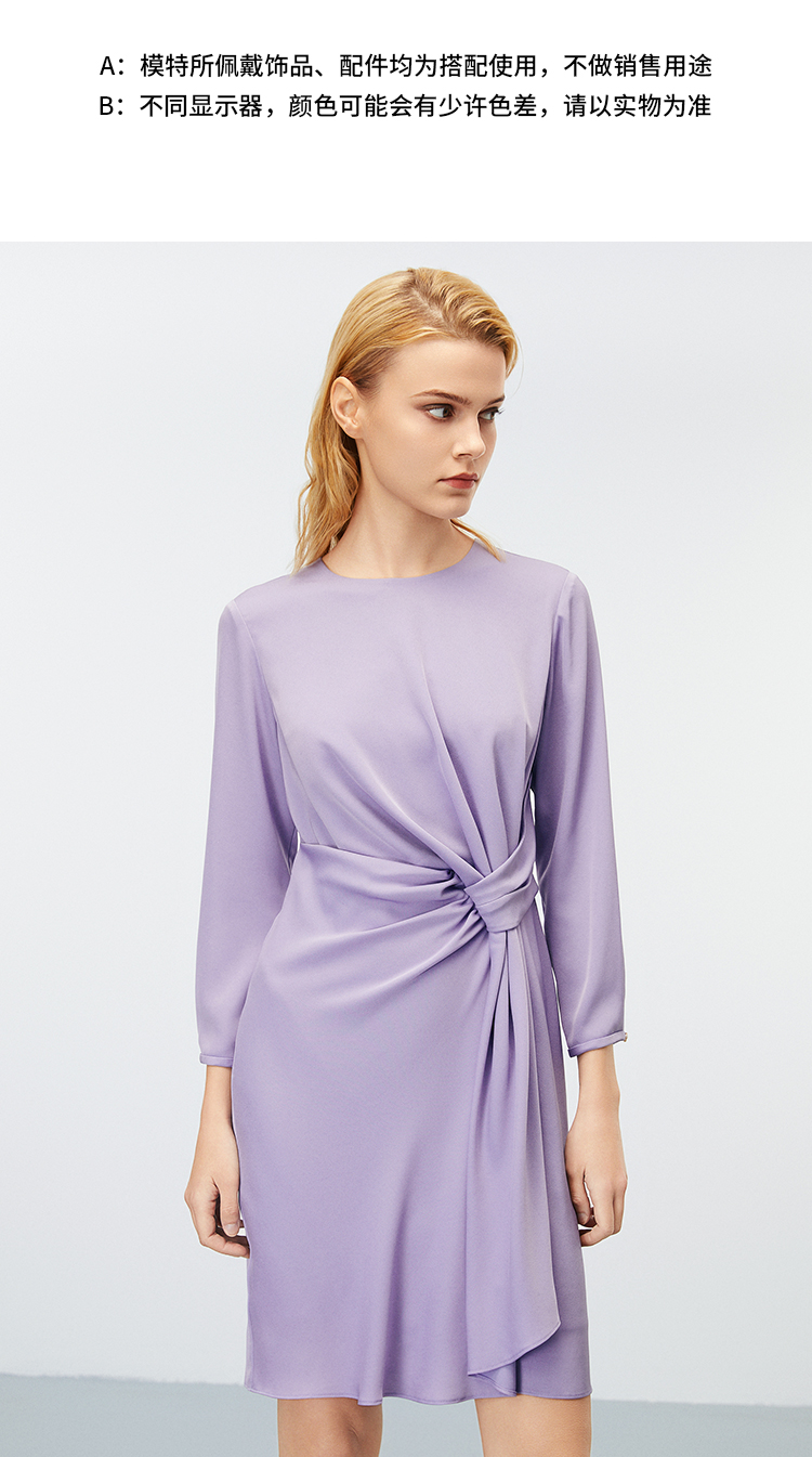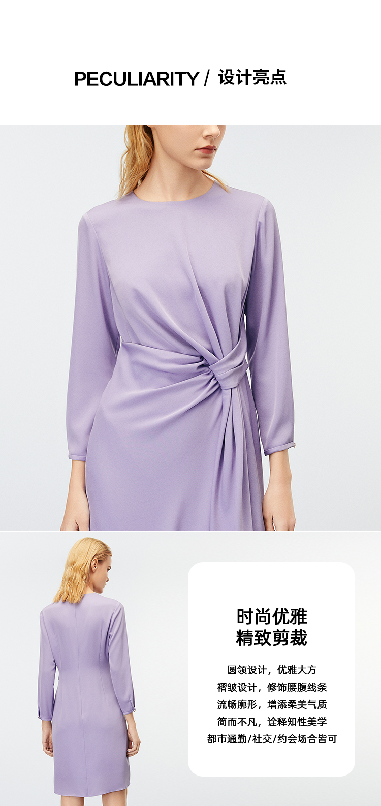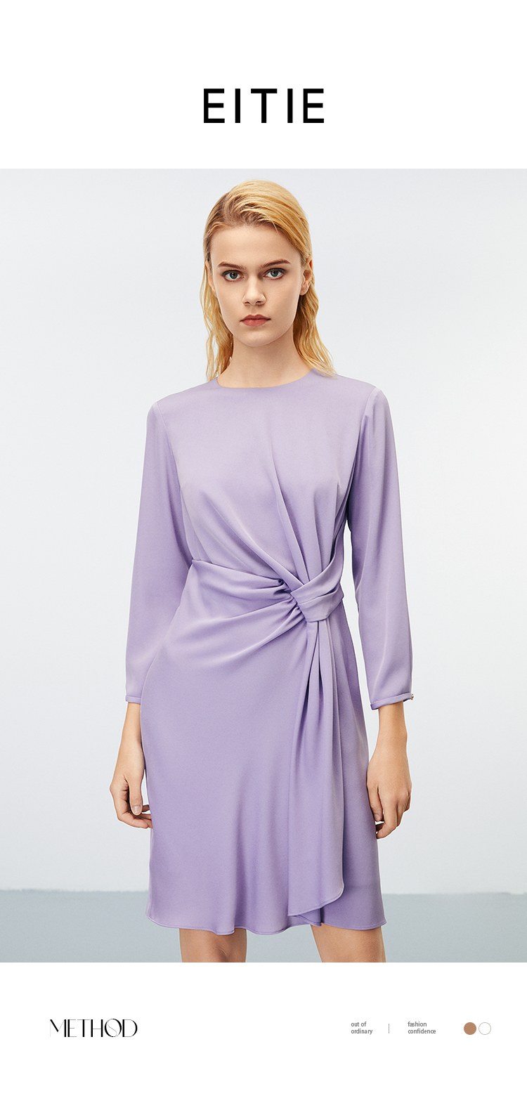 EITIE爱特爱秋季新款通勤OL压褶收腰紫色显瘦高腰连衣裙7907601