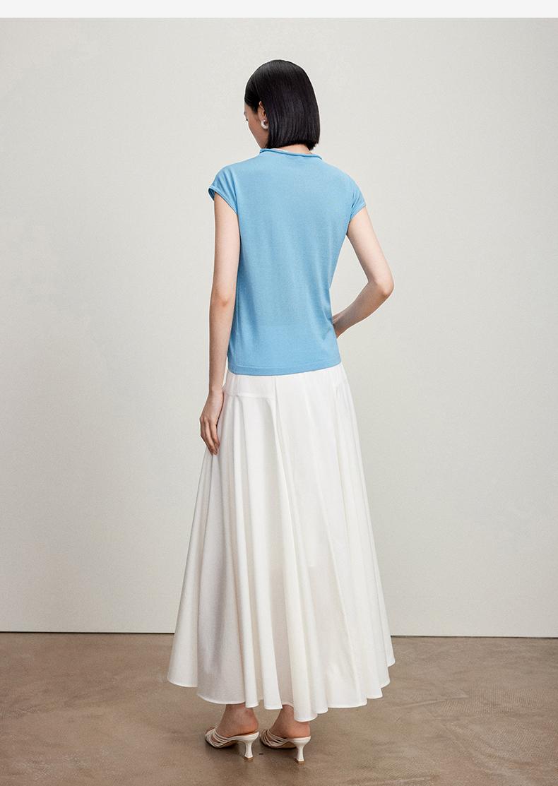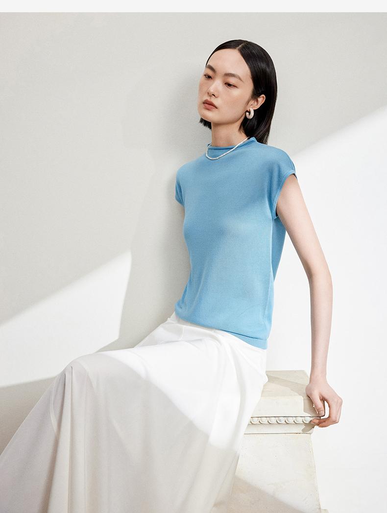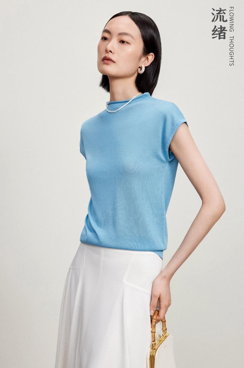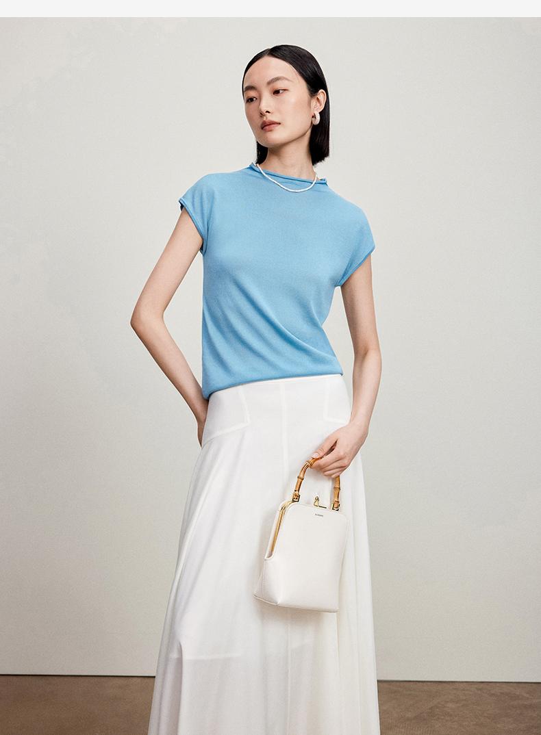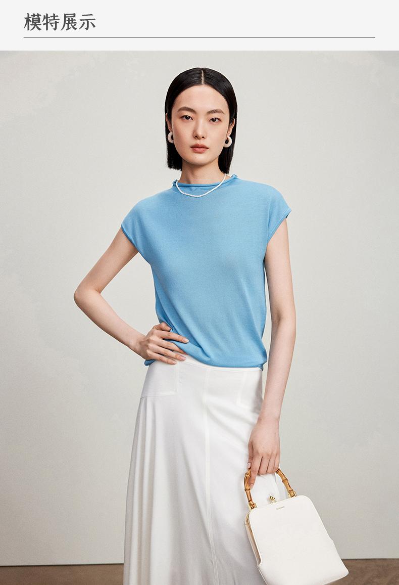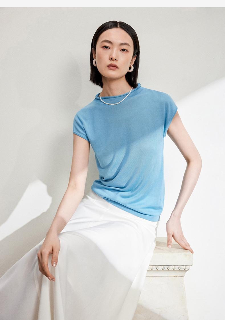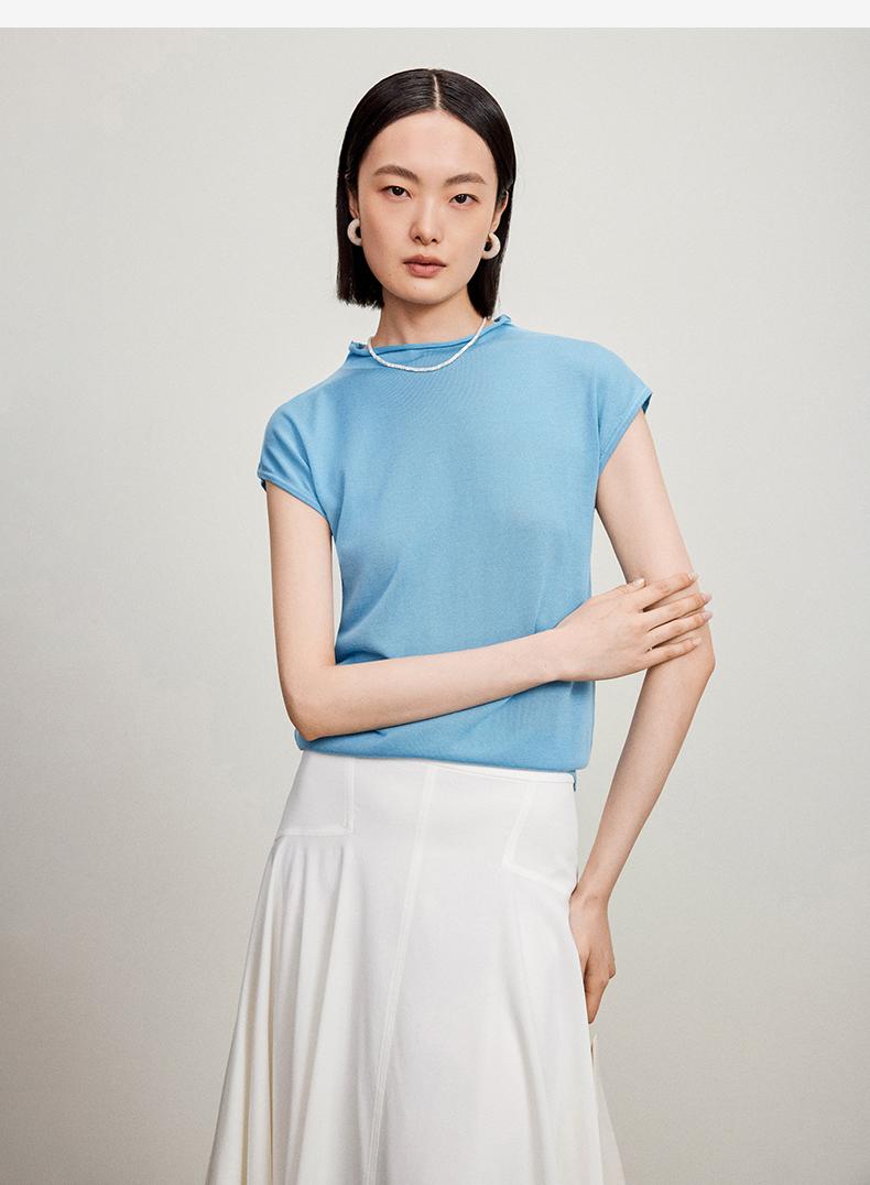 西嘉【现货】C+IMPRESS/西嘉全天丝短袖女t恤夏卷边半高领简约一字肩莱赛尔上衣T2402029