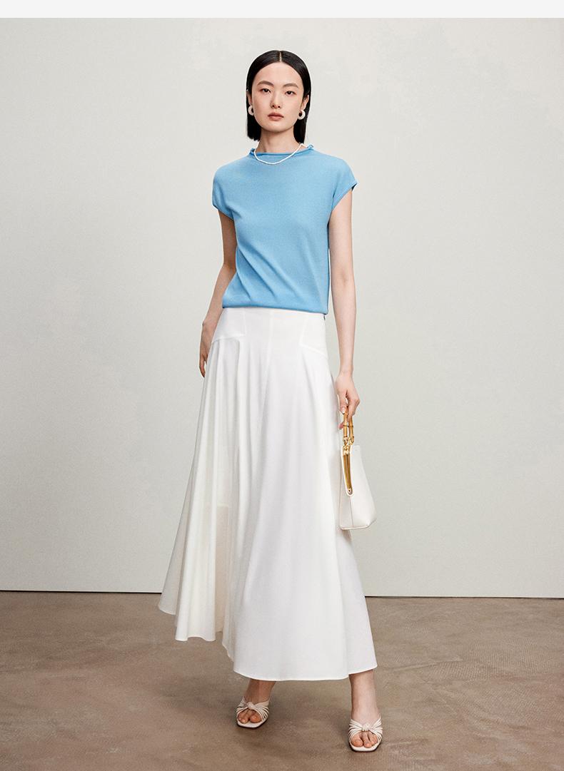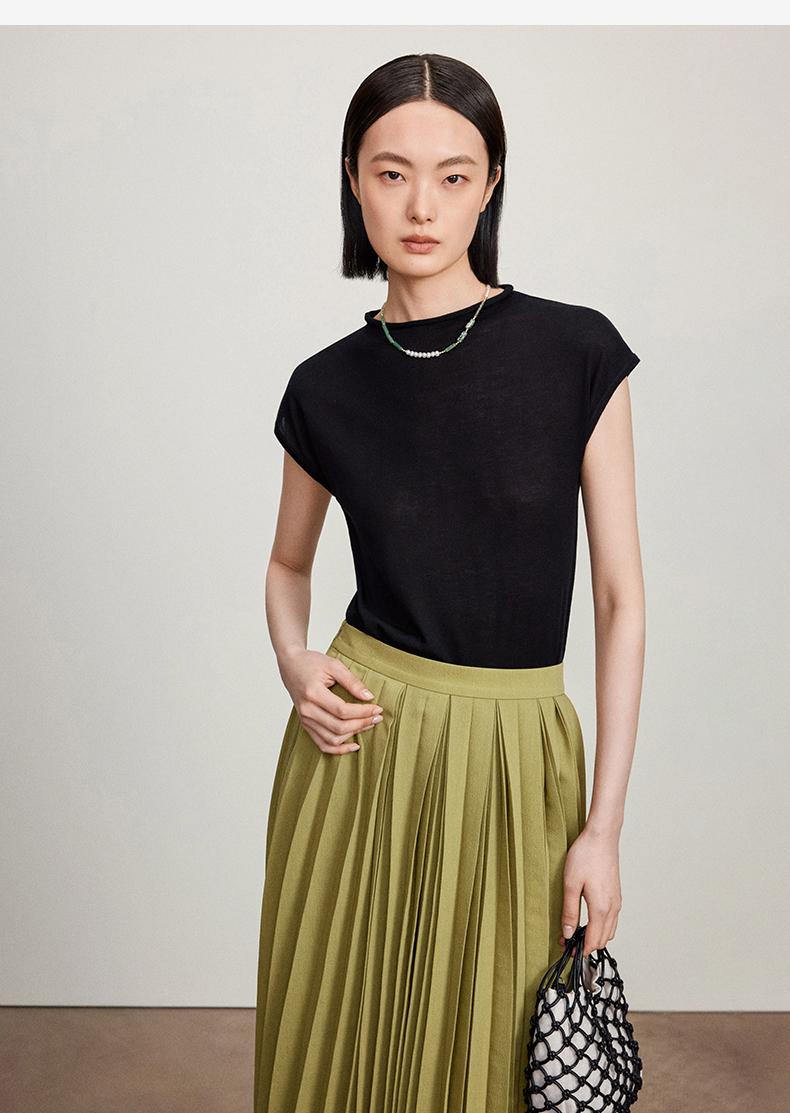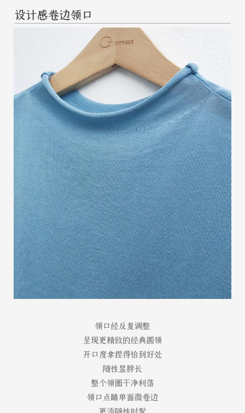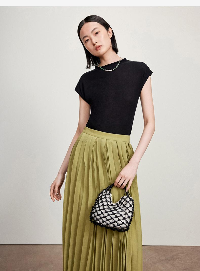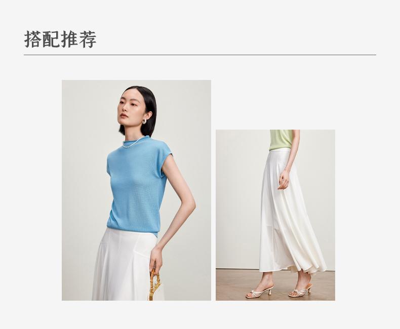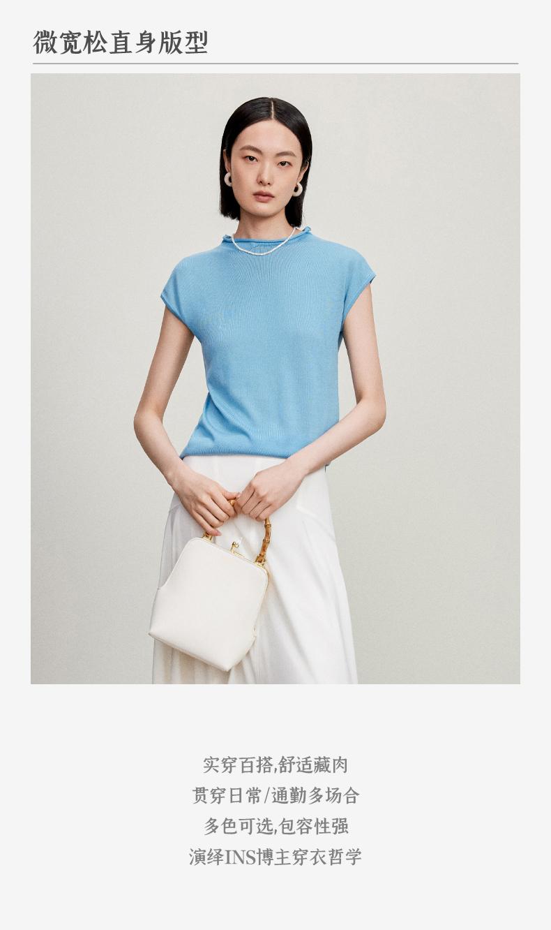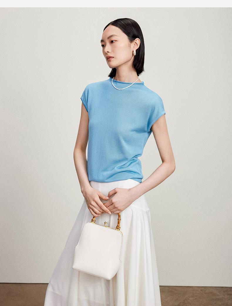 西嘉【现货】C+IMPRESS/西嘉全天丝短袖女t恤夏卷边半高领简约一字肩莱赛尔上衣T2402029