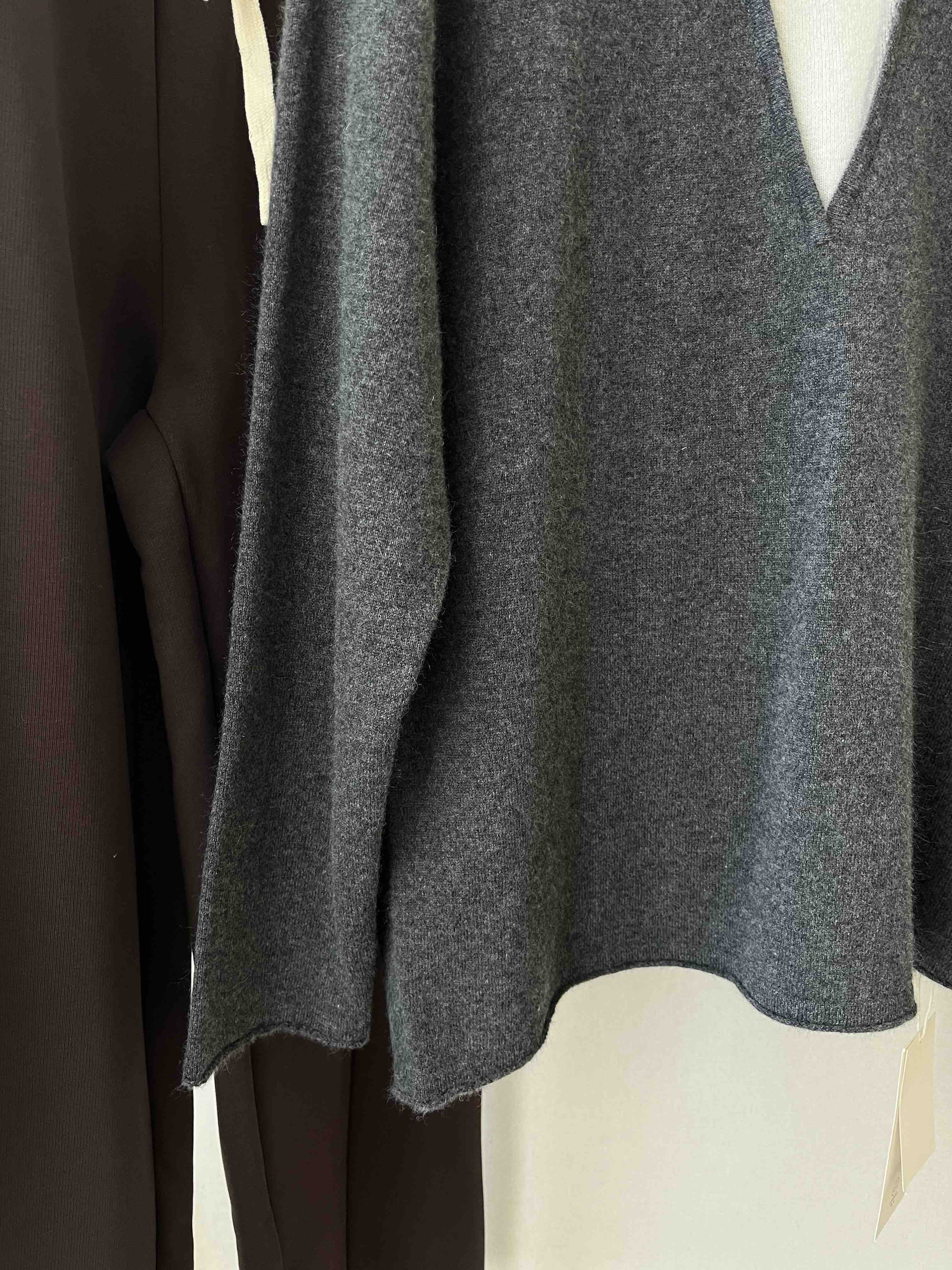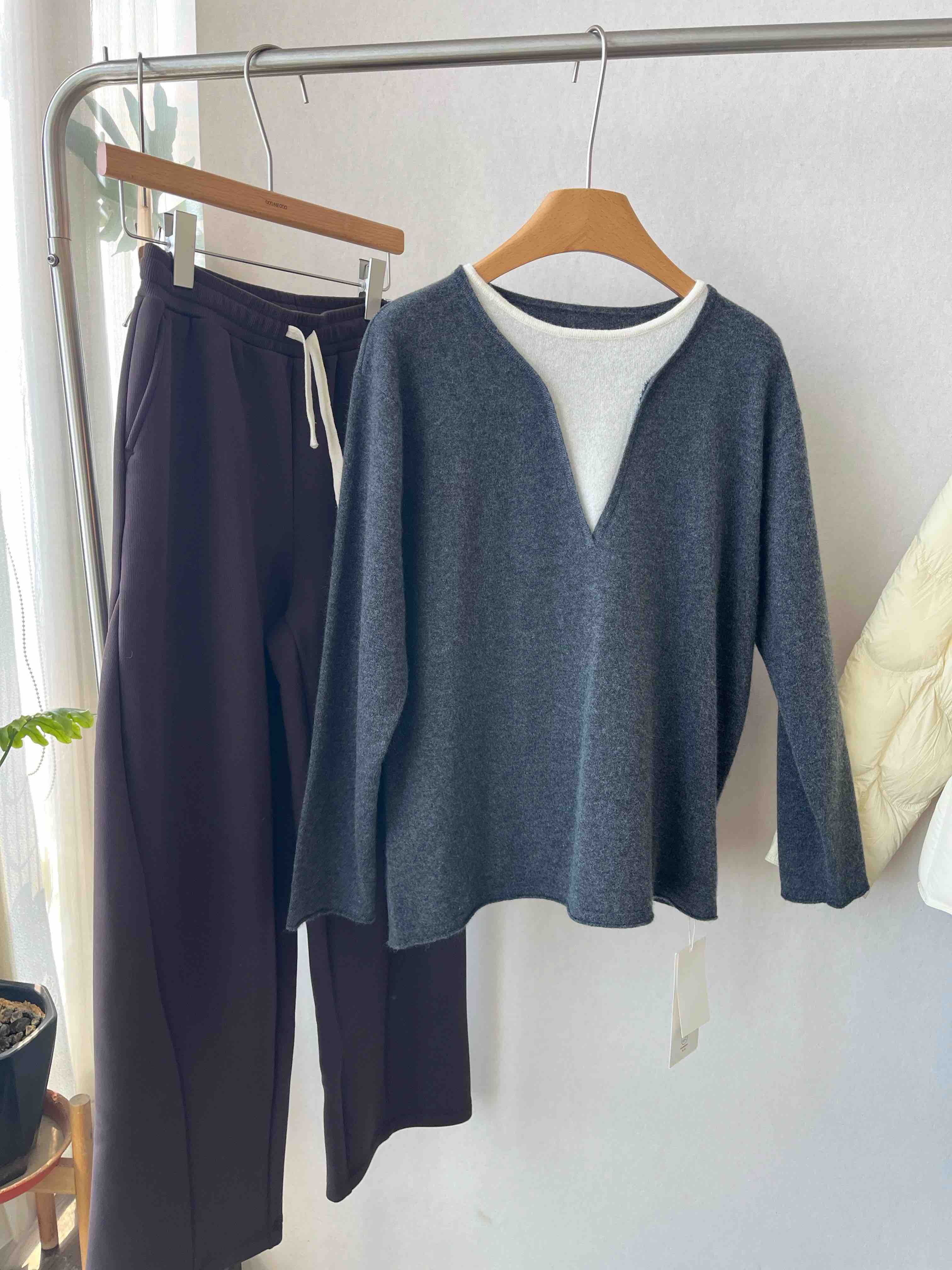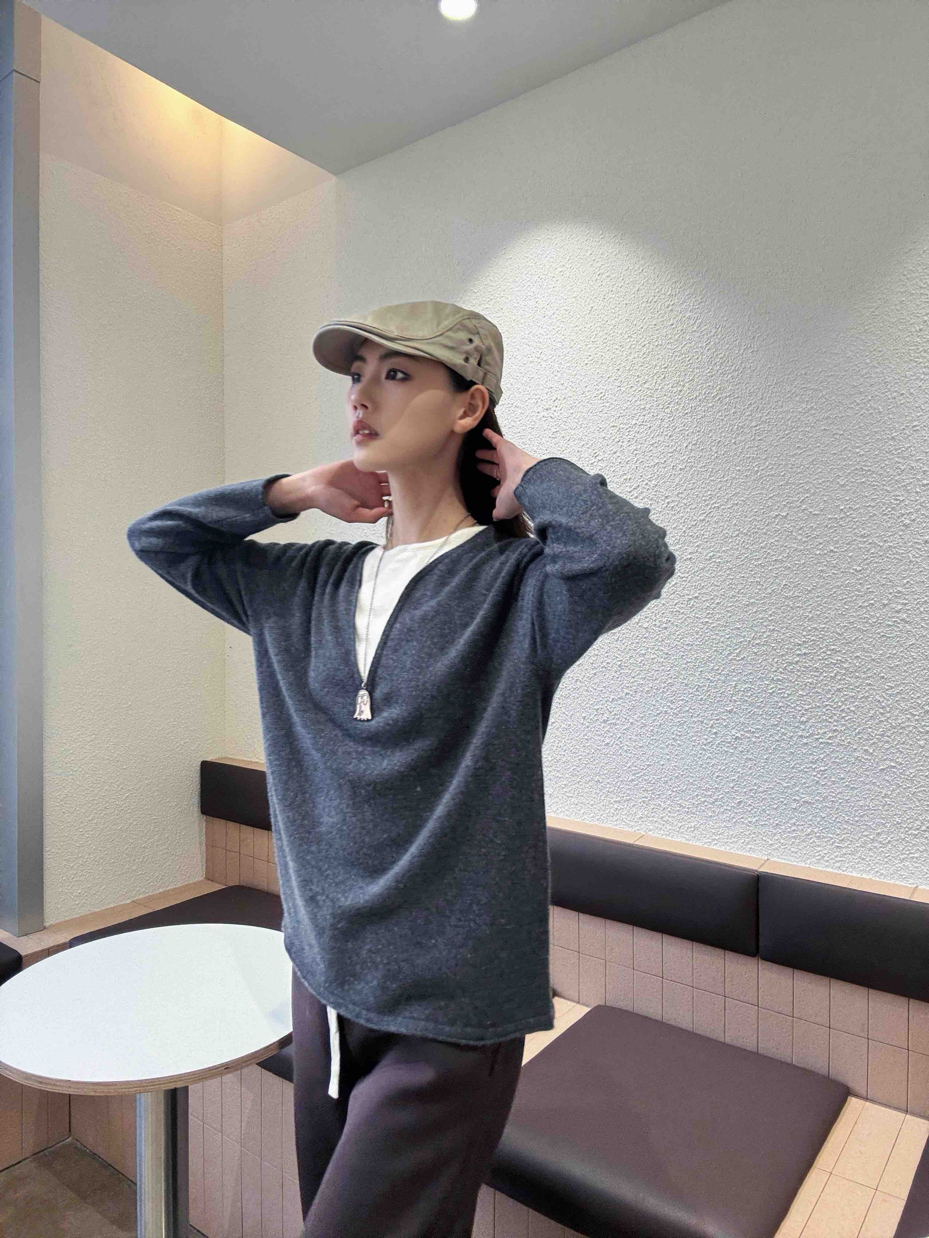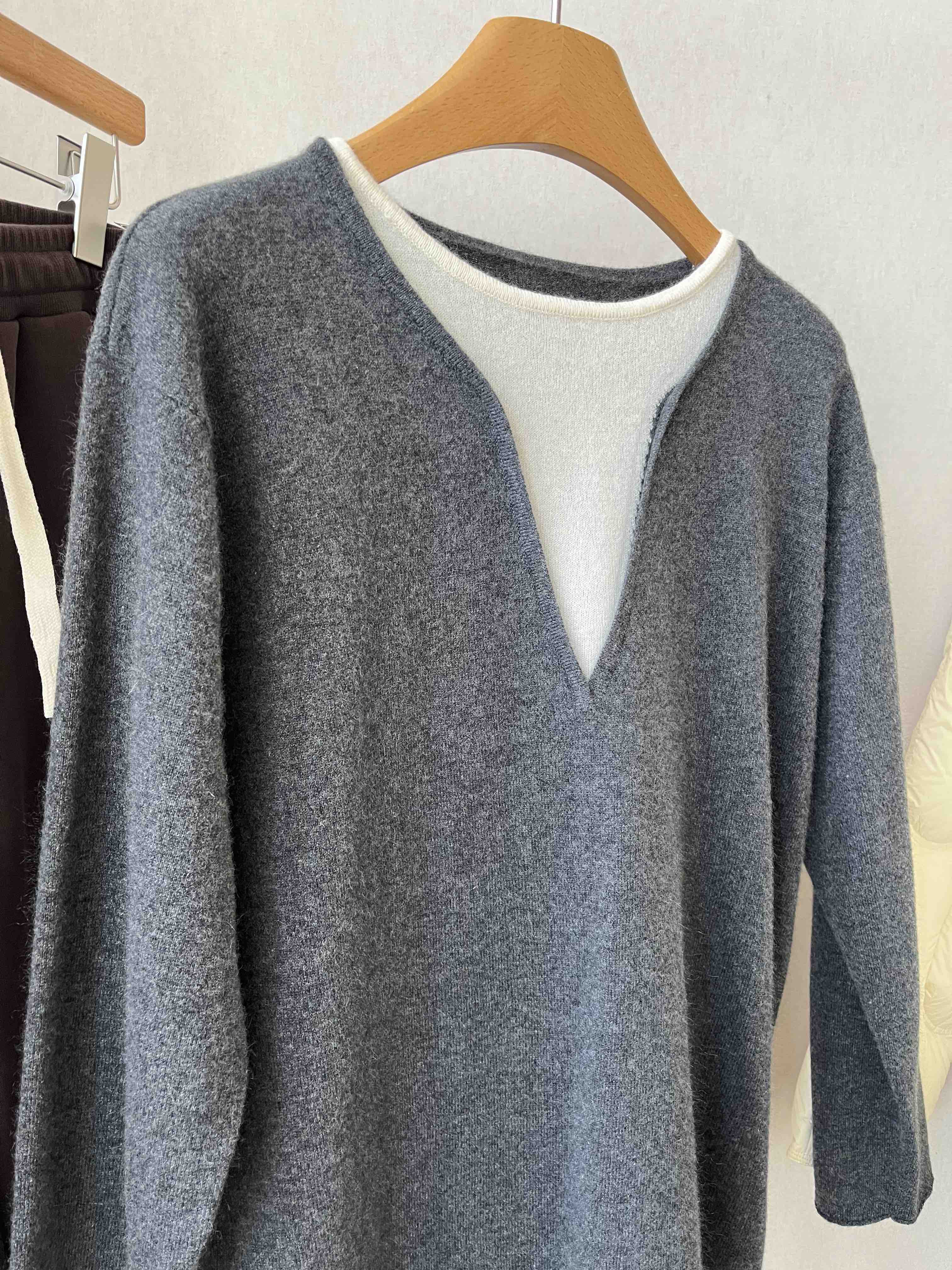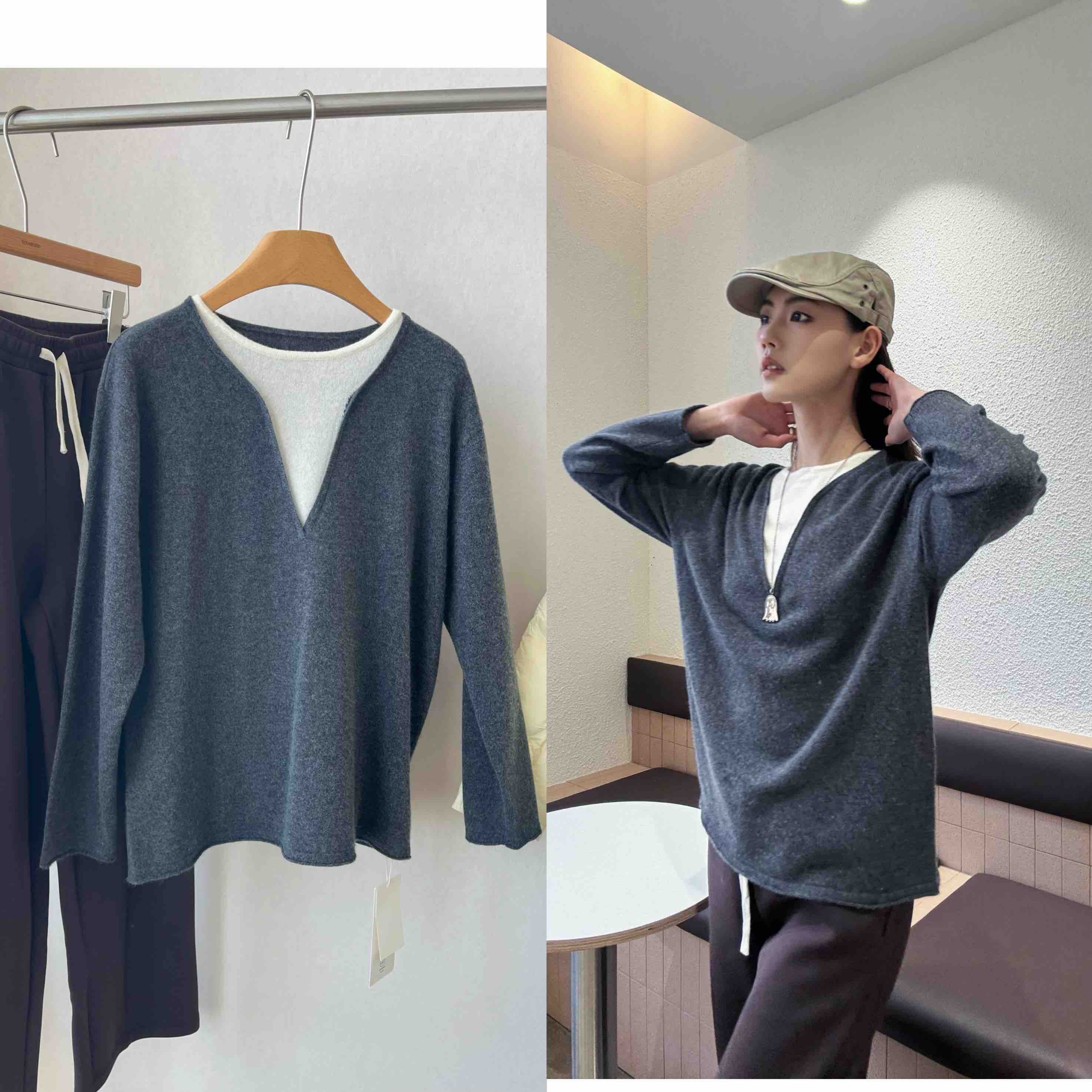 就是这件【气质灰+白】拼色的假两件羊绒套头衫!
