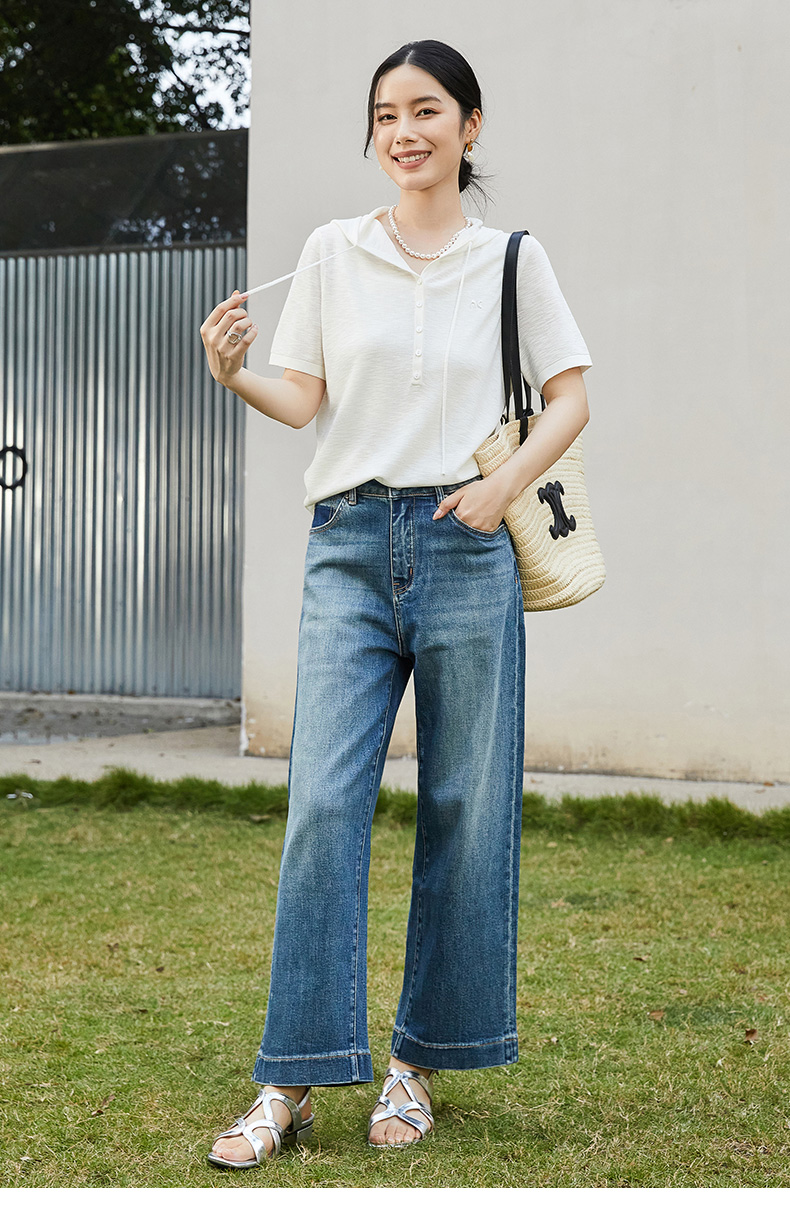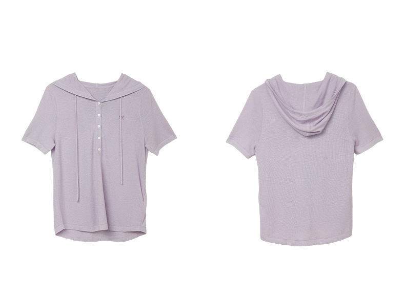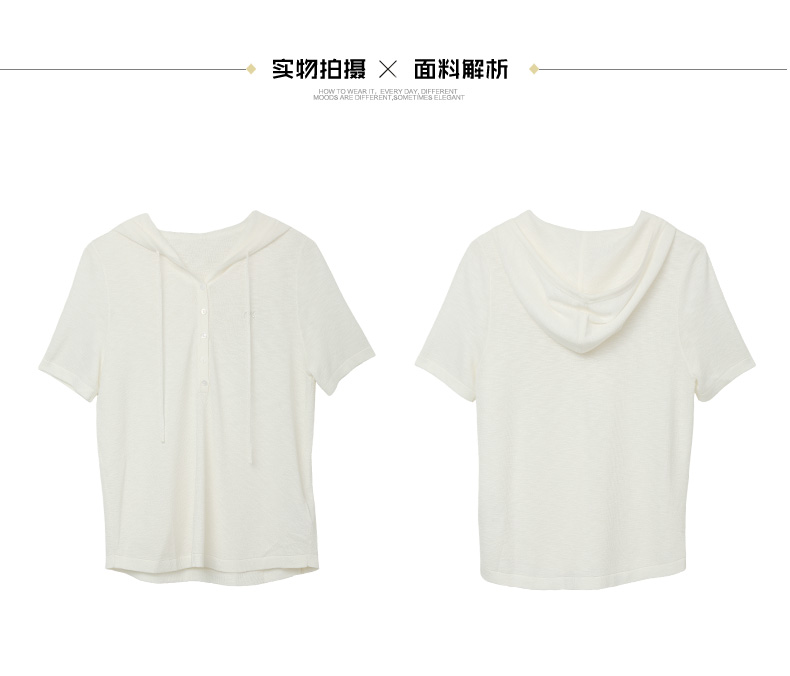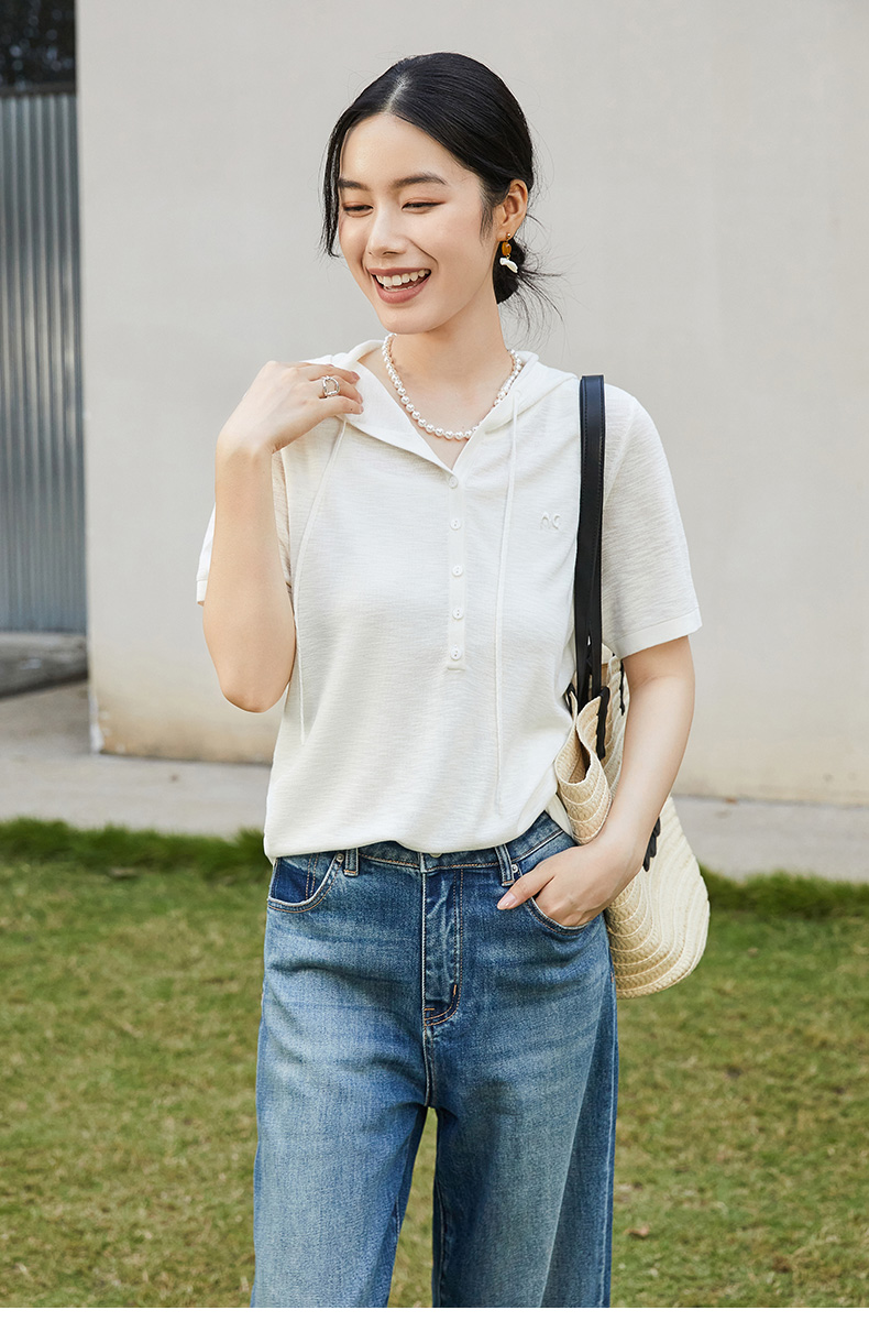 通勤百搭米白色连帽抽绳短袖针织衫女夏季薄款宽松显瘦针织衫上衣