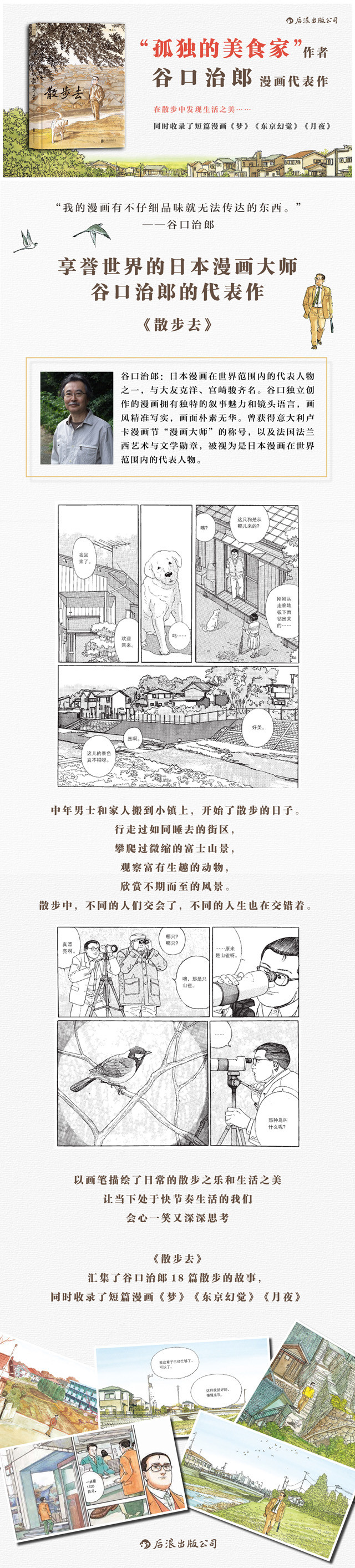 谷口治郎是日本漫画在世界范围内的代表人物之一,与大友克洋、宫崎骏齐名。《散步去》是谷口治郎自编自画的代表作,为其赢得了世界性的肯定。