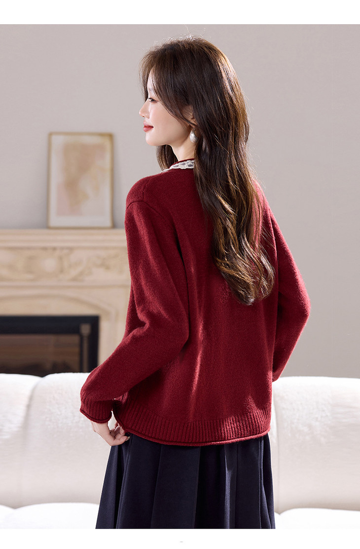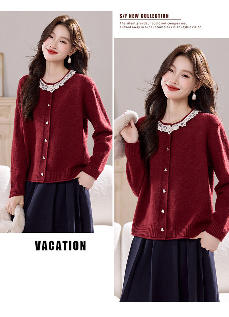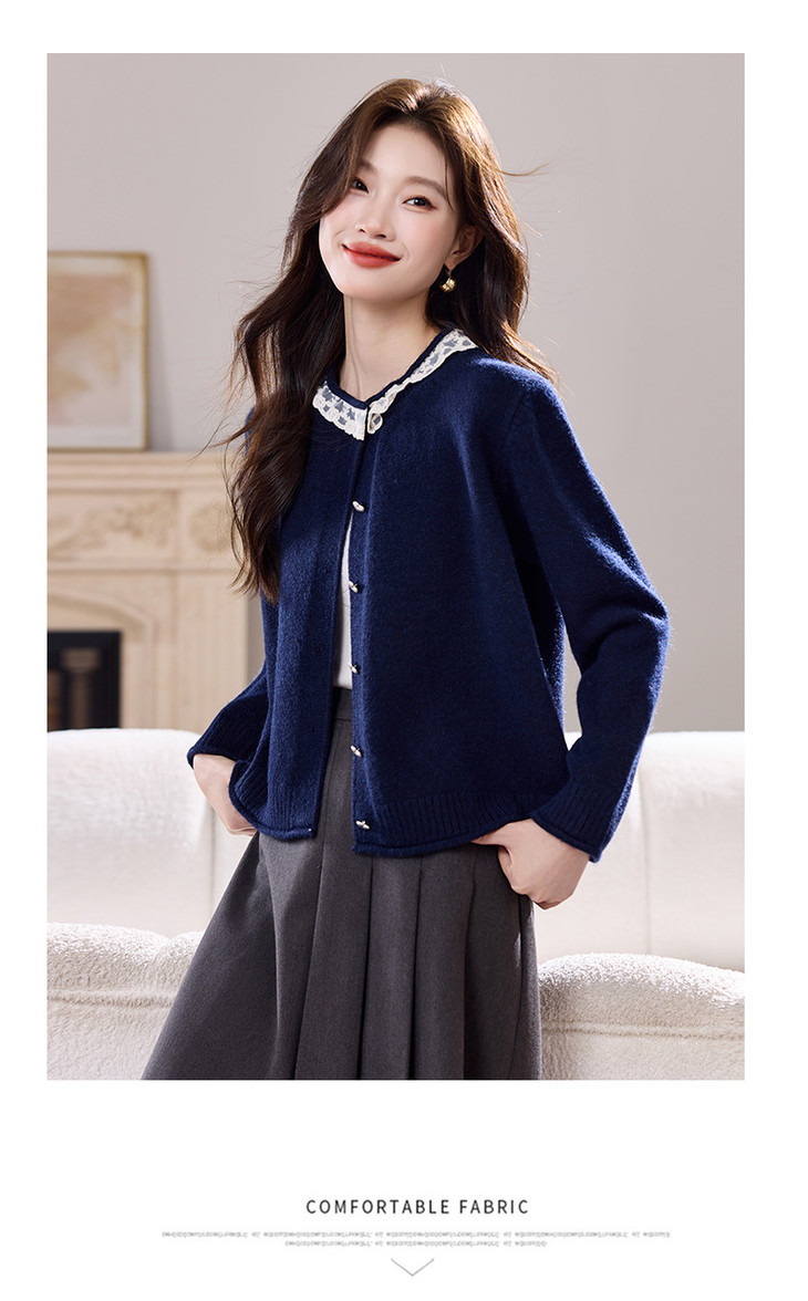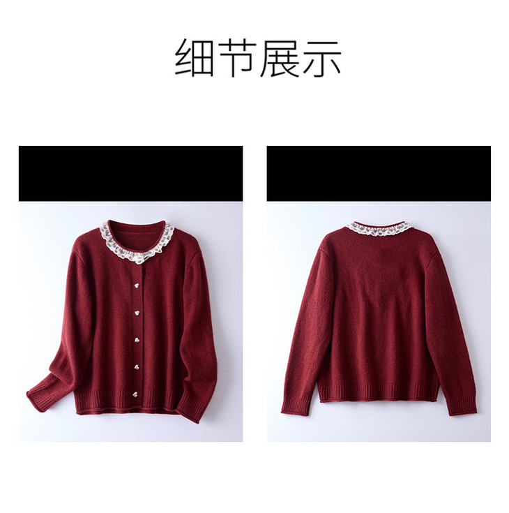设计感蕾丝拼接针织开衫,慵懒风短款小香风毛衣外套CC-J-6986