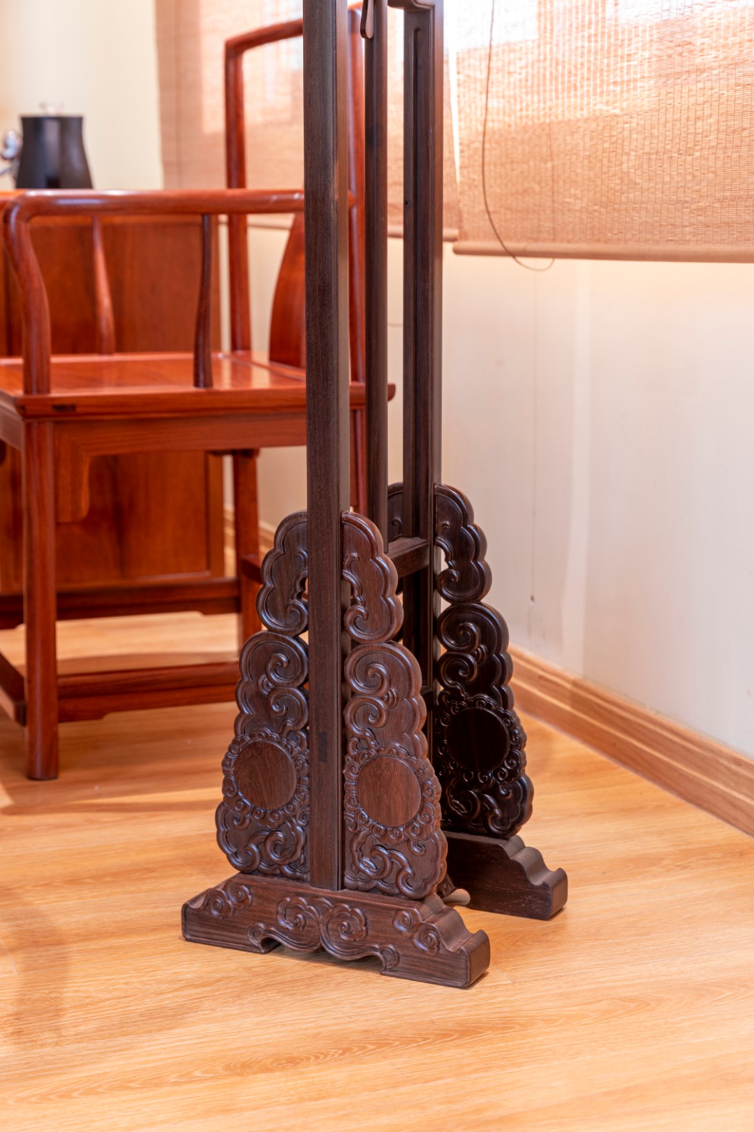 底部采用座屏风的造型,左右雕卷草纹墩木上植立柱,前后用锼刻卷云纹伴日站牙抵夹,柱间施横枨二道,嵌装透雕云纹绦环板,其下安卷草纹披水牙子。