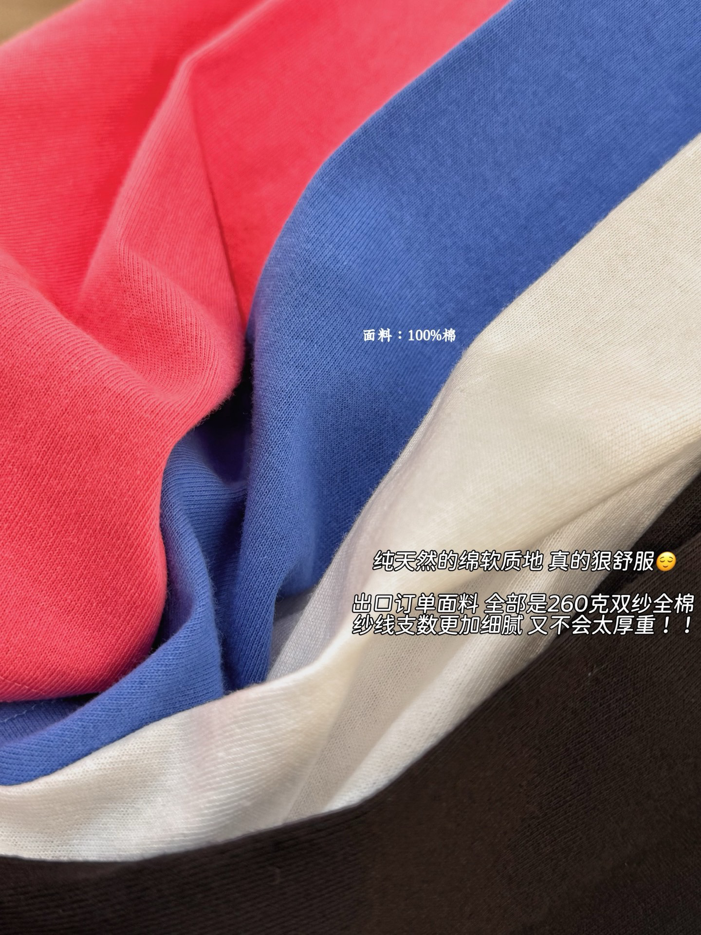 出口订单面料 全部是260克双纱全棉 纱线支数更加细腻 既保证了垂坠感 又不会太厚重