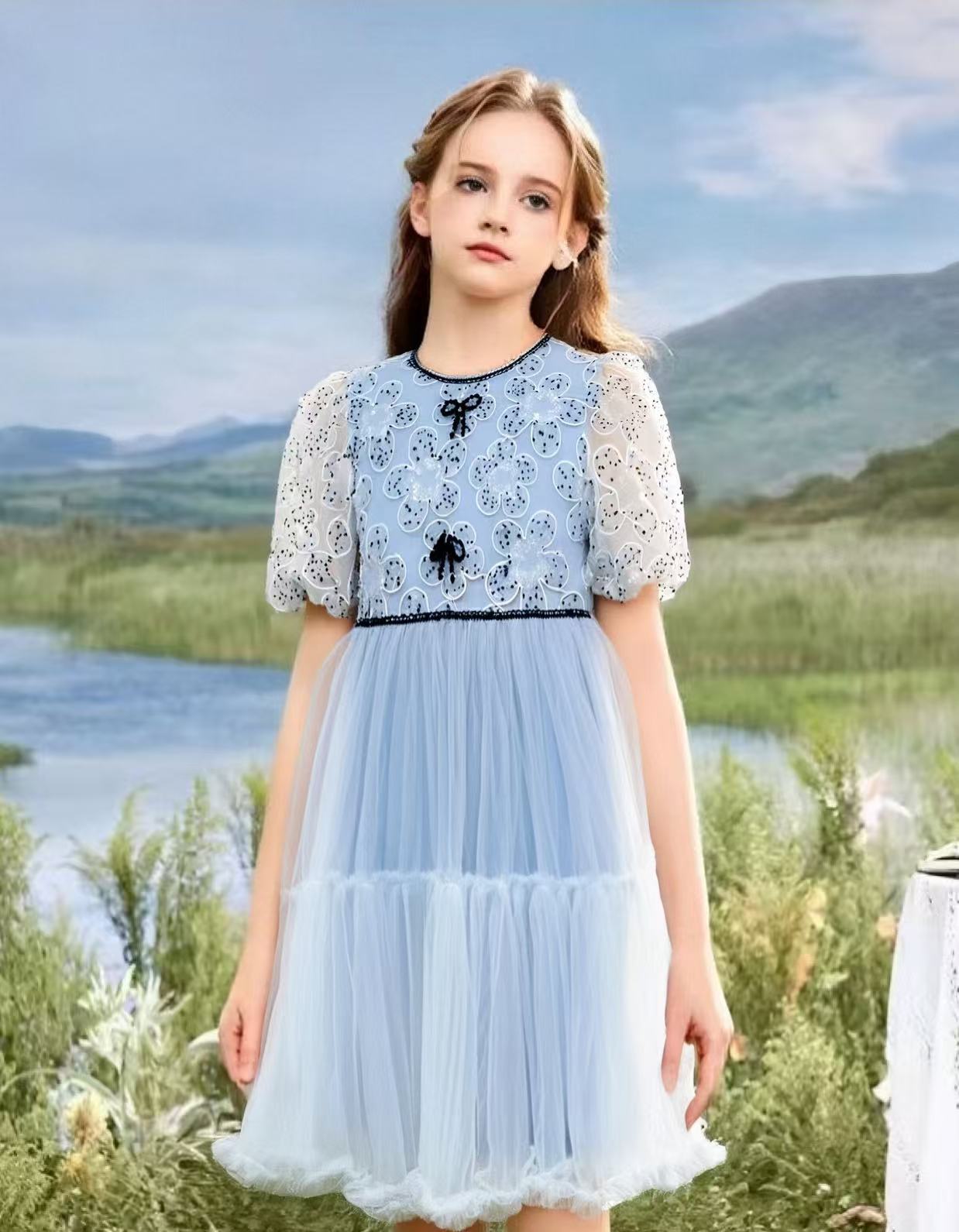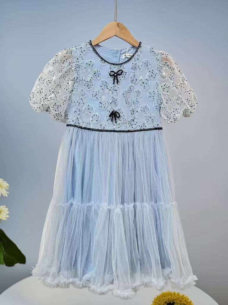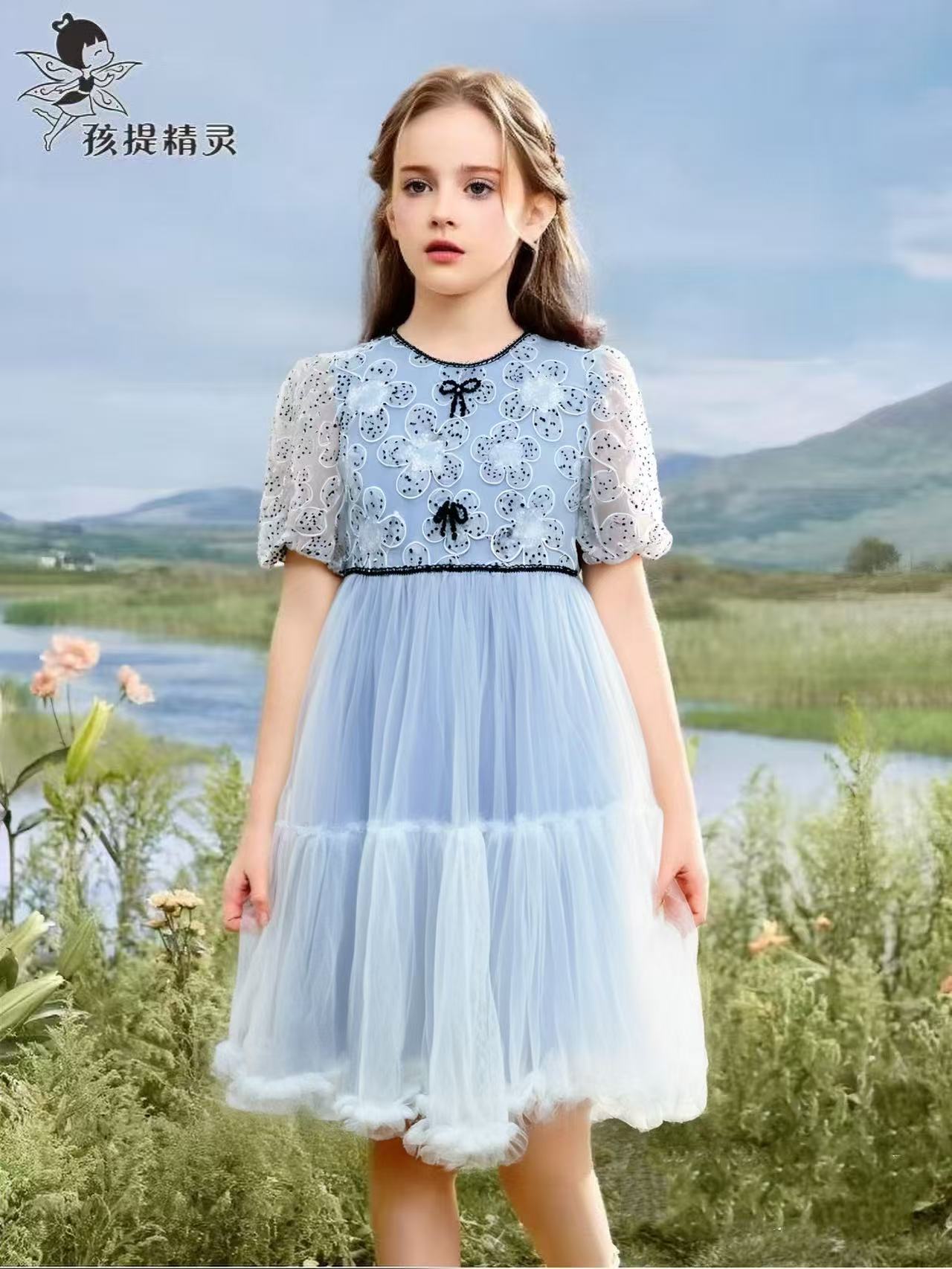 【孩提精灵】2001立体花朵重工亮片淡蓝公主裙(内衬100%棉不扎)-喜出
