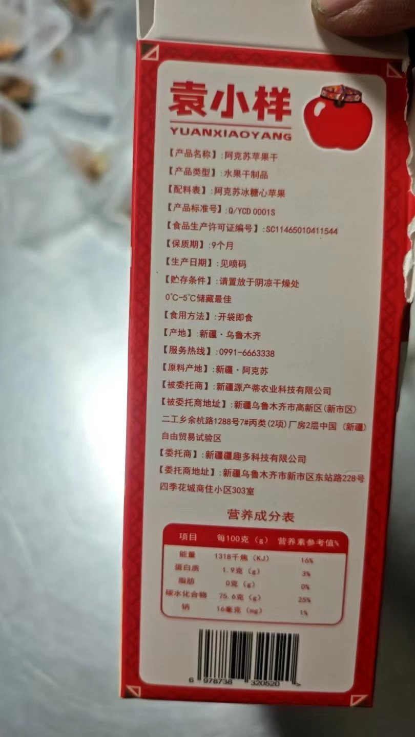 新品登场 甜蜜暖冬 新疆阿克苏冰糖心厚切苹果干来袭! 精选核心产区优质冰糖心苹果,10斤鲜果出1斤干! 肉厚如凝脂,霜糖纹路美,琥珀色天然甜度爆表!厚果半切,三蒸三晒 0防腐剂、0色素0添加,维C+膳食纤维拉满,促消化、强免疫! 独立包装随身带,健身、办公、哄娃全搞定! 送人自享都超赞,全家幸福的美味! 【品名】袁小样阿克苏苹果干 【规格】260g*1盒/260g*2盒/260g*4盒 【产地】新疆阿克苏 【保质期】9个月 【生产日期】近期 【快递说明】中通、圆通、申通、韵达随机发送 【不发货】内蒙,西藏,海南,港澳台 【发货时效】接单后48-72小时内 【售后规则】 1:请当面验收快递,如有外包装严重破损请勿签收。 2:签收24小时内如果有问题售后