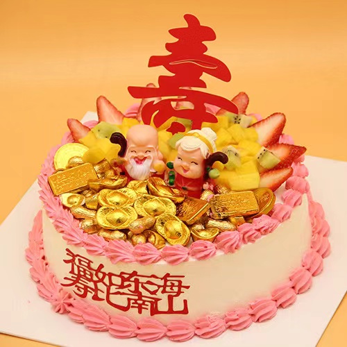 克力元宝和新鲜芒果,大红色的寿字插件光彩夺目,一定会给老人带