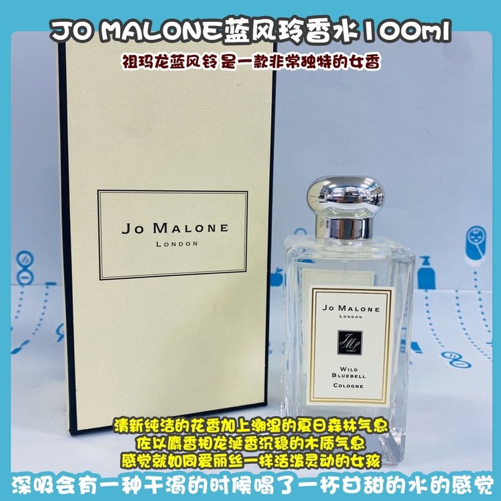 JO MALONE蓝风玲香水100ml👍祖玛龙蓝风铃💙是一款非常独特的女香。清新纯洁的花香加上潮湿的夏日森林气息🌲,佐以麝香相龙涎香沉稳的木质气息🤔。感觉就如同爱丽丝一样活泼灵动的女孩👯,干净、梦幻、甜而不腻。味道属于冷香,很适合夏天使用哦☀,闻一次就会沦陷的香水,深吸会有一种干渴的时候喝了一杯甘甜的水的感觉😋。