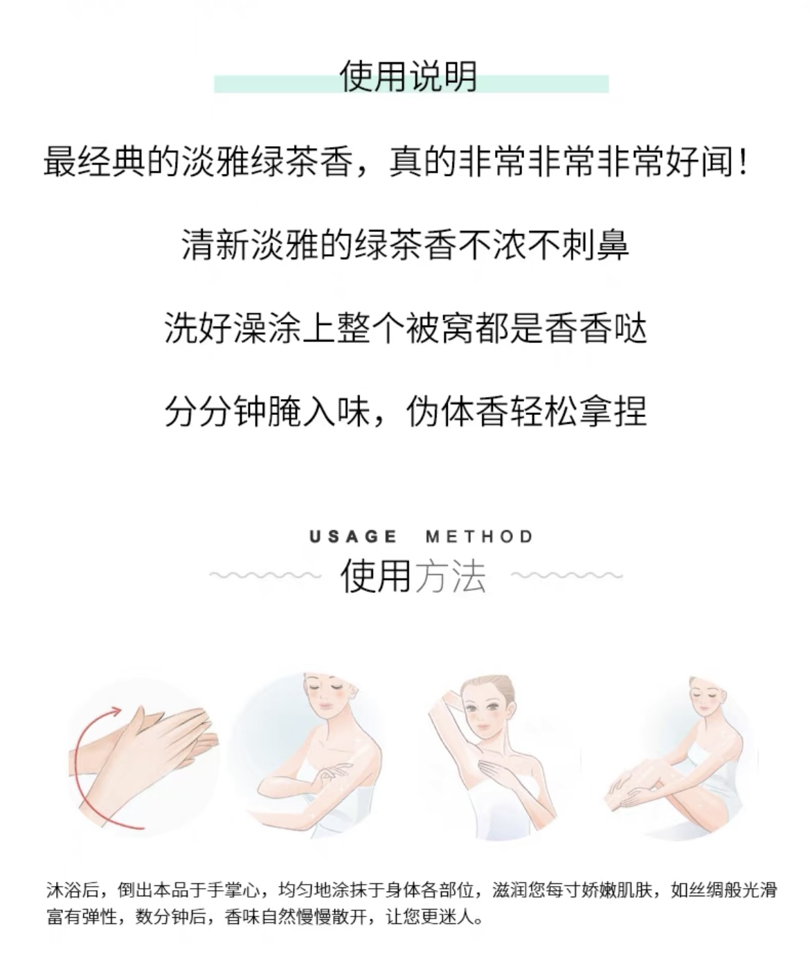 清新脱俗的香味:绿茶香调,绿茶的主要成分还有茉莉,玫瑰,水果香等等,乳霜细致,香味幽雅,沐浴后全身清爽舒适,香味持久迷人,特别适合喜欢身体散发出自然花香的人。