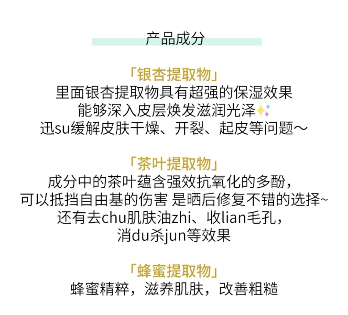 含有日本绿茶,巴拉圭茶叶,gotu kola和海藻提炼品,琉璃苣油,树脂黄油,麦芽提炼品和芦荟,恰到好处的形成保护凝胶来补充耗尽的水分,留下光滑细嫩的皮肤,有益皮肤的健康和弹性。