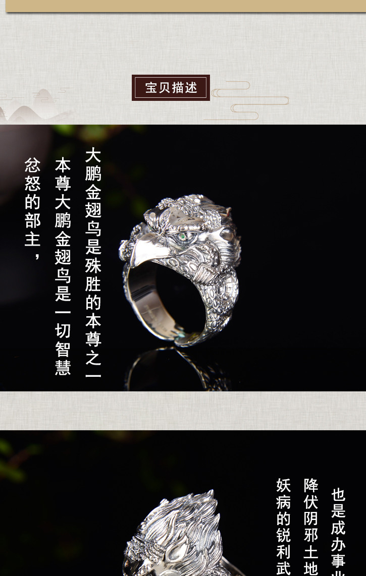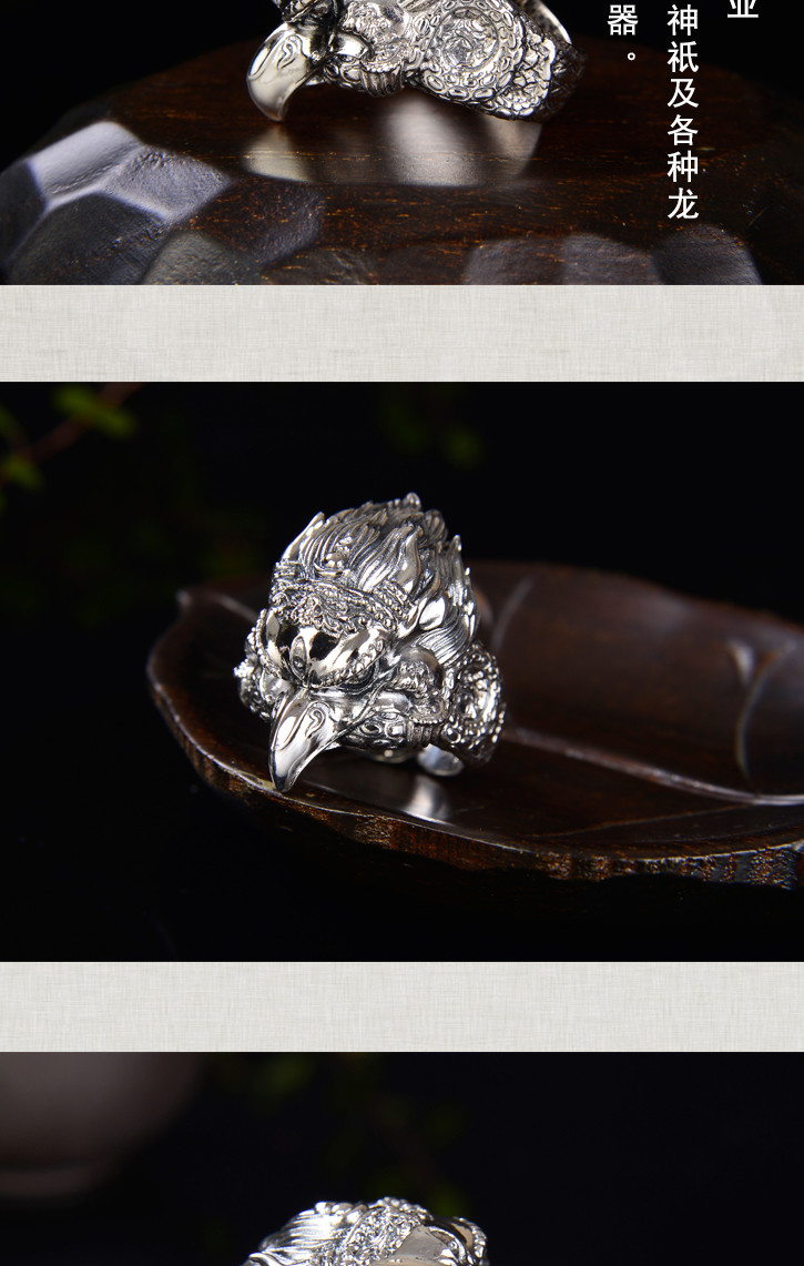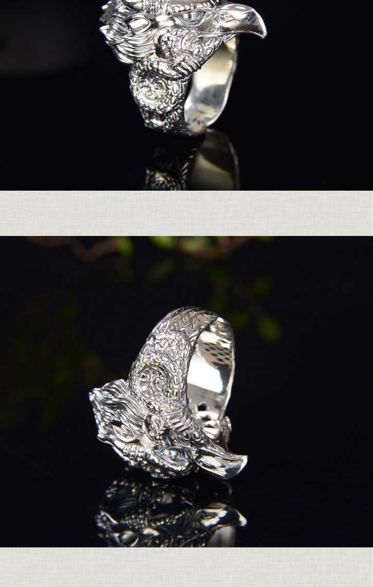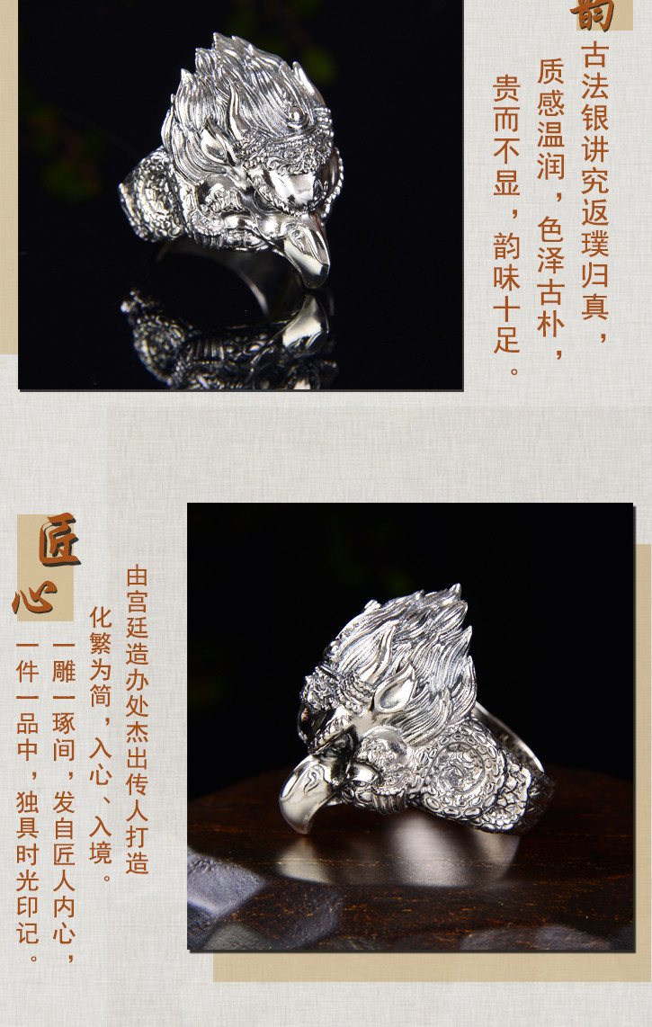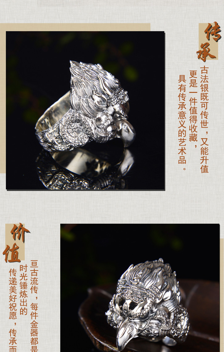 天语龙吟 银古法银大鹏金翅鸟戒指纯银戒指男女款可调节