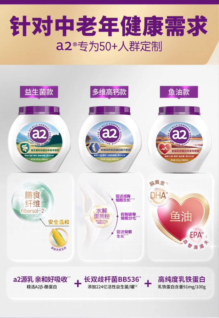 产品名称:a2 鱼油/多维高钙/益生菌铁蛋白中老年奶粉800g