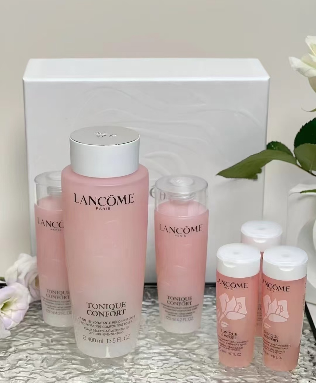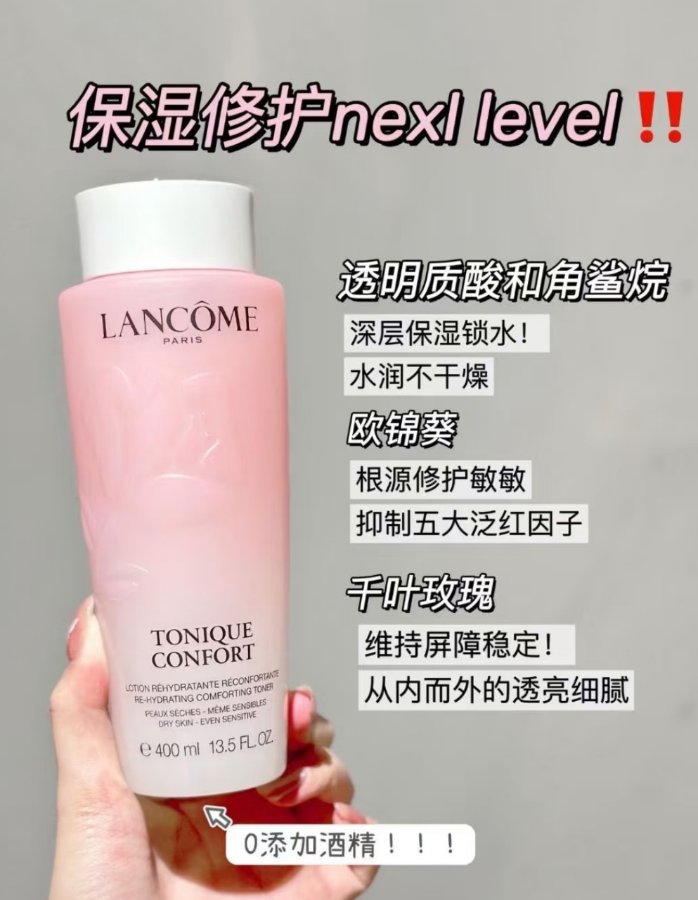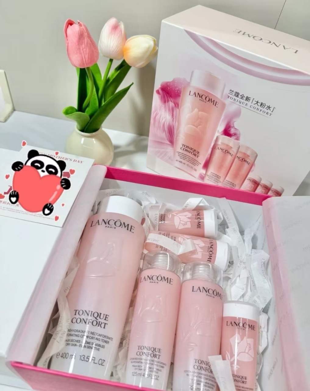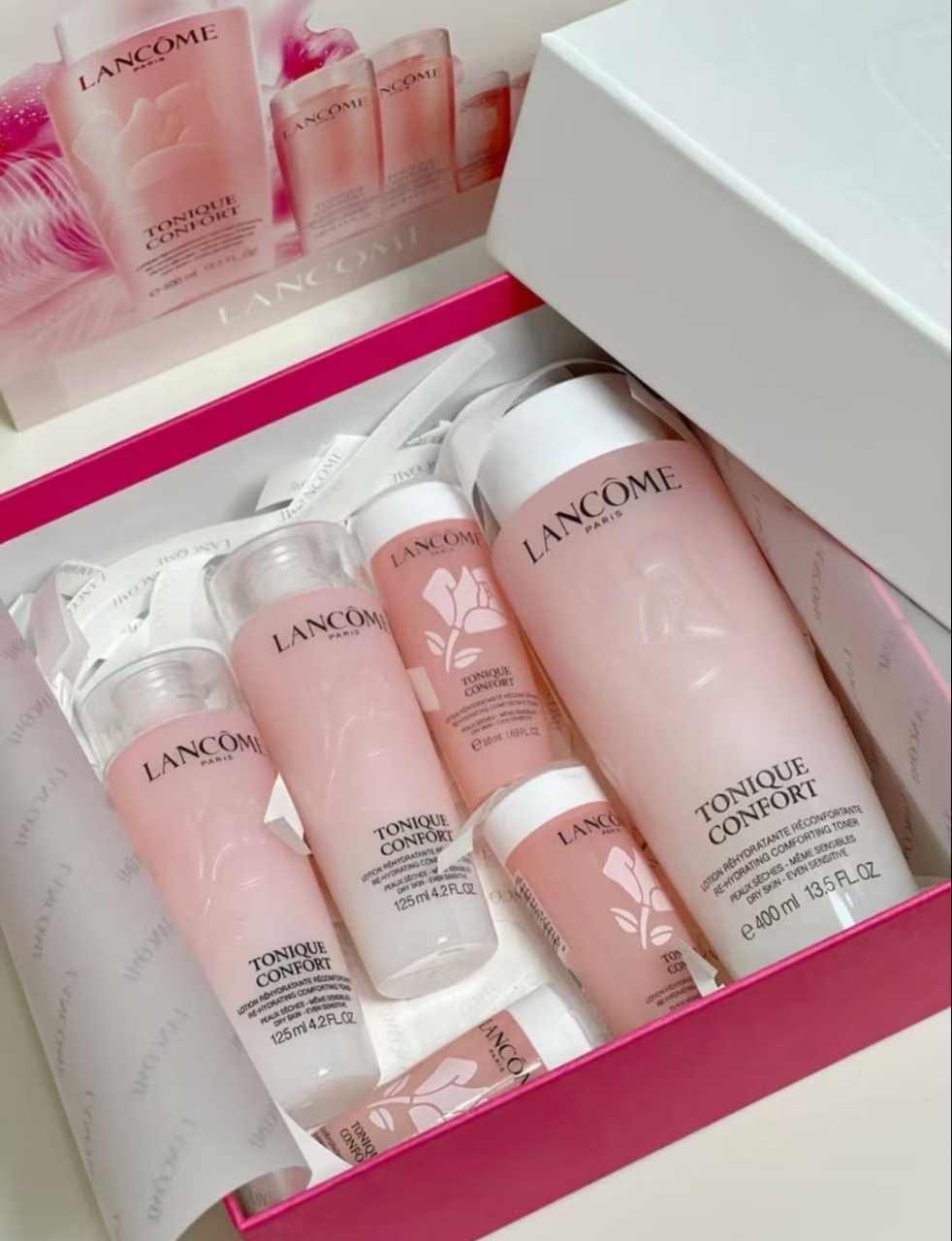 ,总容量800ml,超适合干皮姐妹!主打补水保湿,质地轻盈易吸收,日常护肤或旅行携带都很方便✨。礼盒还送手袋,收纳超省心,送礼自用都很赞!性价比超高,囤货党必入!