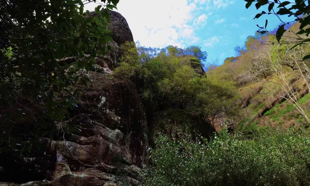 碧石岩是武夷山九十九名岩之一,位于武夷山景区北麓,为一条南北的山体,北高南低,长约200余米,南部陡峭壁立,东壁沿节理有多条层面,树木葱郁。
