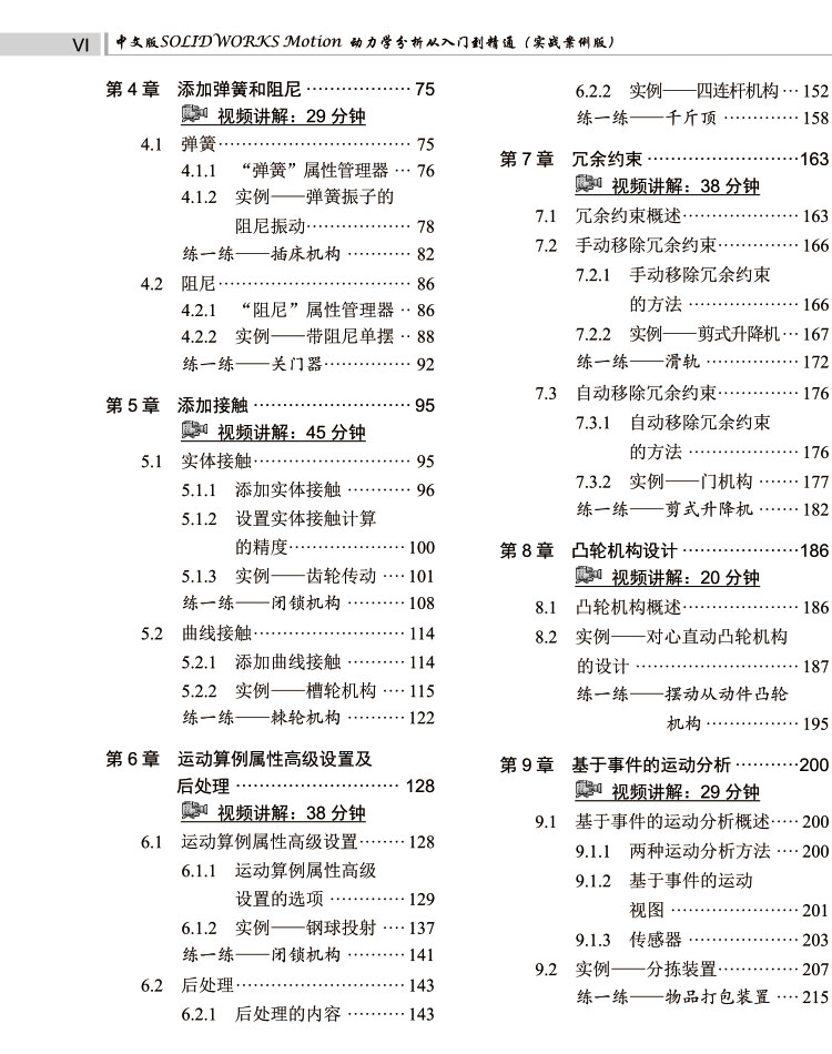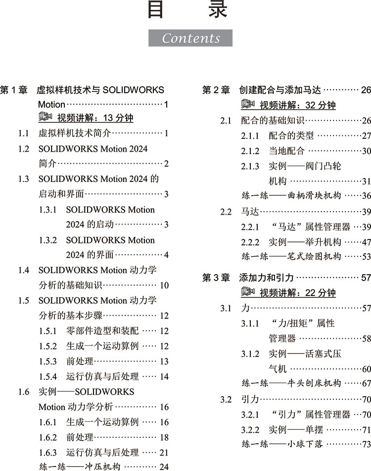 Motion 2024 动力学分析的应用技术,既是一本图文教程,又是一本视频教程。本书共11 章,系统讲述了虚拟样机技术与 SOLIDWORKS Motion、创建配合与添加马达、添加力和引力、添加弹簧和阻尼、添加接触、运动算例属性高级设置及后处理、冗余约束、凸轮机构设计、基于事件的运动分析、设计优化以及 SOLIDWORKS Motion与 SOLIDWORKS Simulation 的联合仿真等。在讲解过程中,每个重要知识点均配有实例讲解和练习实例,可以提高读者的动手能力,并加深读者对知识点的理解。