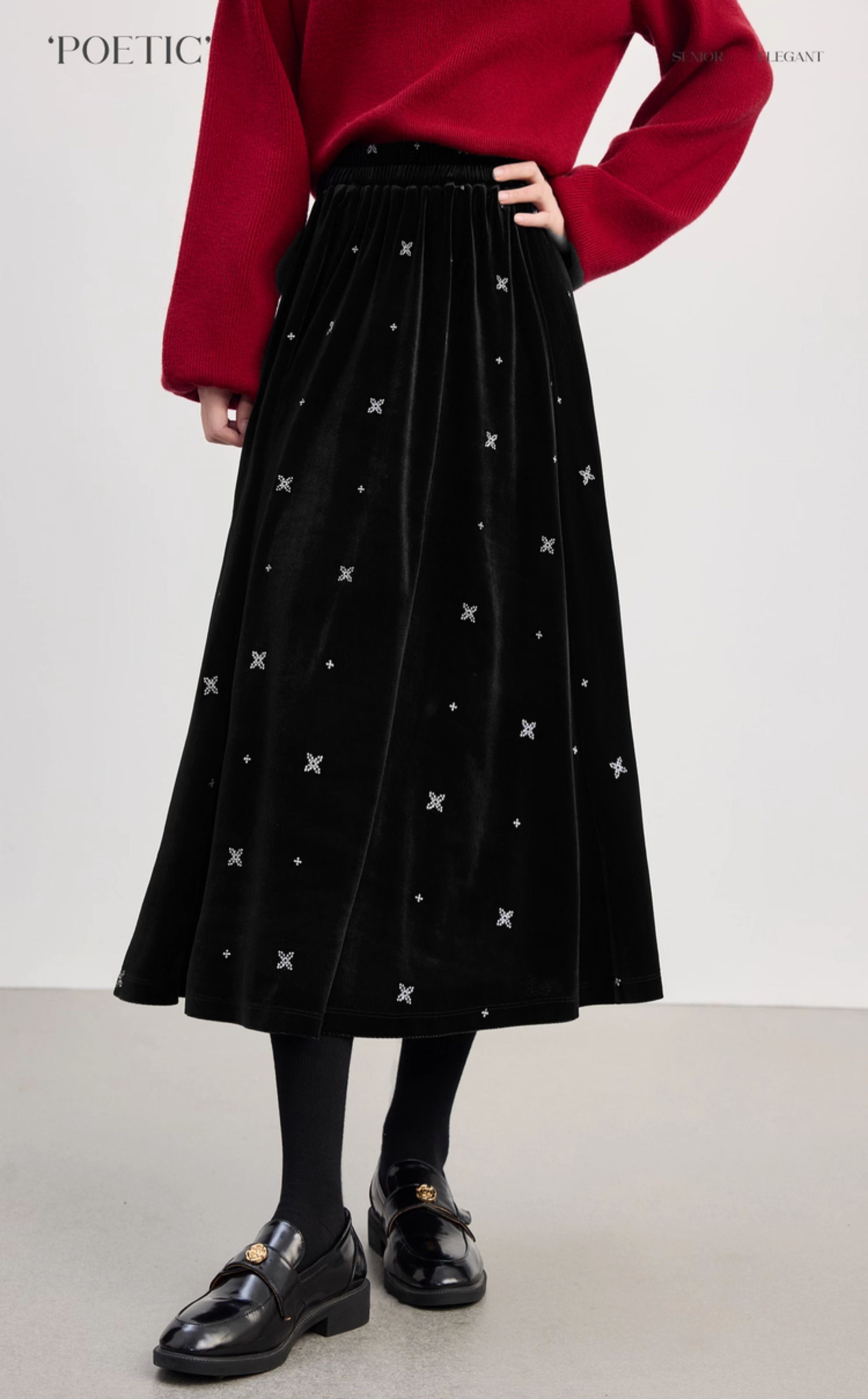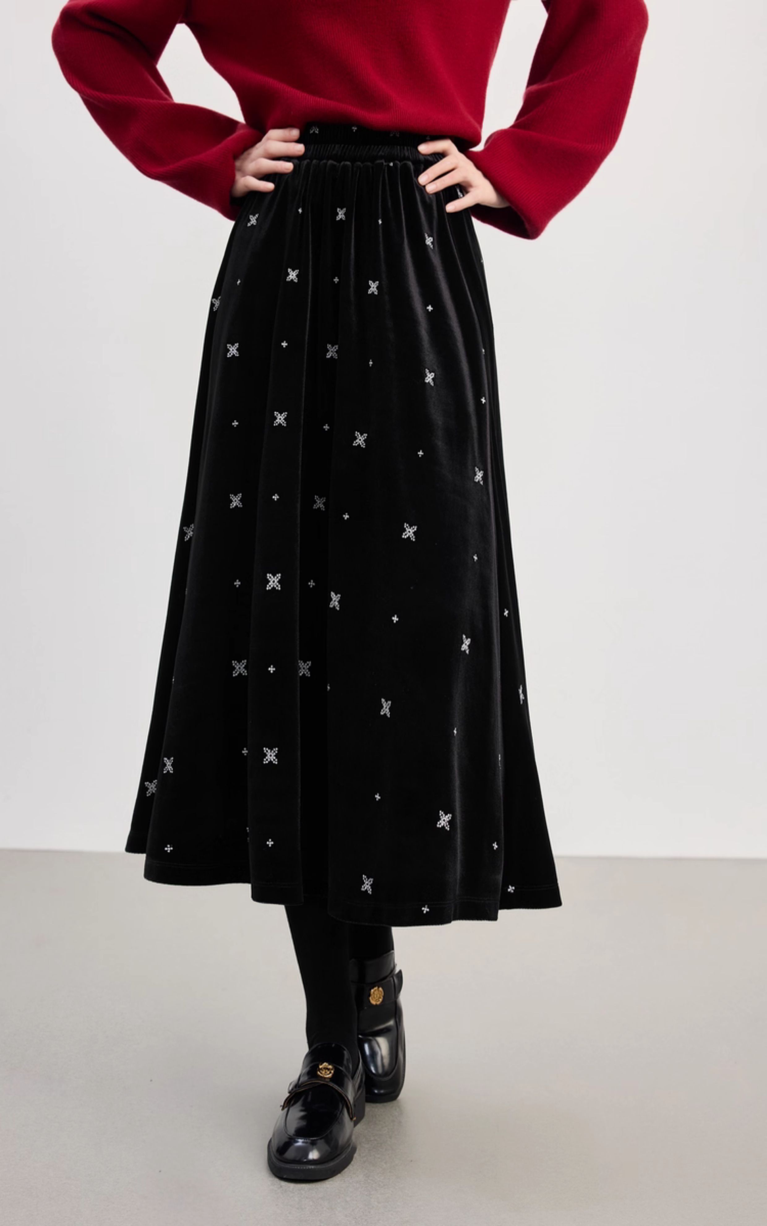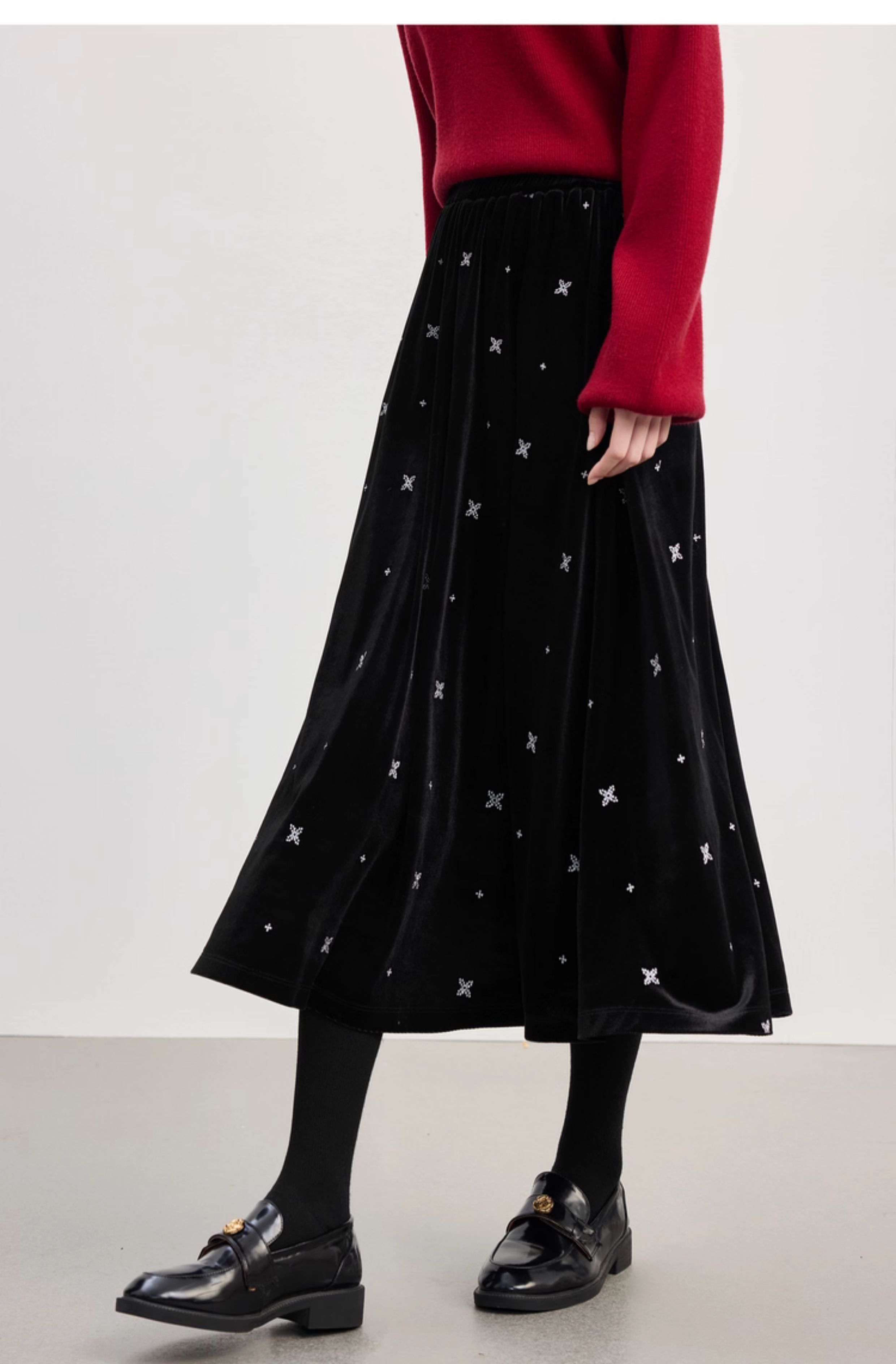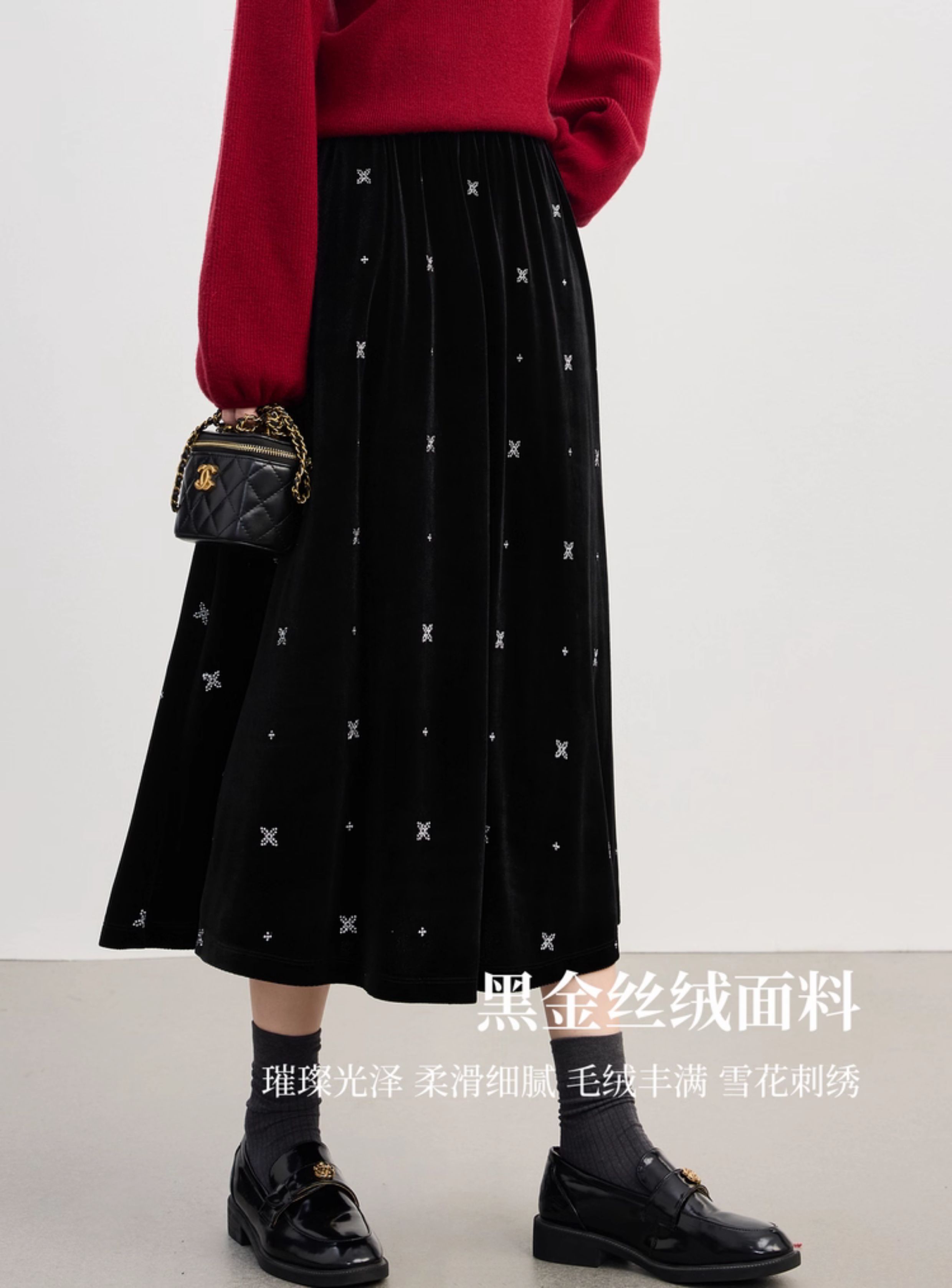 【10/1新品】熙世界赫本风黑金丝绒半身裙女秋冬新款雪花刺绣高腰显瘦a字半裙
