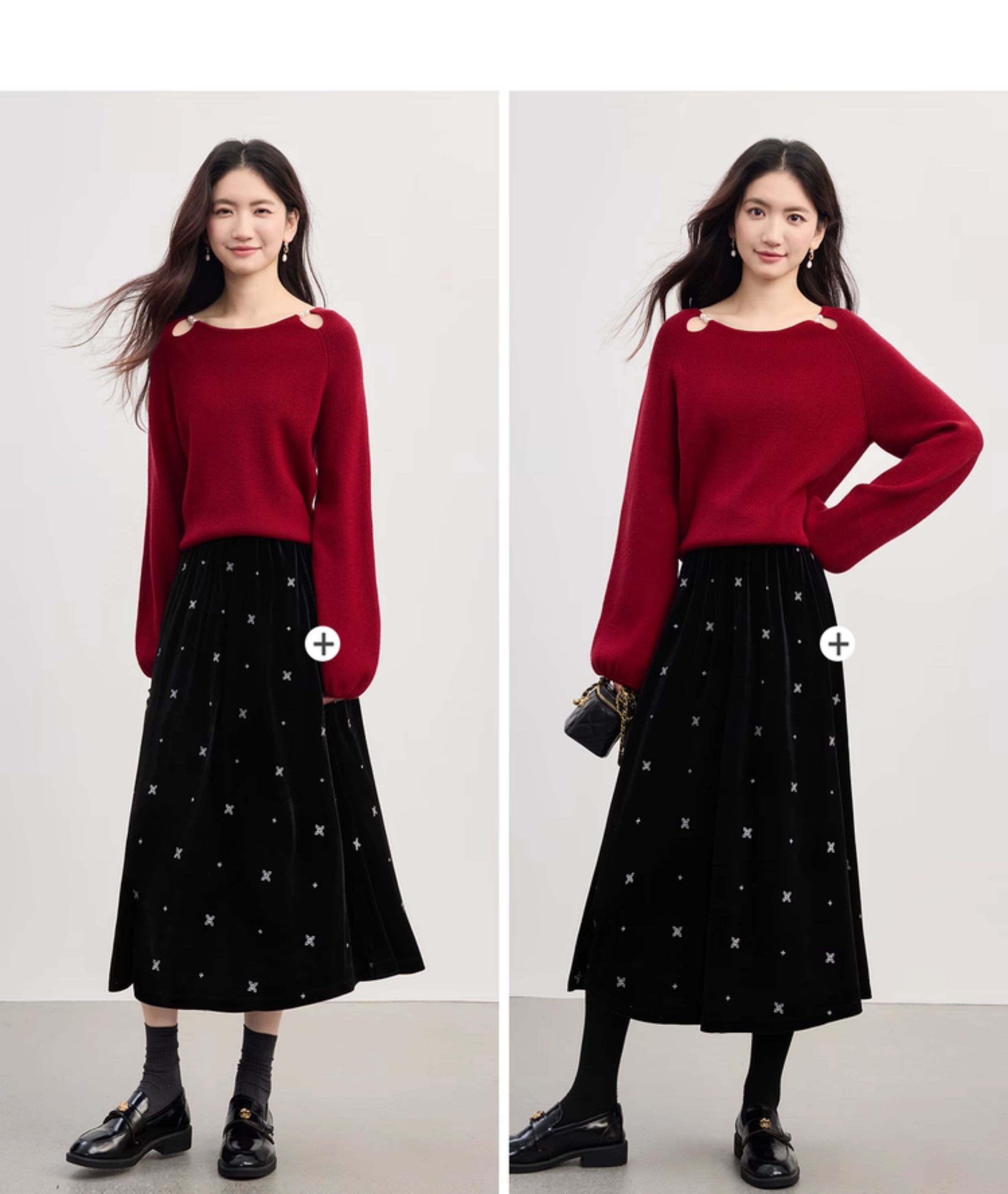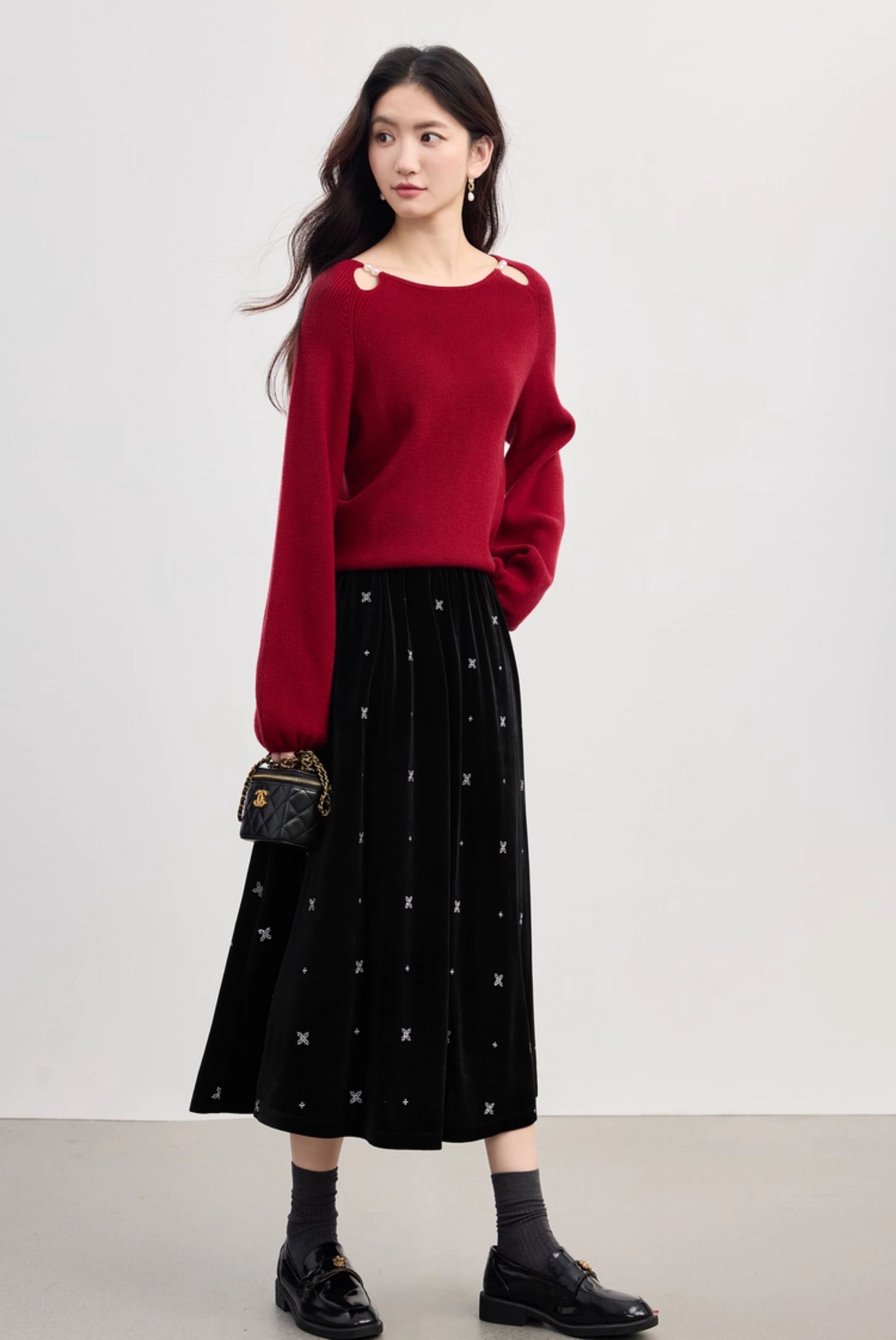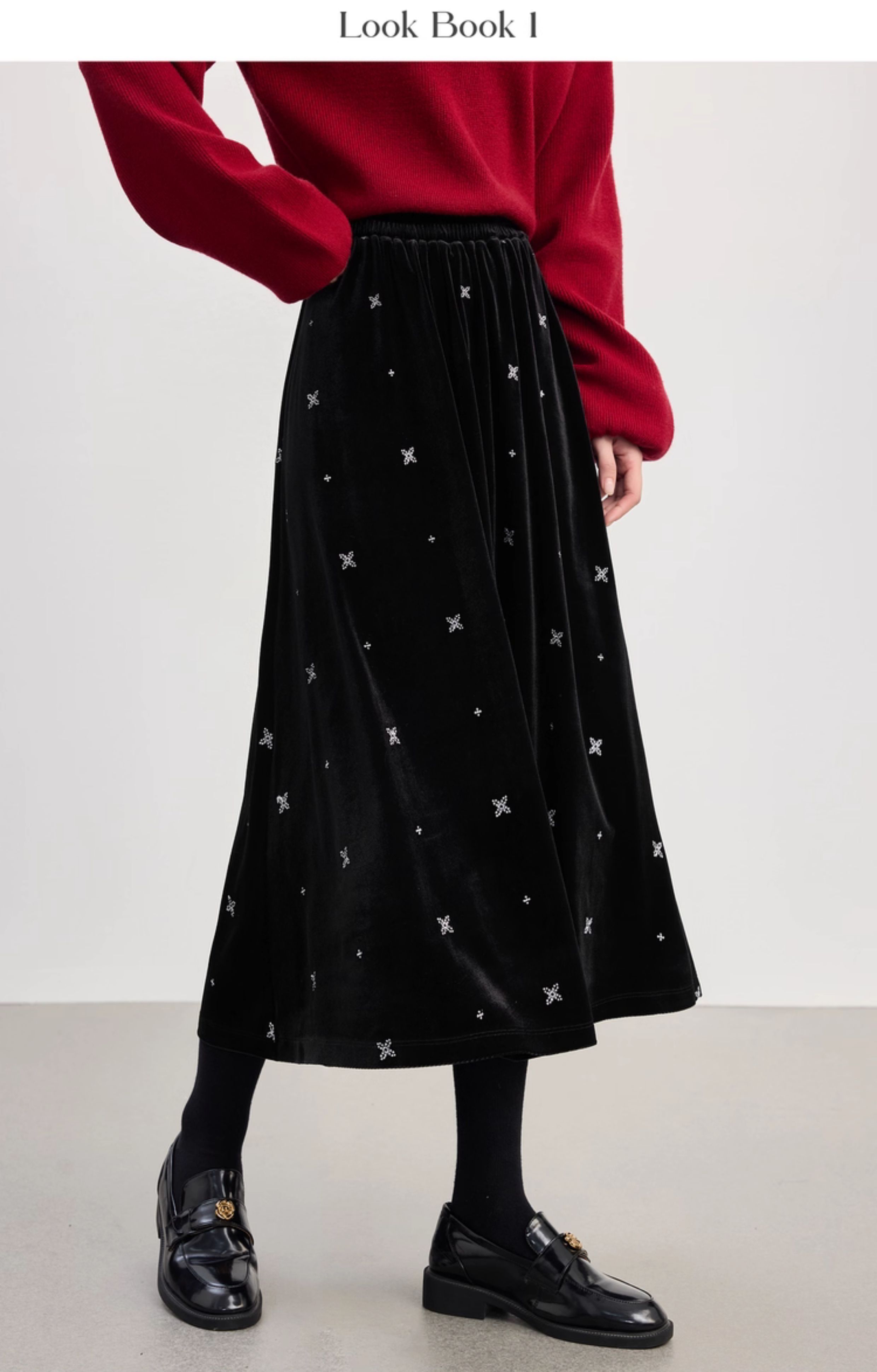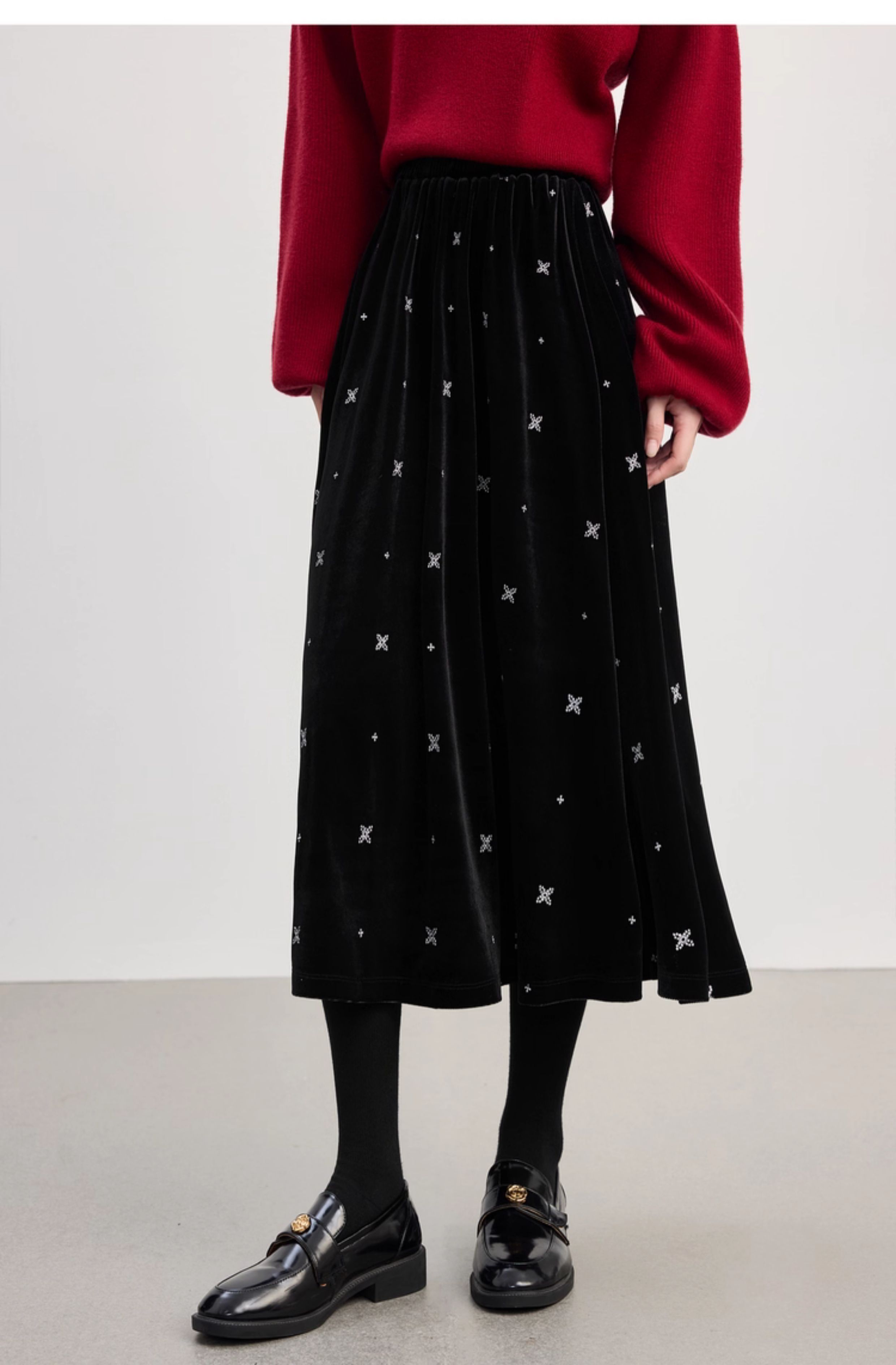 【10/1新品】熙世界赫本风黑金丝绒半身裙女秋冬新款雪花刺绣高腰显瘦a字半裙
