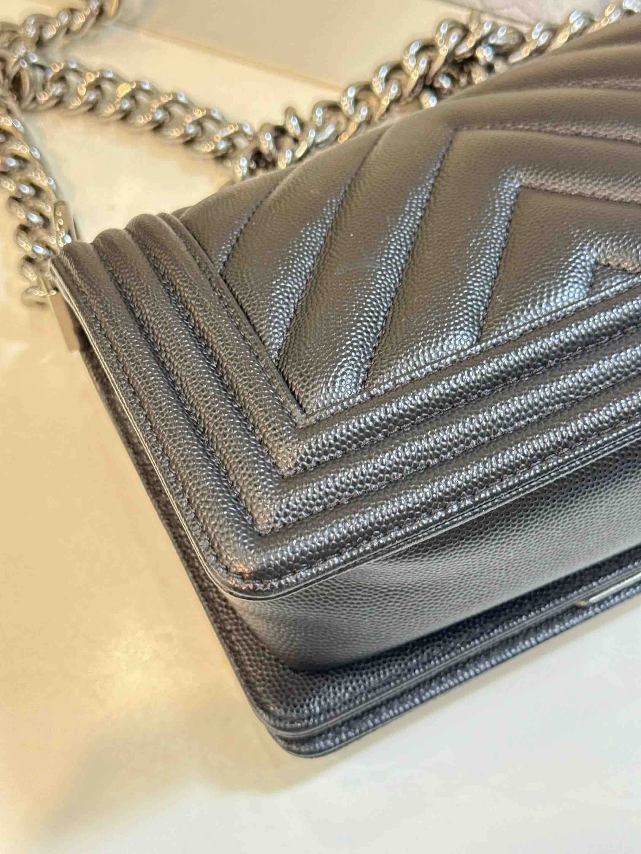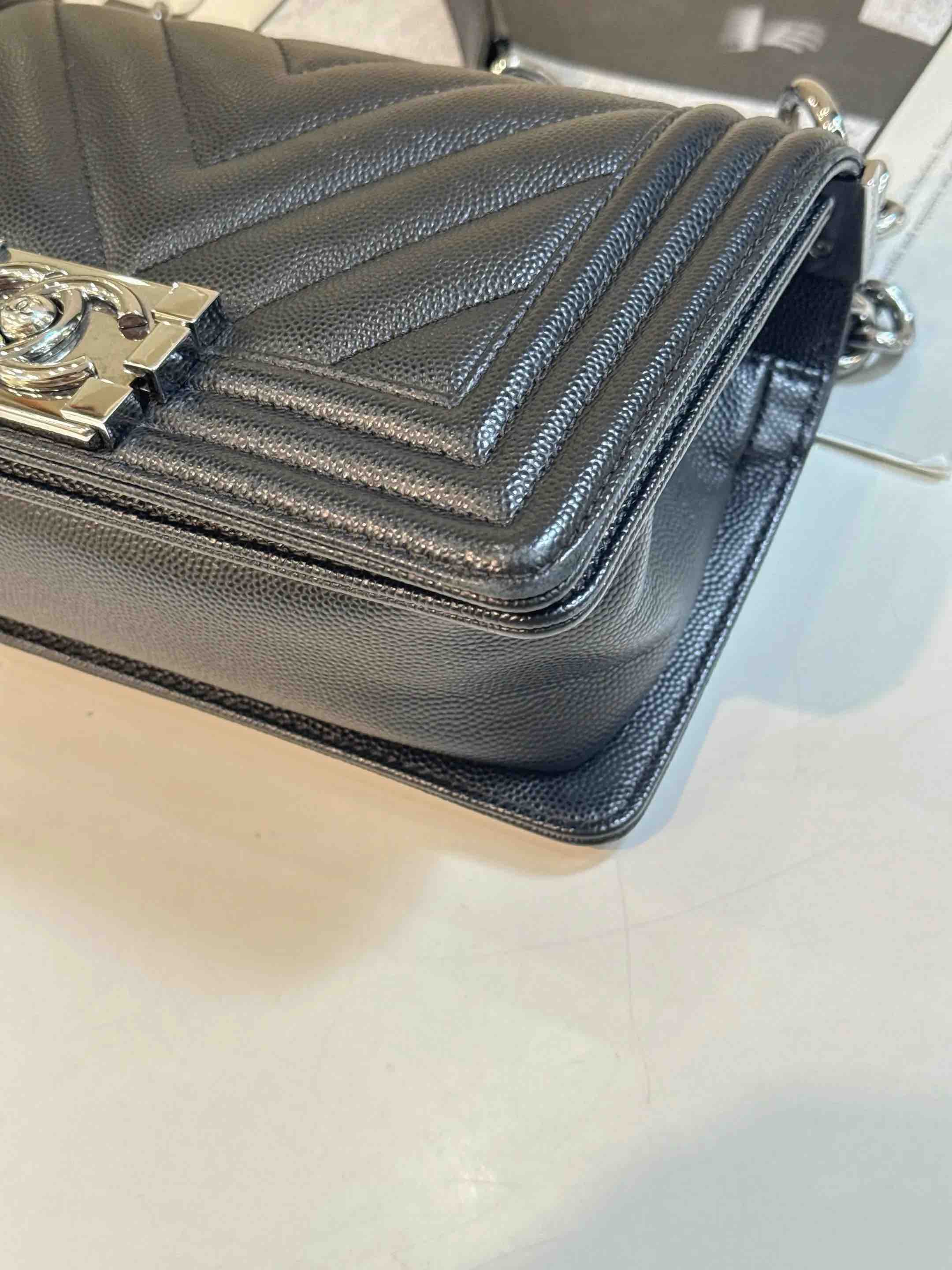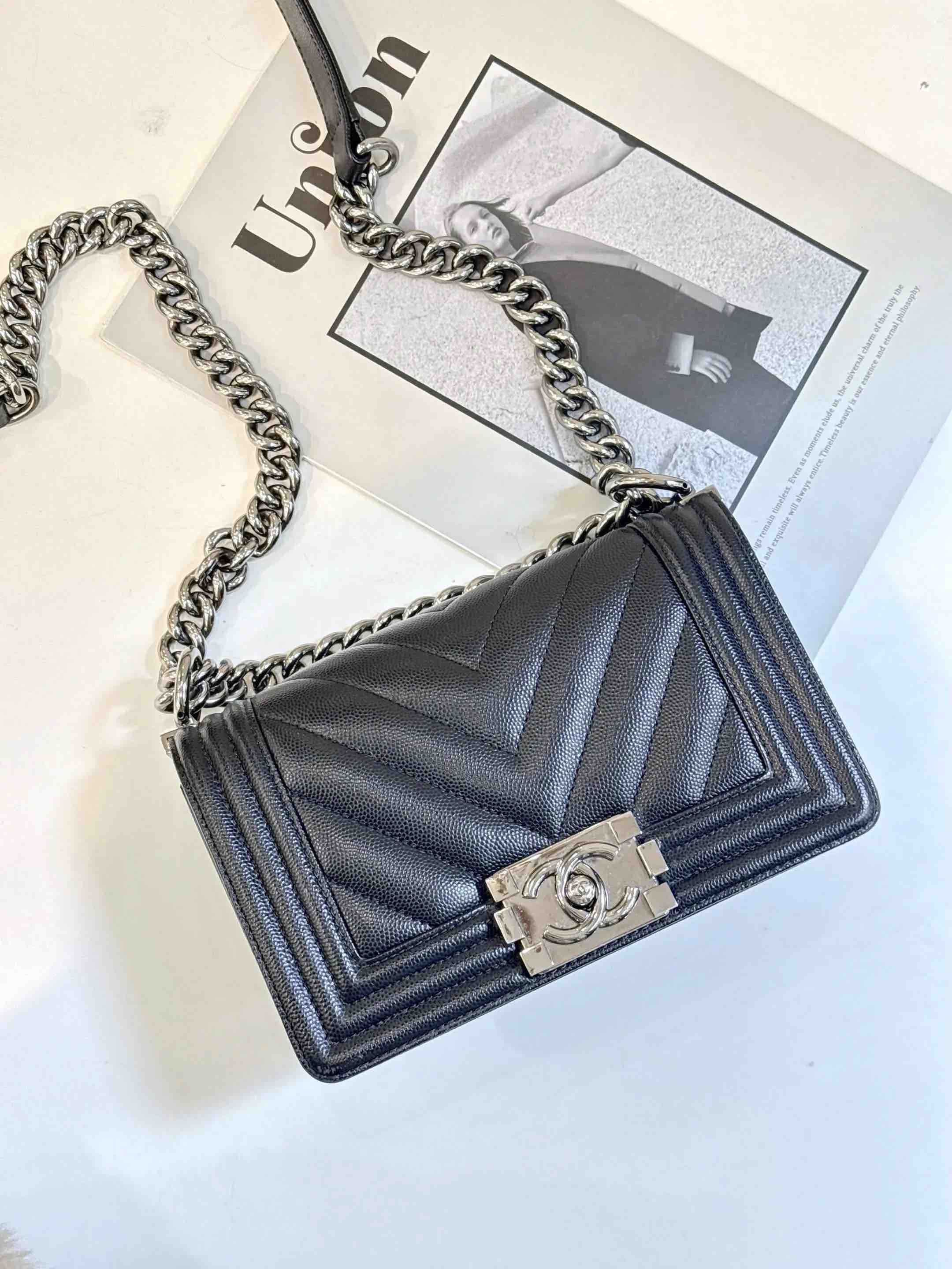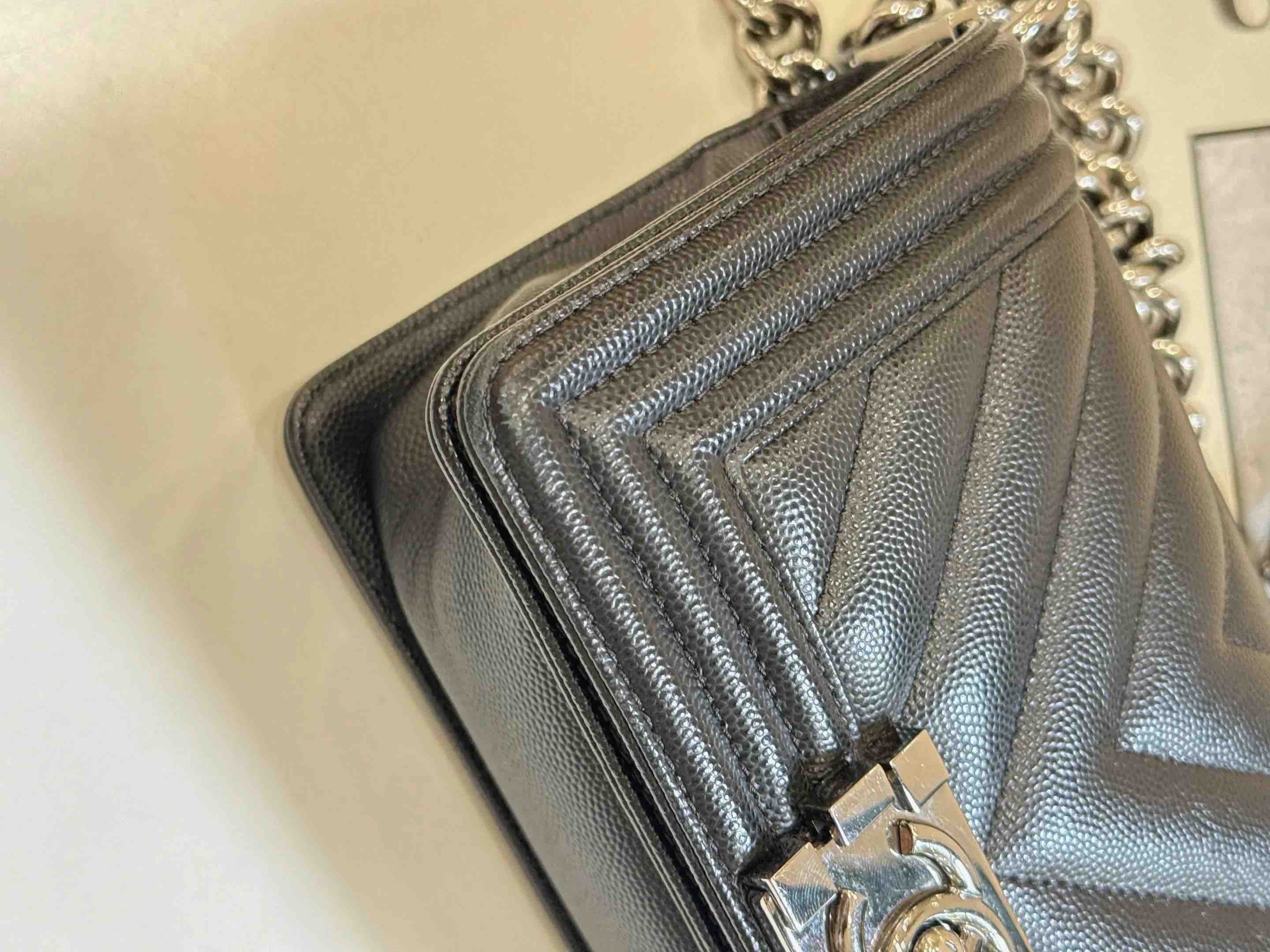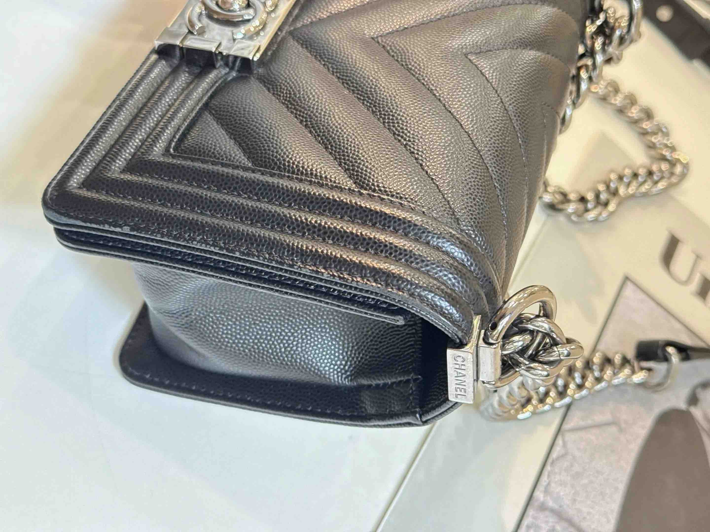 【商品详情】正品二手 CHANEL leboy 小号 V纹 黑银 荔枝纹牛皮 链条包🥳 95新 20*13 镭射25开。边角正常使用感。无敌热门的配皮和尺寸