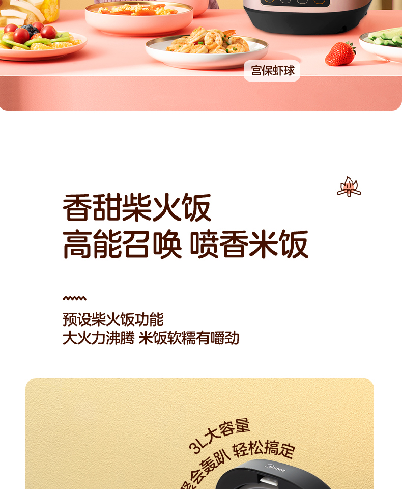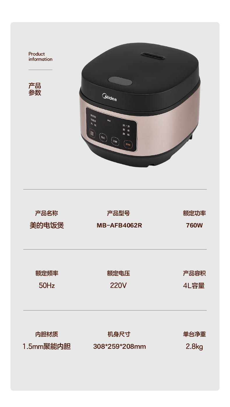 美的 (Midea )电饭煲电饭锅底盘加热智能自动4L不粘锅聚能釜定时预约烧汤烧饭煮粥蛋糕 团购热线:13915599506