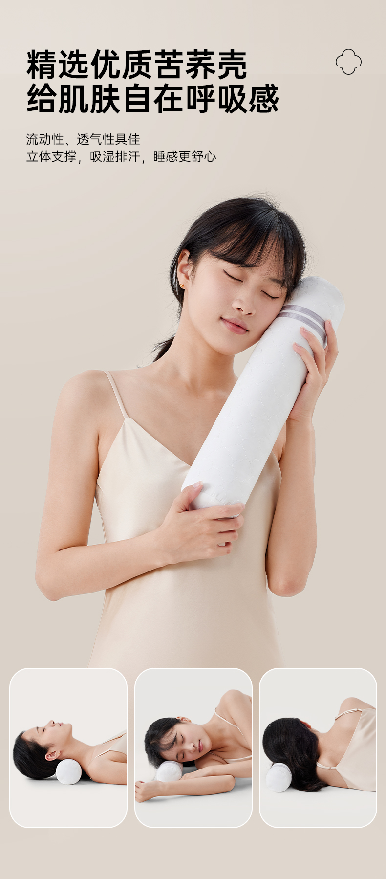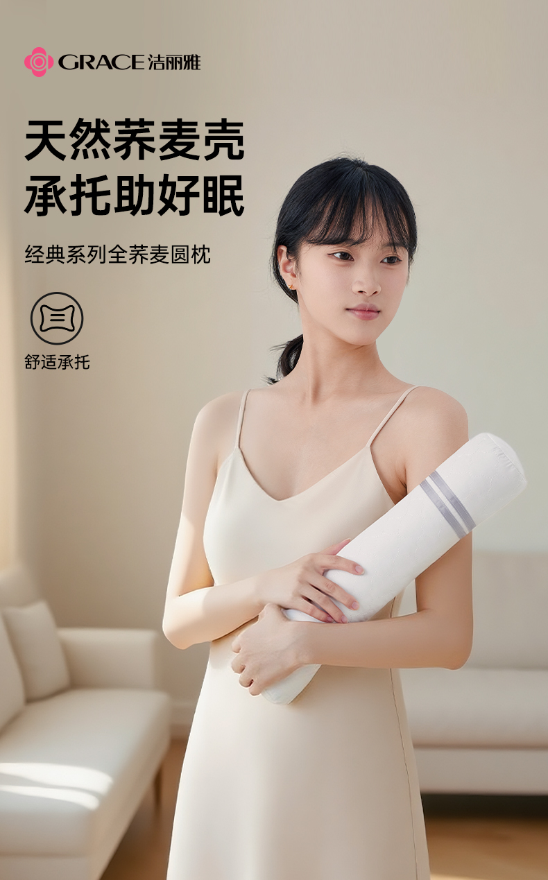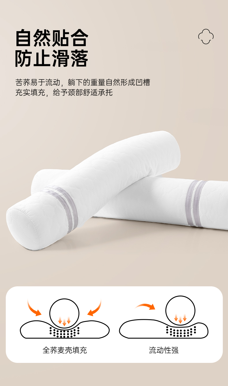 洁丽雅天然荞麦壳圆枕承托护颈椎助好眠成人家用亲肤透气可拆洗