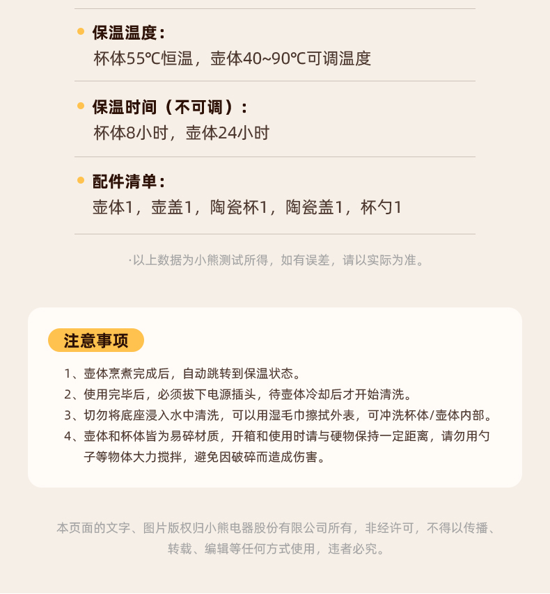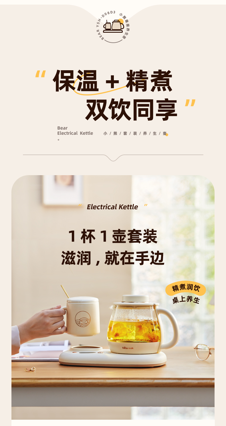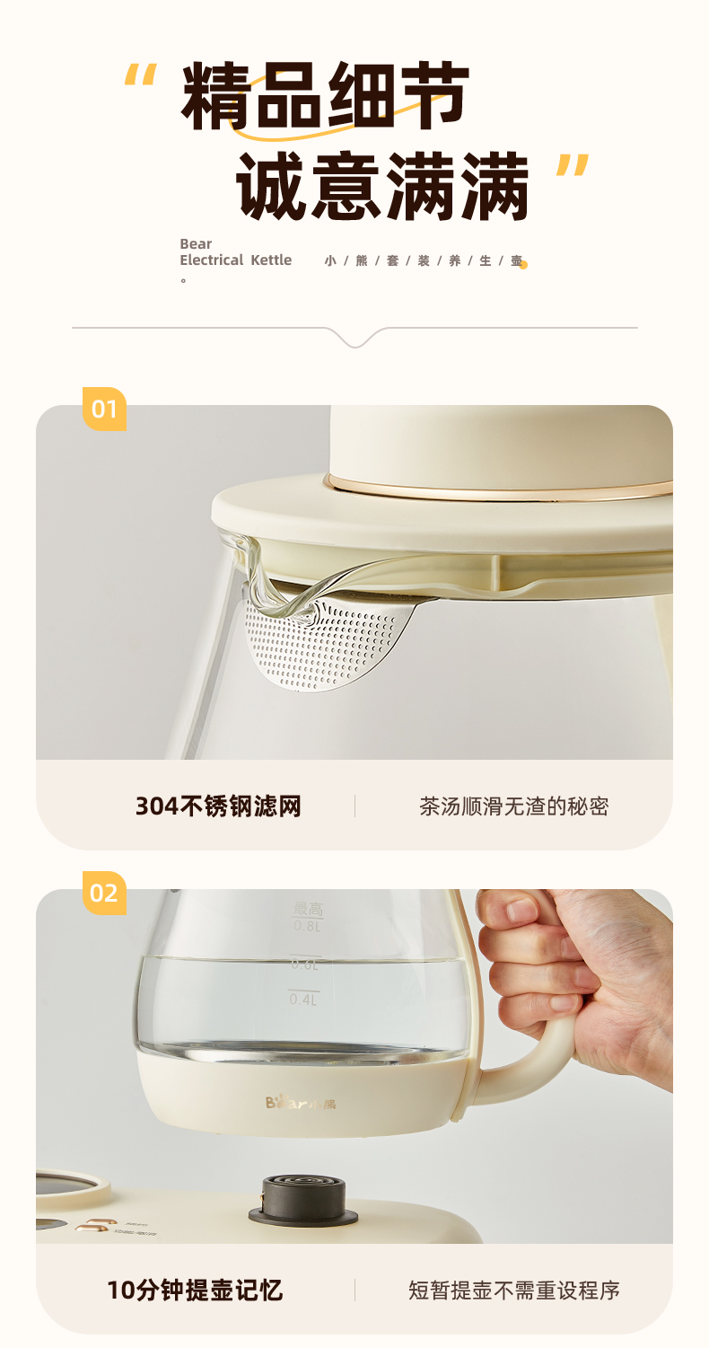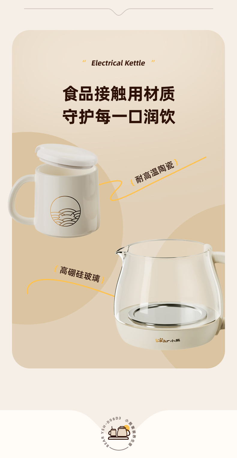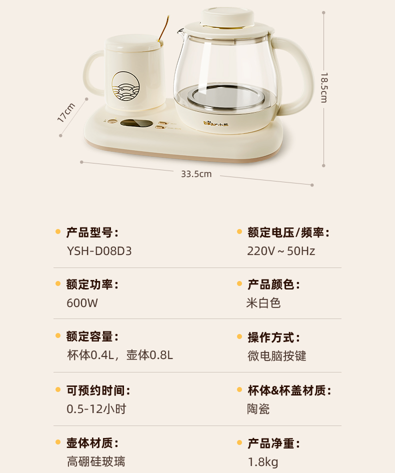【小程序】小熊养生壶 YSH-D08D3 米黄色 壶盖+玻璃壶身+底座+陶瓷杯
