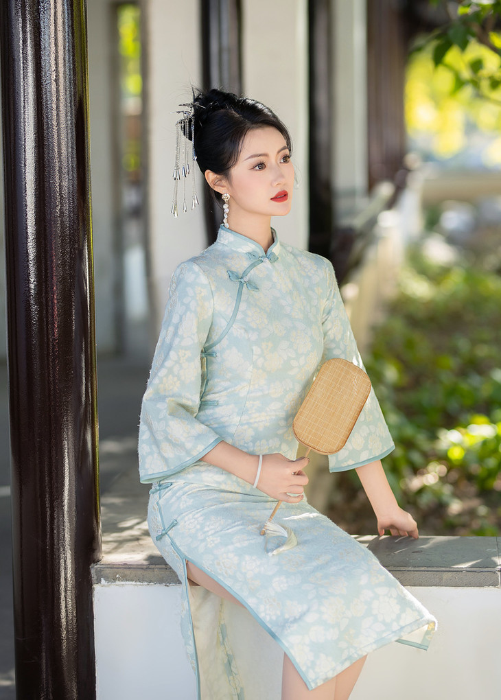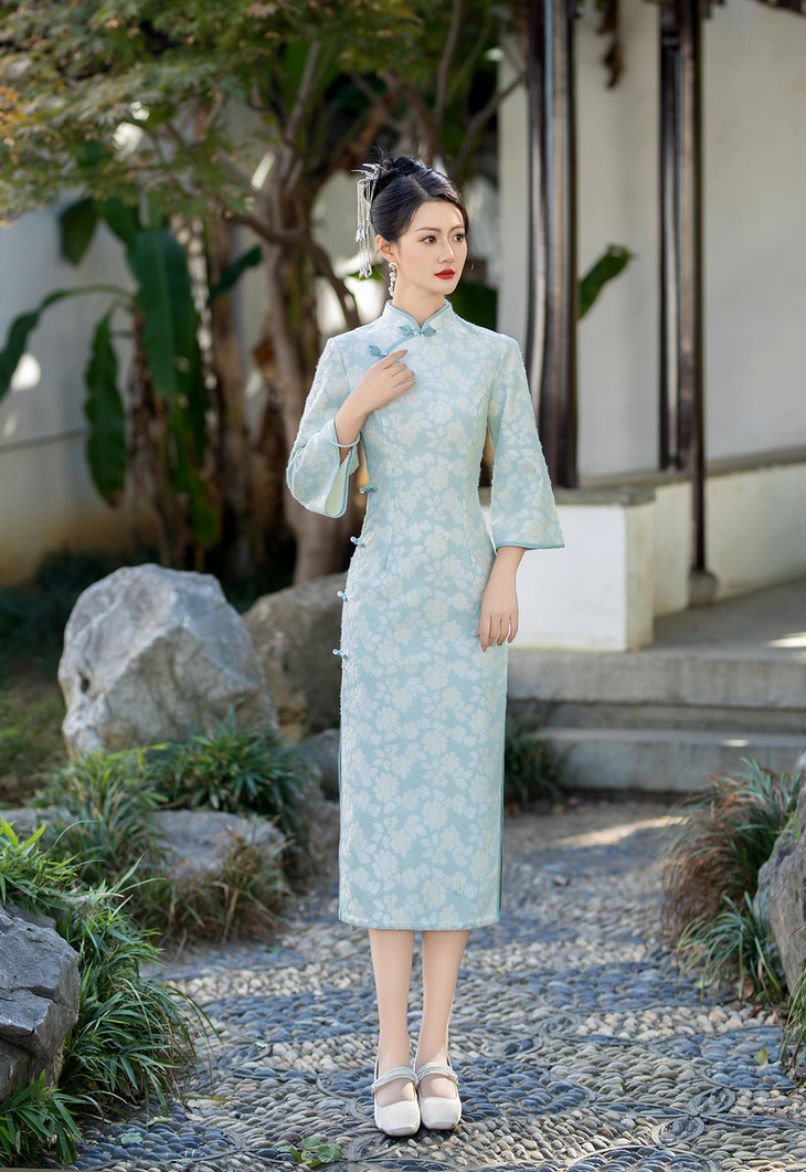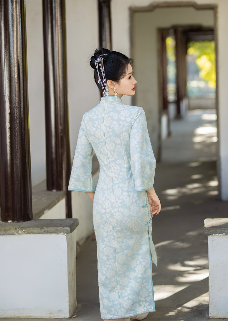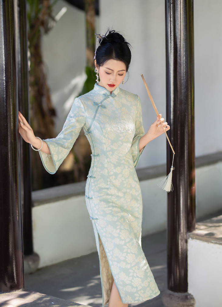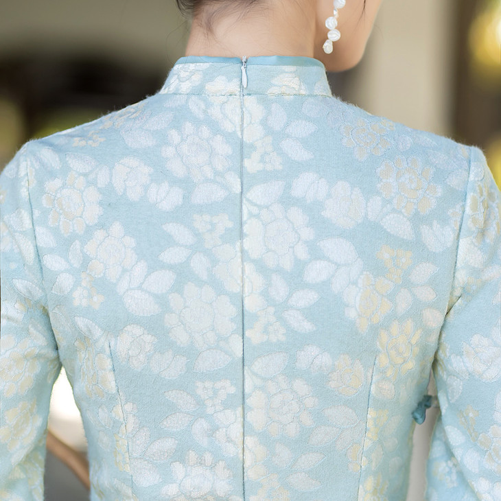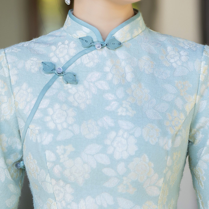 冬季加绒保暖气质年轻羽毛纱时尚淑女倒大袖旗袍ZA5190