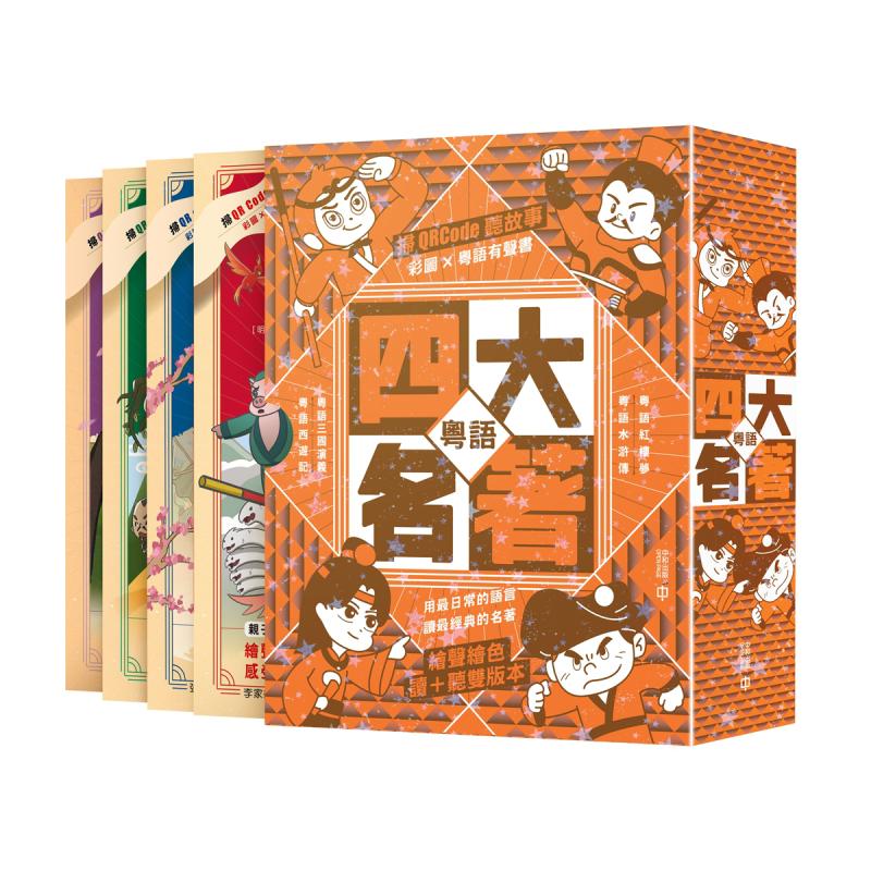 本套裝內容包括《粵語紅樓夢》《粵語西遊記》《粵語三國演義》及《粵語水滸傳》,一套四冊,每冊均選編四大名著中膾炙人口的篇章,改編為親子共讀的粵語版本,並請來專業播音員聲音演繹,成為既有文字及插圖,又有獨立音頻的親子讀物,是適合家長與子女一起讀文本、聽音頻的床邊故事書。