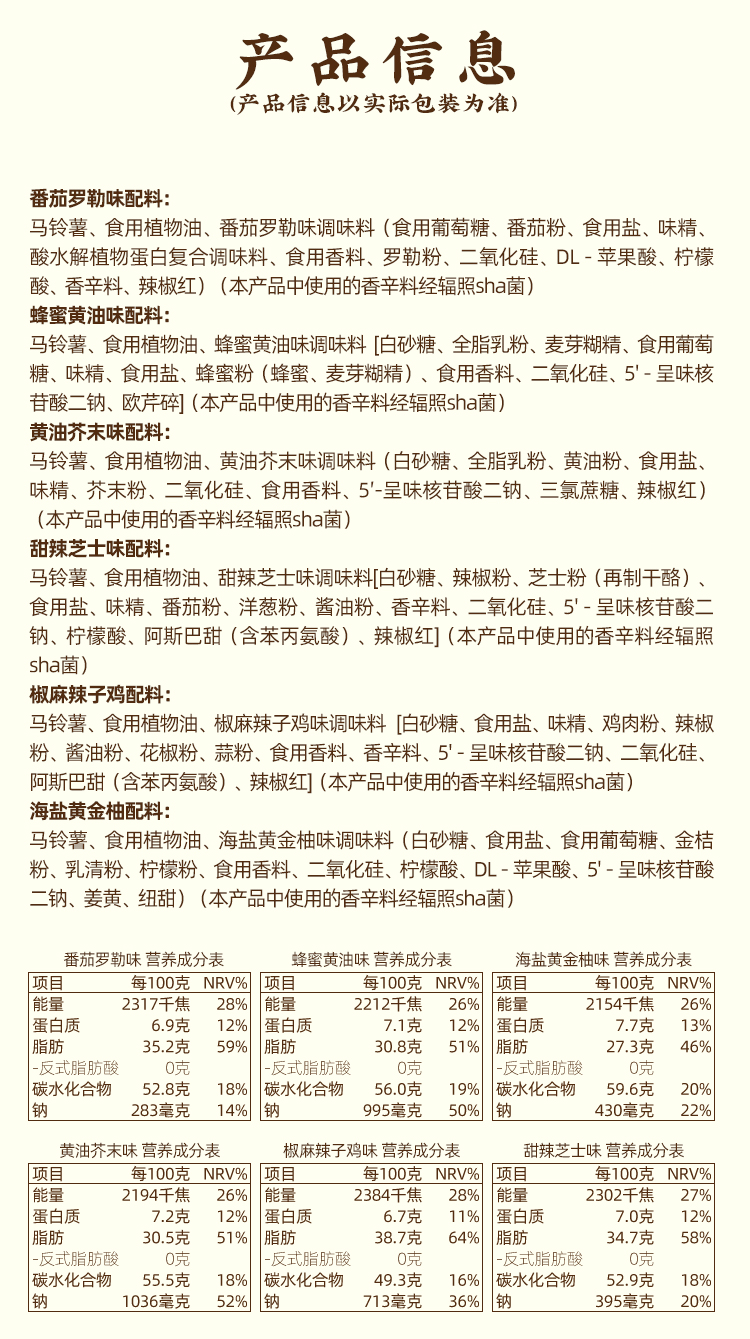 口味:蜂蜜黄油味、甜辣芝士味、黄油芥末味、番茄罗勒味、海盐黄金柚味、椒麻辣子鸡味