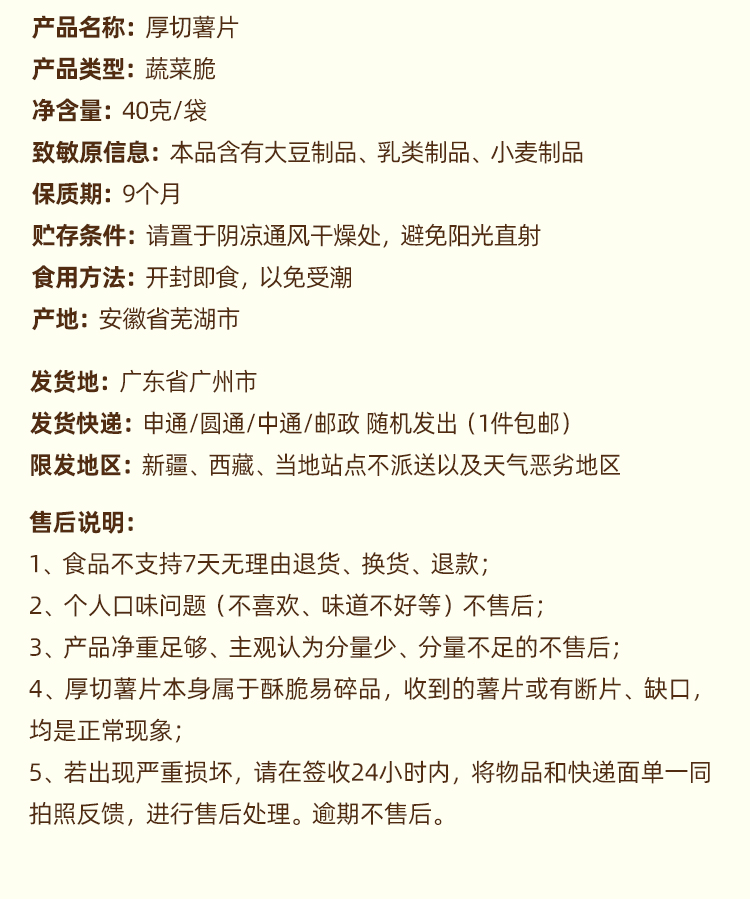 4、厚切薯片本身属于酥脆易碎品,收到的薯片或有断片、缺口,均是正常现象;
