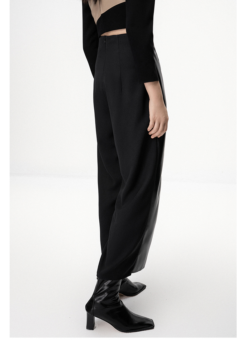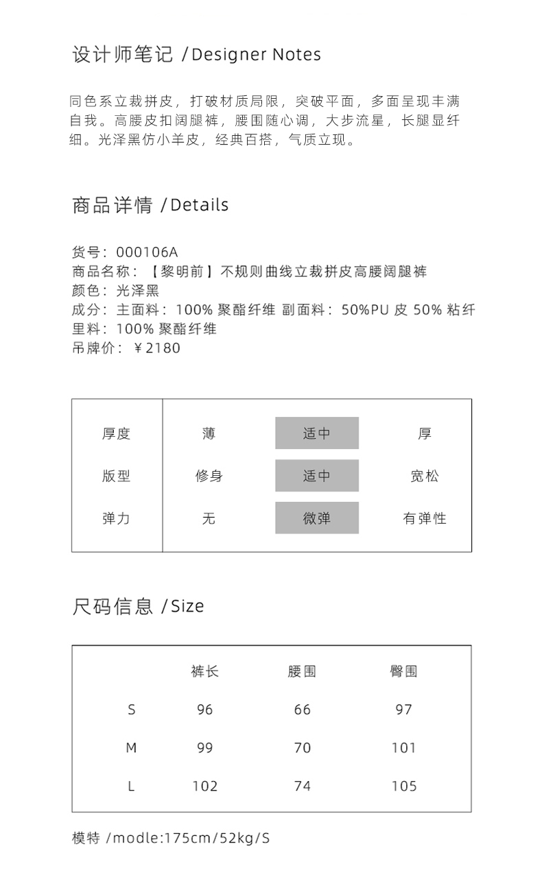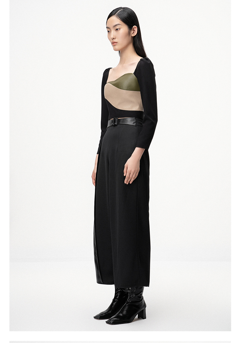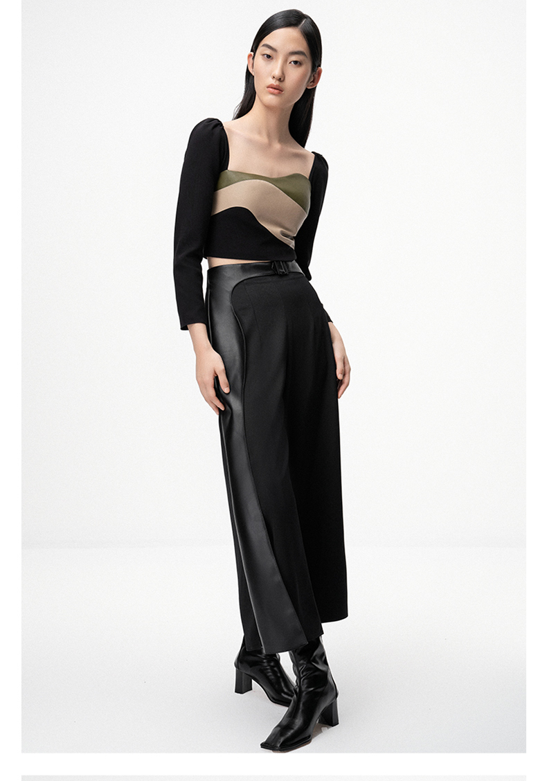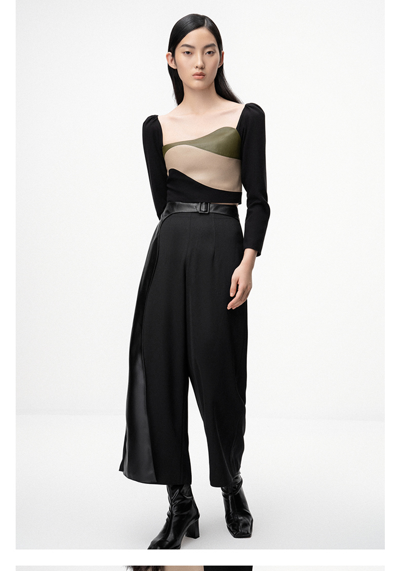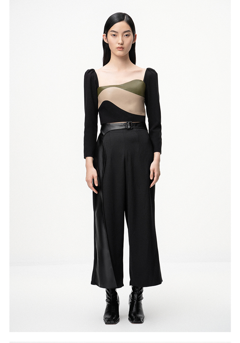 【黎明前】光泽黑不规则曲线立裁拼皮高腰阔腿裤/ 000106A