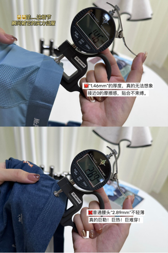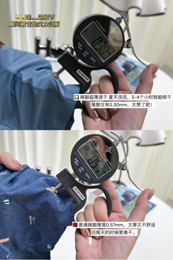测试③超薄速干✅夏天洗完,3~4个小时就能晾干, 面料薄度仅有0.3mm,只有普通棉内裤的一半,哇~接口处更是突围的优秀!