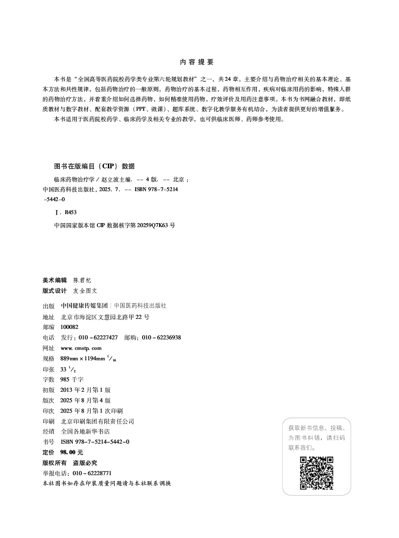 临床药物治疗学 第4四版(全国高等医药院校药学类专业第六轮规划教材)赵立波 供药学 临床药学及相关专业用 中国医药科技出版社