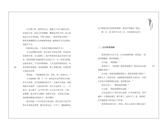 这是一部革命历史题材的儿童长篇小说,作品没有从正面描写战争,而是通过两个小红军不同寻常的经历,从一个侧面展现了长征这一伟大的征程中,两位少年所经历的磨难、洗礼以及精神上的成长。在作者笔下,长征精神不只是空泛的口号,更有丰富的内涵,这对新时代的孩子仍然有着不可忽视的指引意义。作品通过一个个精彩的英雄故事的文学呈现,潜移默化地在孩子们的精神世界中注入红色基因。