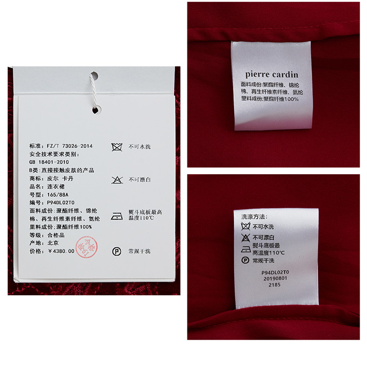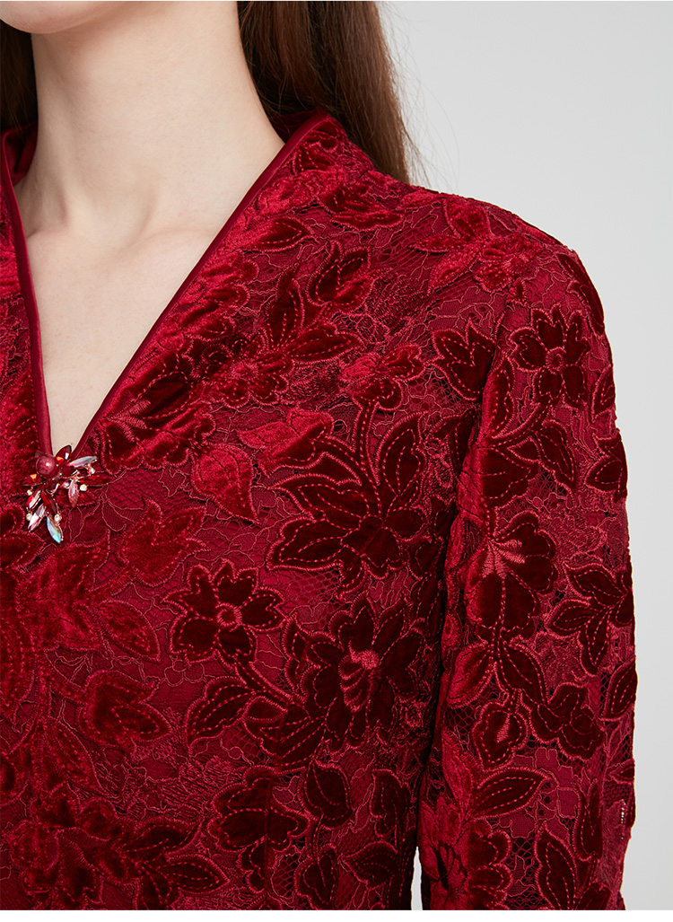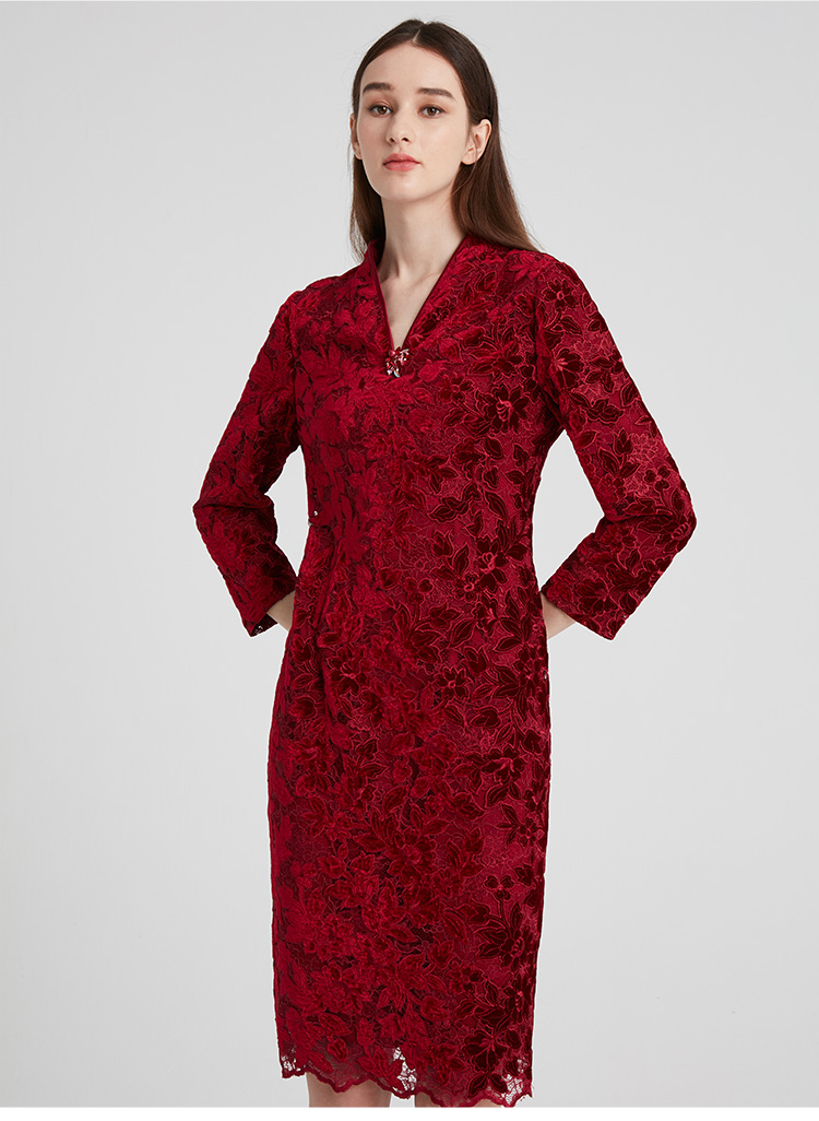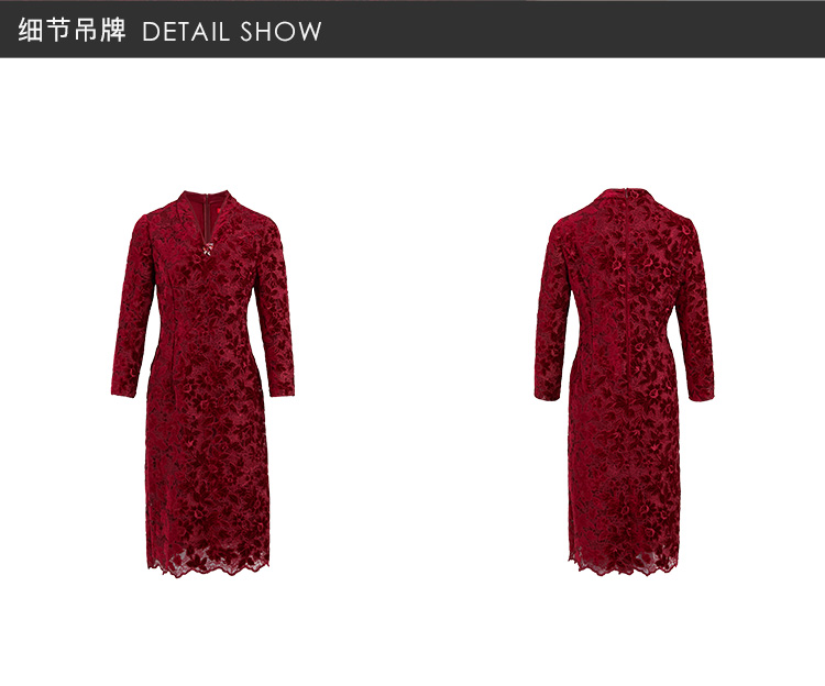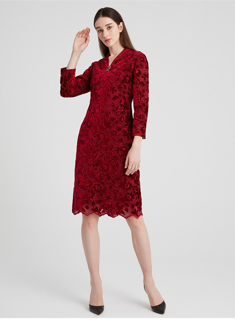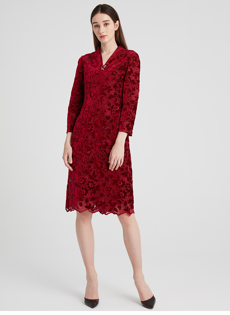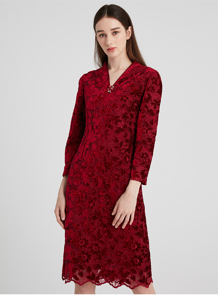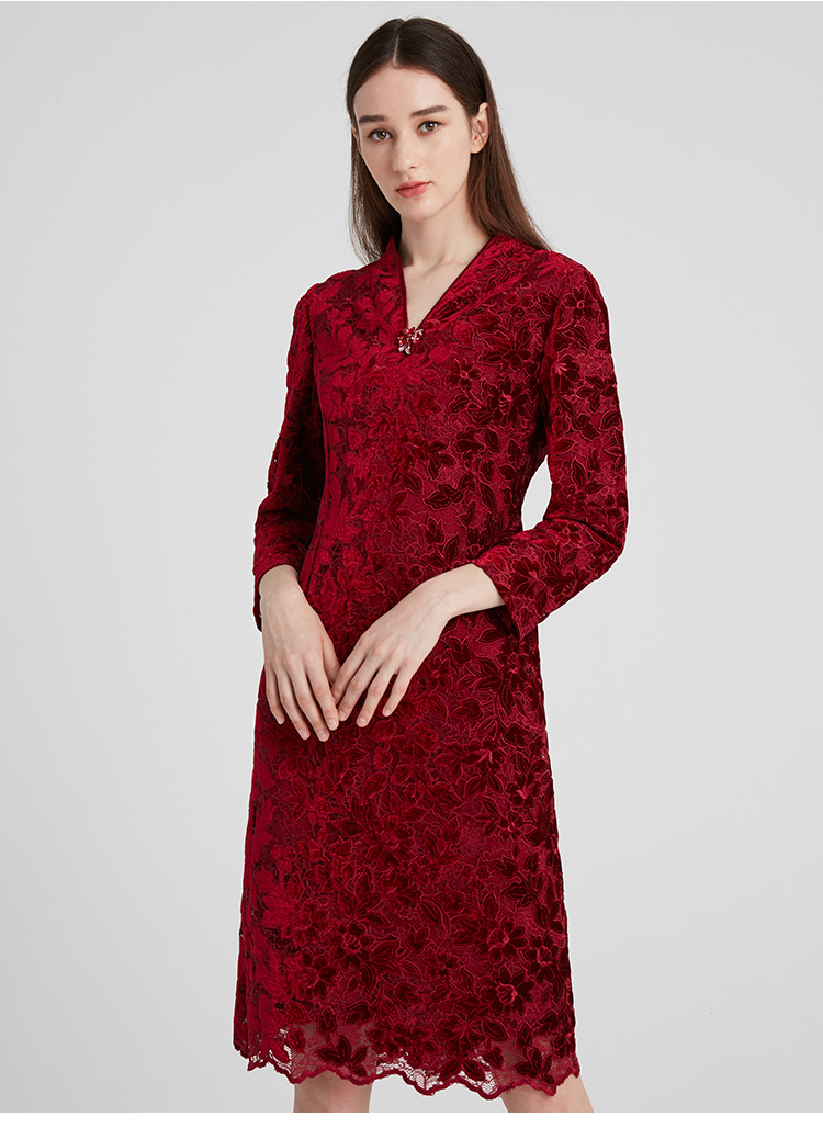 皮尔卡丹女秋季新款酒红色V领长袖连衣裙花边蕾丝裙P94DL02T0