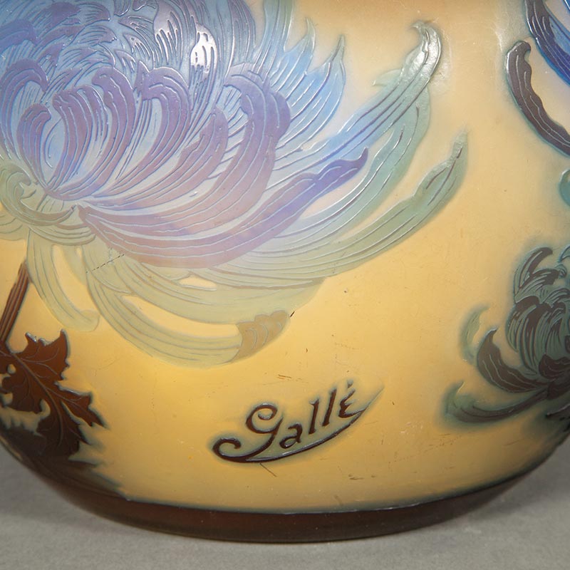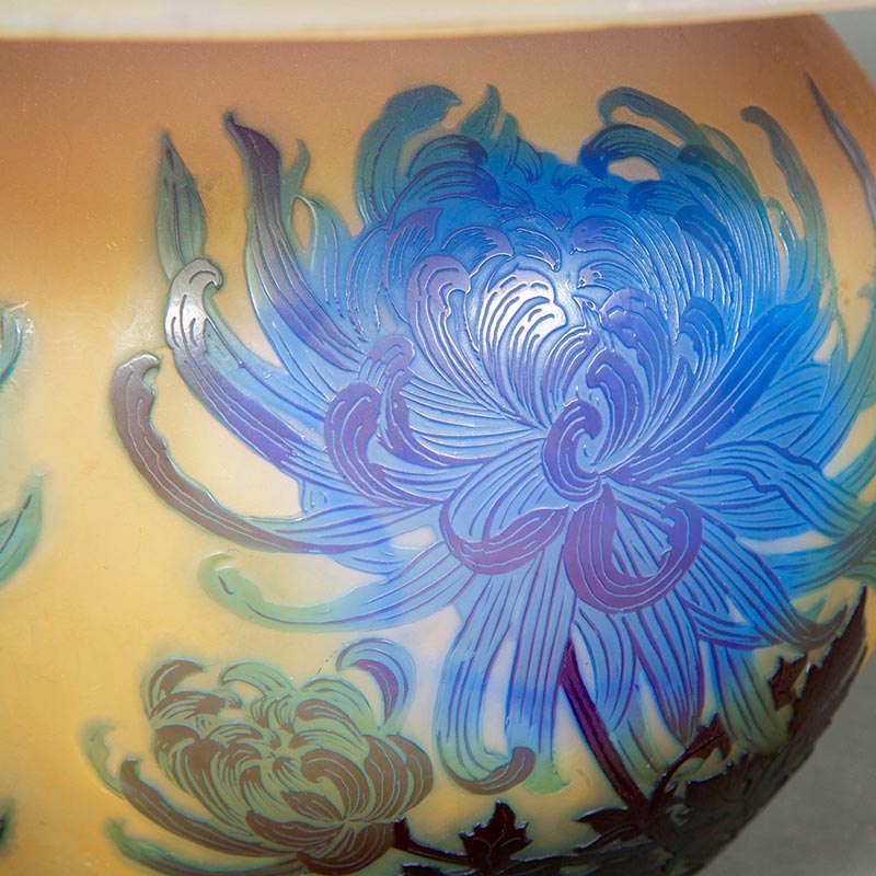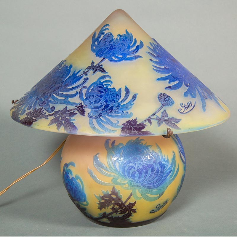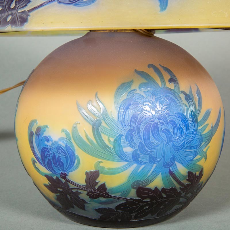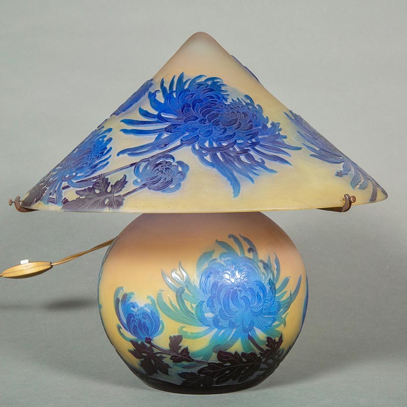 20世纪初法国新艺术时期南锡派艺术家Émile Gallé签名创作蓝菊花主题浮雕玻璃台灯