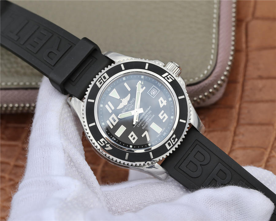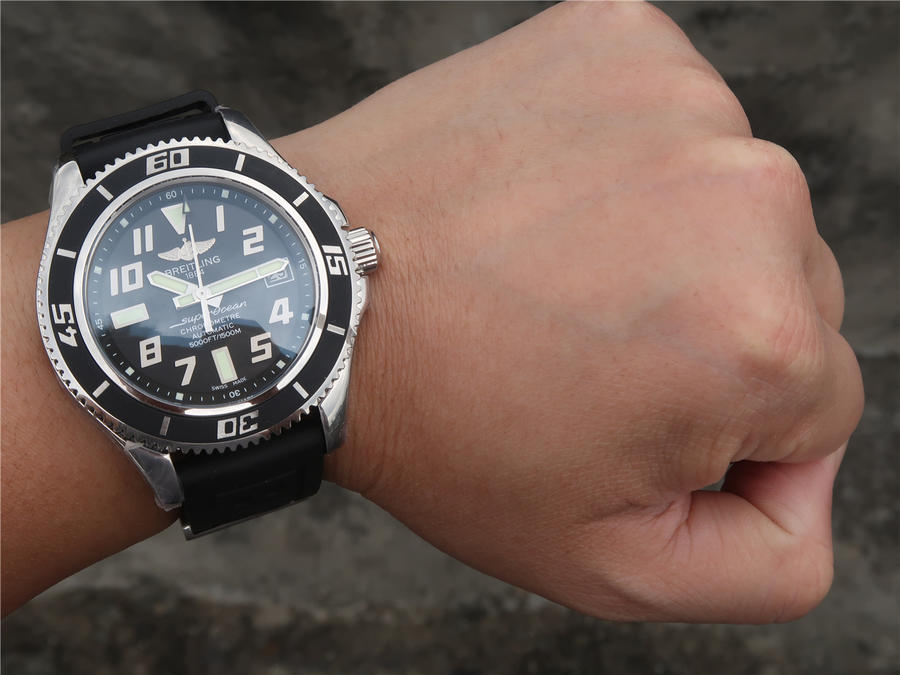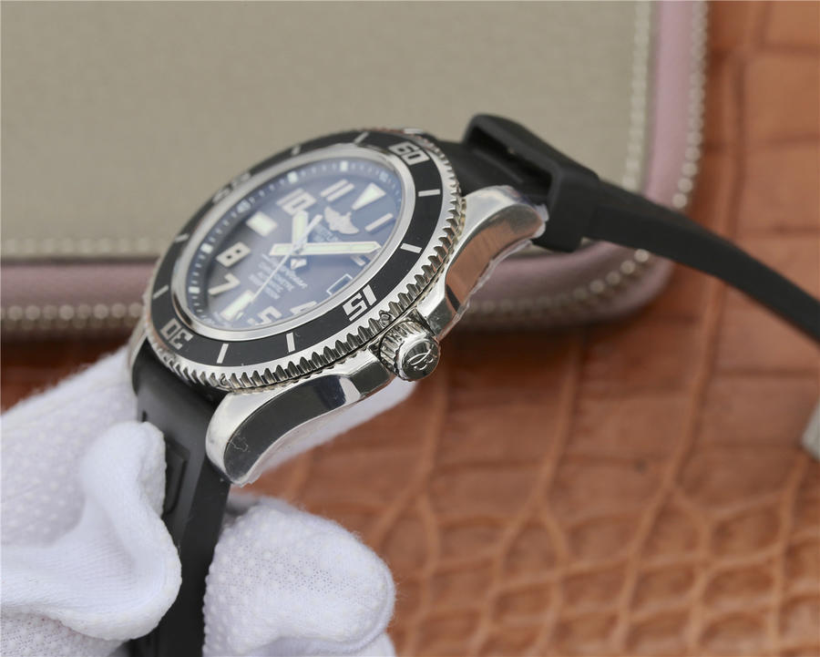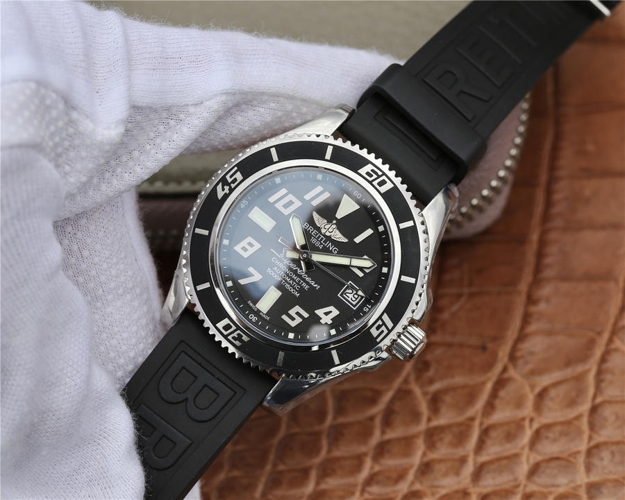 GM百年灵SUPEROCEAN42超级海洋42腕表系列海洋42腕表(Superocean42)将绚丽色彩大胆运用在分钟刻度斜角内圈,