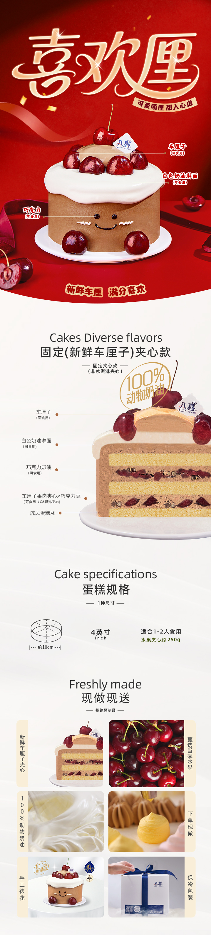 ※【喜欢厘】4英寸 新鲜车厘子生日蛋糕 不含冰淇淋