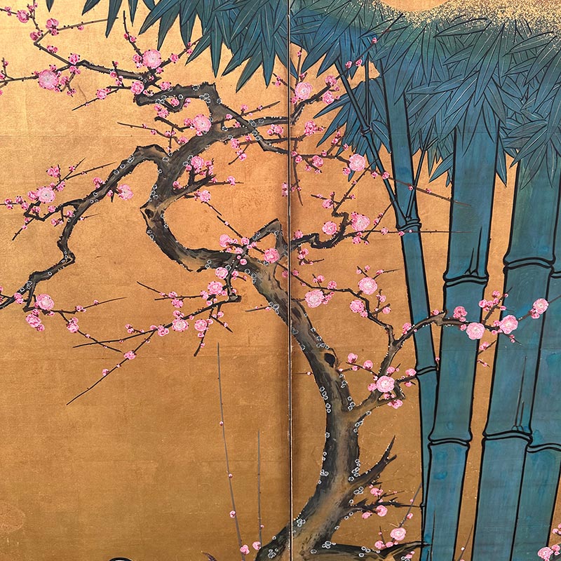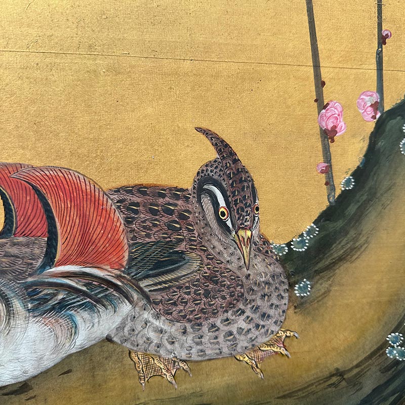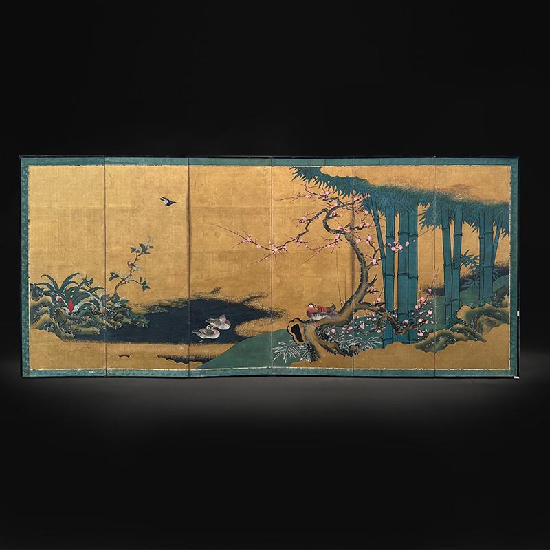 19世纪日本江户时代出品「竹梅鸳鸯」主题金地纸本设色六曲屏风