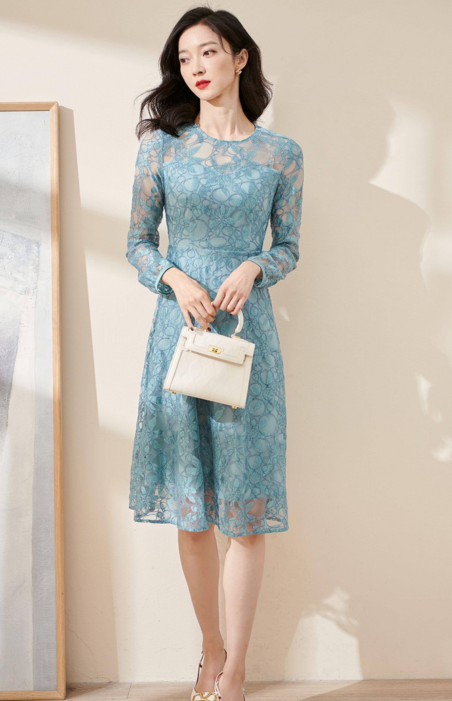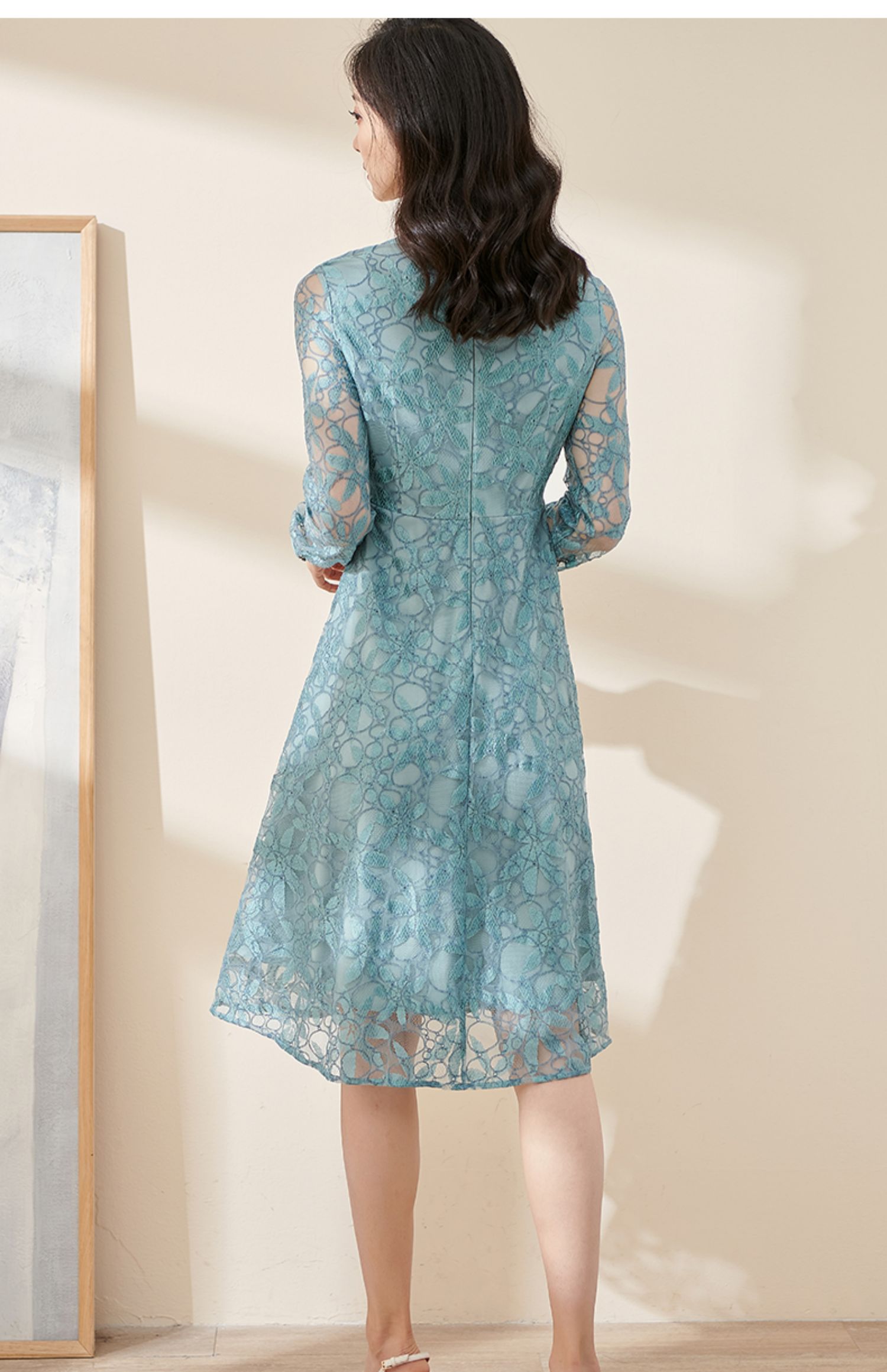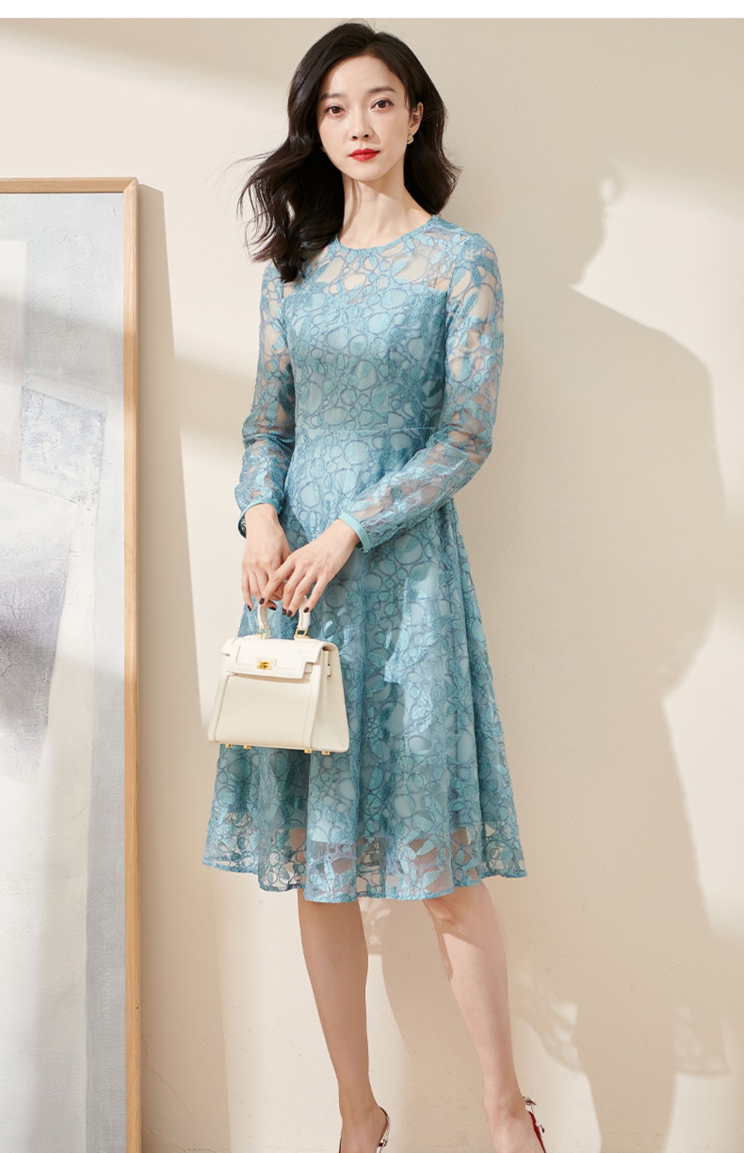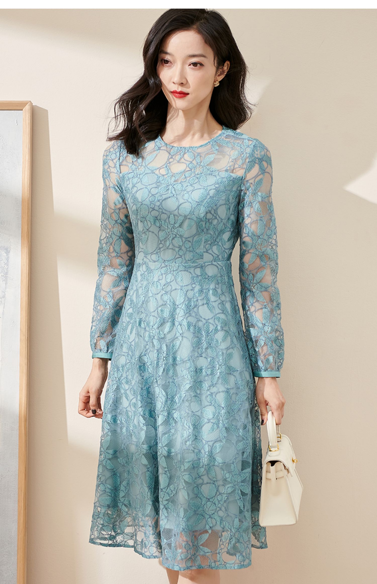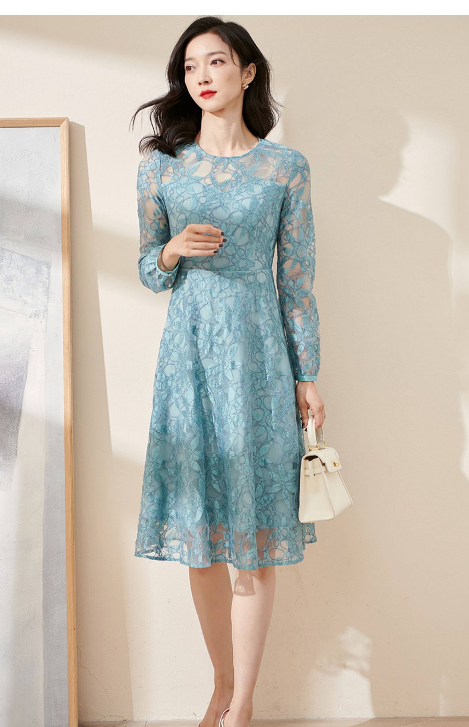 剩S/L/XL 米思阳2026春季新款温柔淑女大摆连衣裙勾花镂空优雅蕾丝裙0077