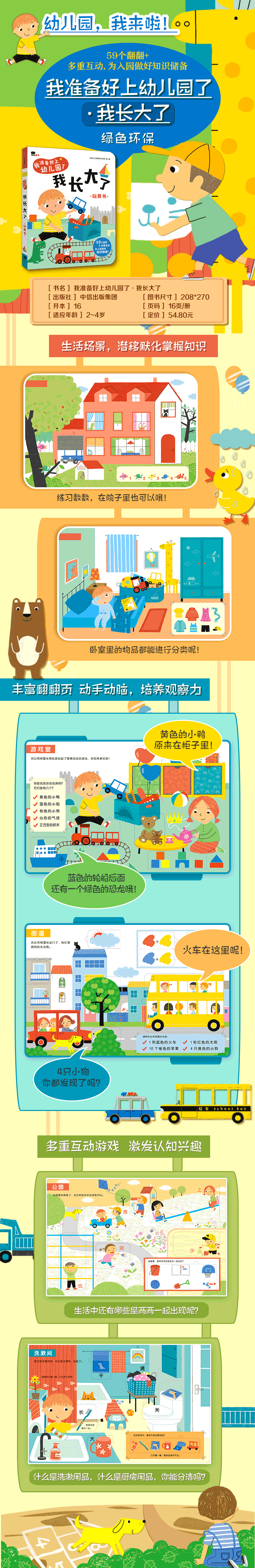 本书专为即将入幼儿园或者刚入幼儿园的孩子精心设计,玩具书通过花样翻翻、抽拉、转盘等多种工艺,将形状、颜色、数字等幼儿园必备知识以及孩子幼儿园需要做好的心理准备和丰富的活动融合,为孩子做好知识和心理准备。游戏书则通过涂色、剪贴、贴纸、迷宫等多种形式让孩子掌握入园必备的基本技能,为孩子轻松入园做好准备。