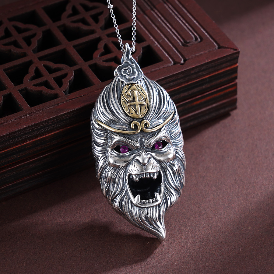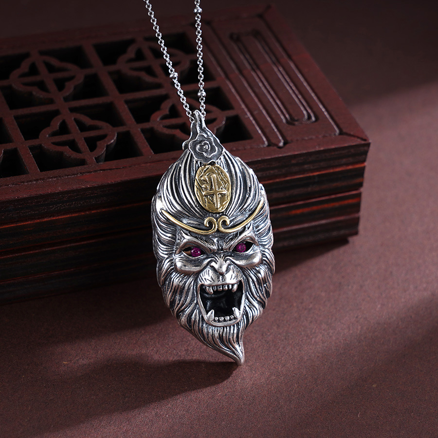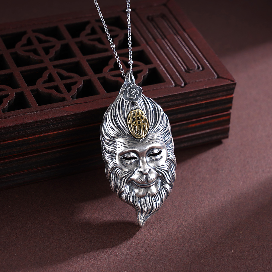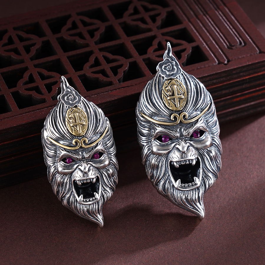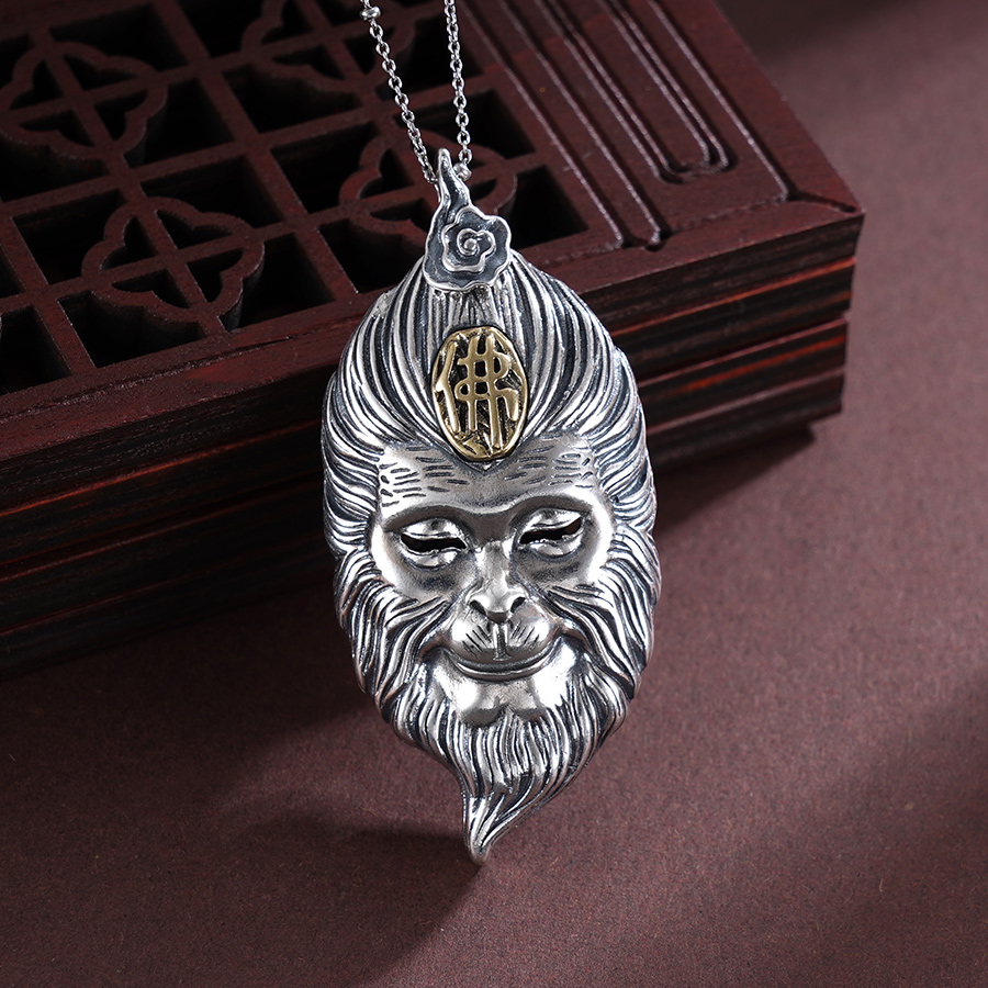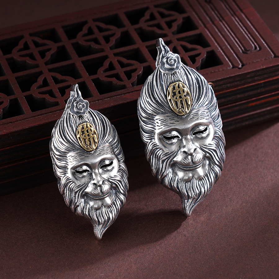【寓意】:银艺铸就力与美,东方韵味显神威。作品源自“黑神话”悟空原型,应用錾刻工艺梳理大圣毛发,纤毫毕现;糅合仿古工艺渲染着色,栩栩如生。寓意悟空护体,所向披靡。