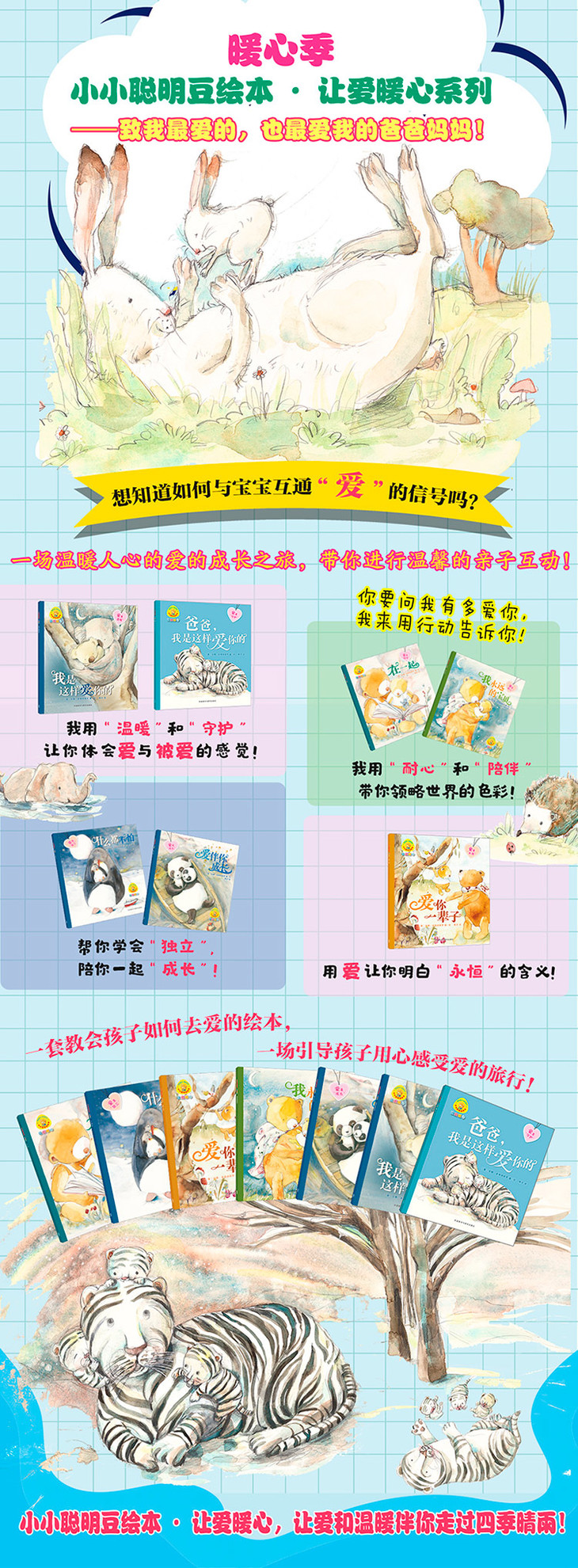 《-爱伴你成长》讲述了在绿绿的森林里,熊猫皮普问妈妈,自己什么时候能长大。妈妈告诉他,他一直在慢慢地长大。还记得皮普小时候,他的脚丫是那么小,一张小毯子就能盖住他的全身……世间万物日新月异,而妈妈对宝贝的爱生生不息。